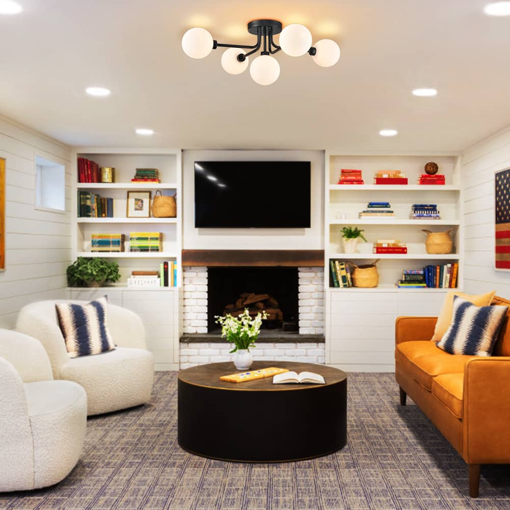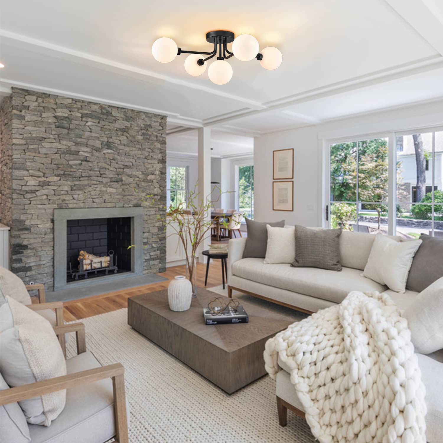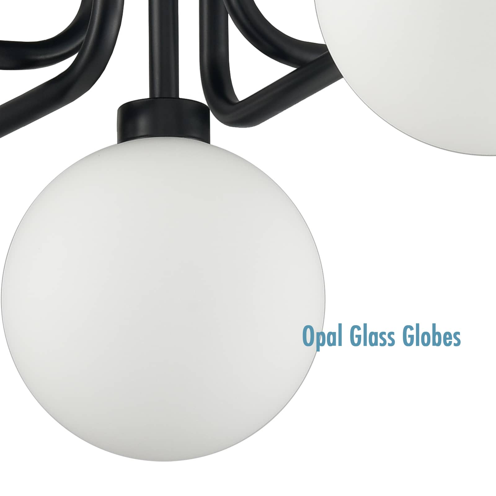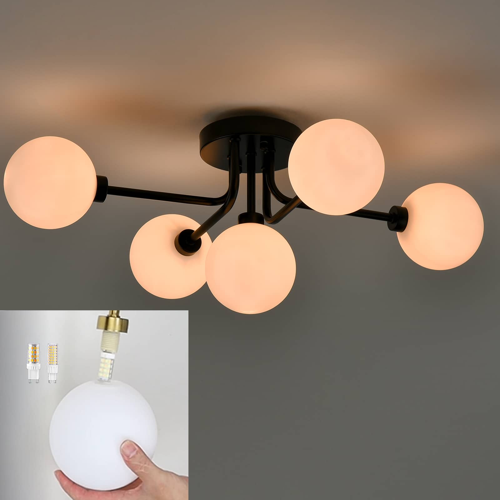 The industrial semi flush mount ceiling light’s canopy, arms, and lamp-holders give your living space a touch of urban sophistication with a black finish. Crafted from impurity-free hand-blown opaque opal glass, the ceiling light provides the perfect blend of mid-century classic and contemporary elements. Four out of five glass shades are supported by gracefully curved arms and extend outward in every direction to encircle the one in the middle.