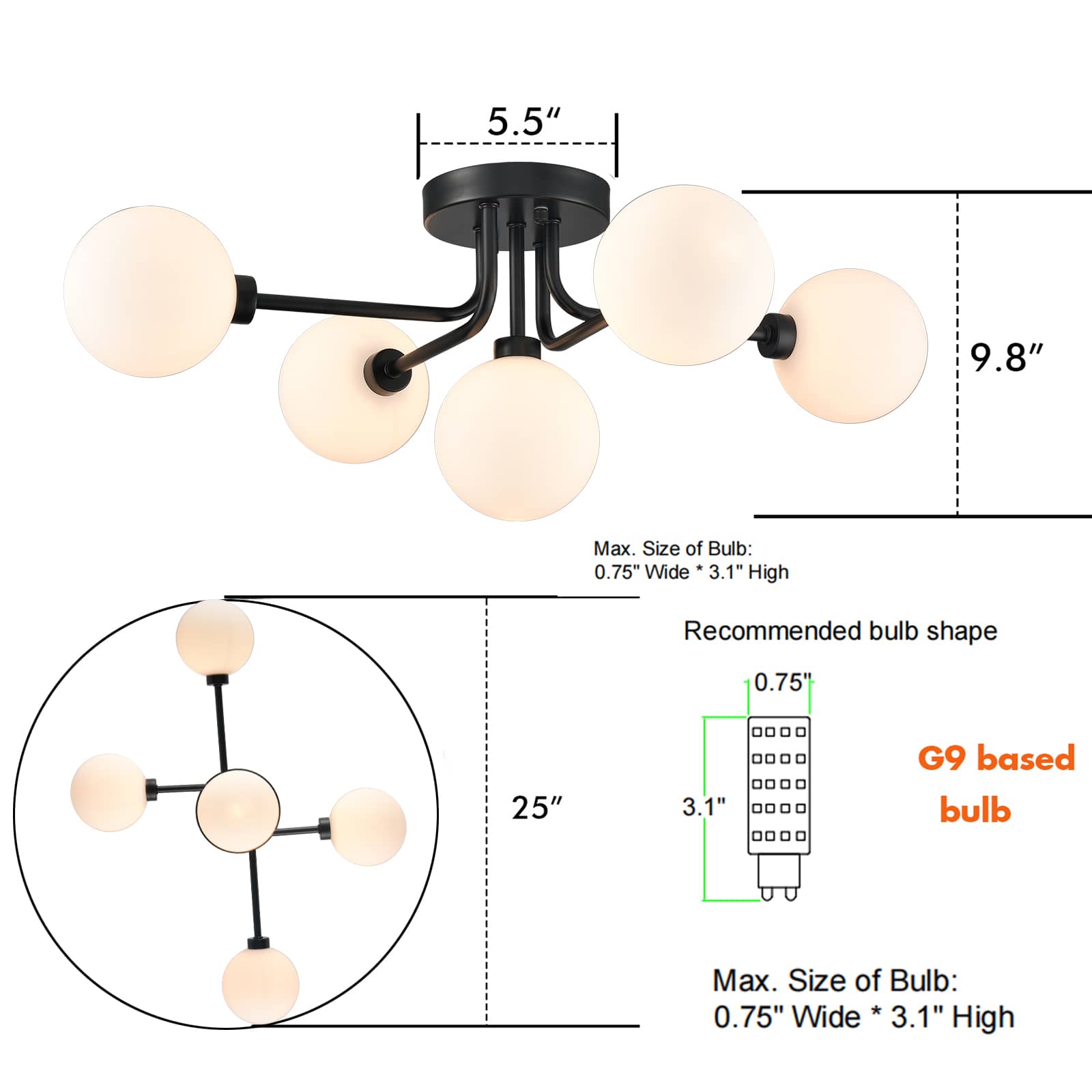 The ceiling light comes with five G9-base sockets which are compatible with a variety of bulb types: LED, INCANDESCENT, CFL.