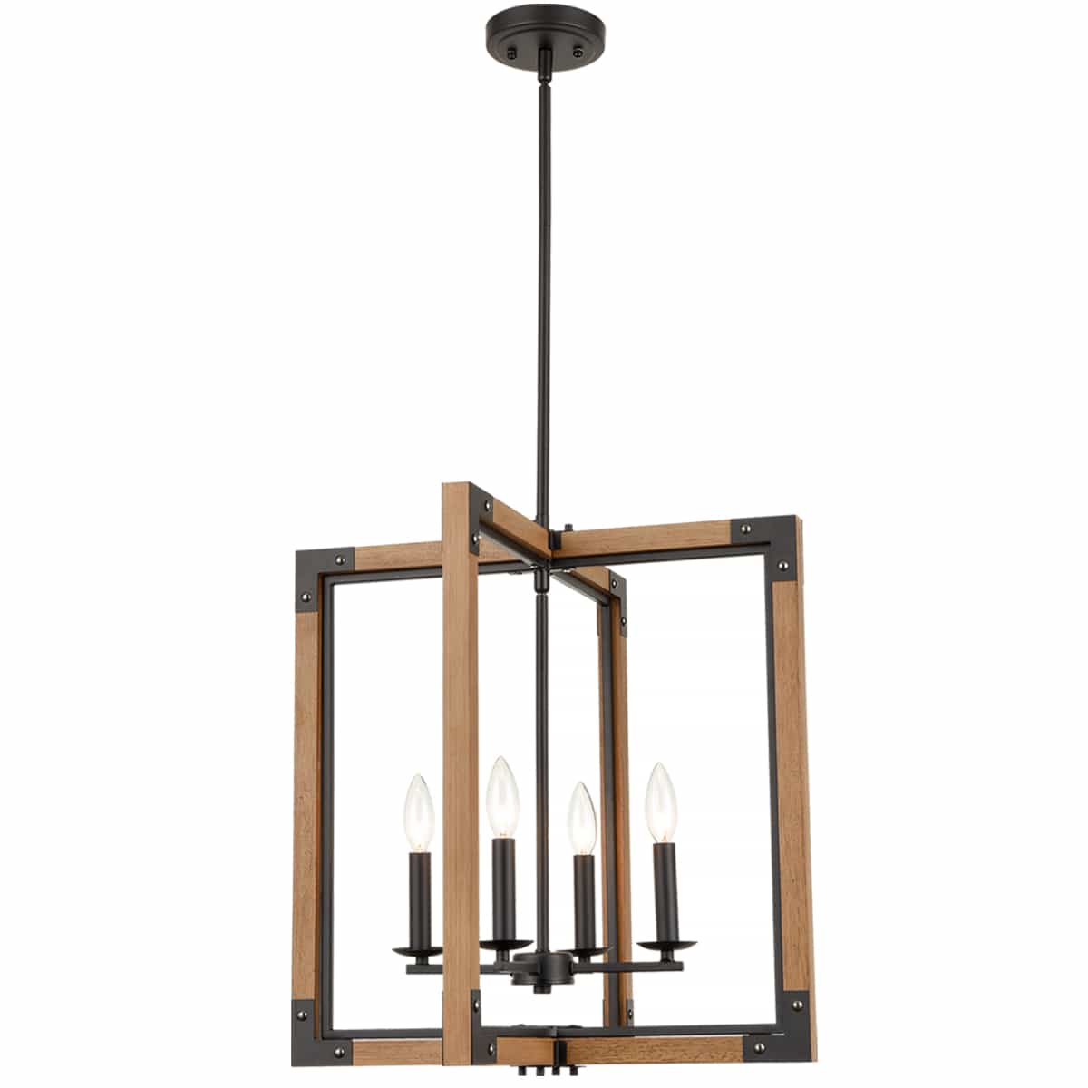 The pendant light’s canopy, rod, lamp holders, arms, inner metal frame, and metal covers at the corners sport a semi gloss black finish, delivering a dramatic decorative impact to the space. Its outer wooden frame gives the space a hint of rusticity with a sandy brown wood grain finish.
