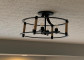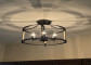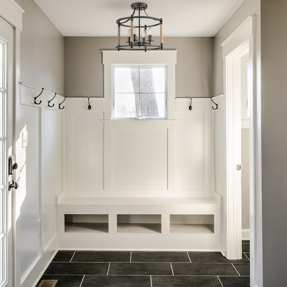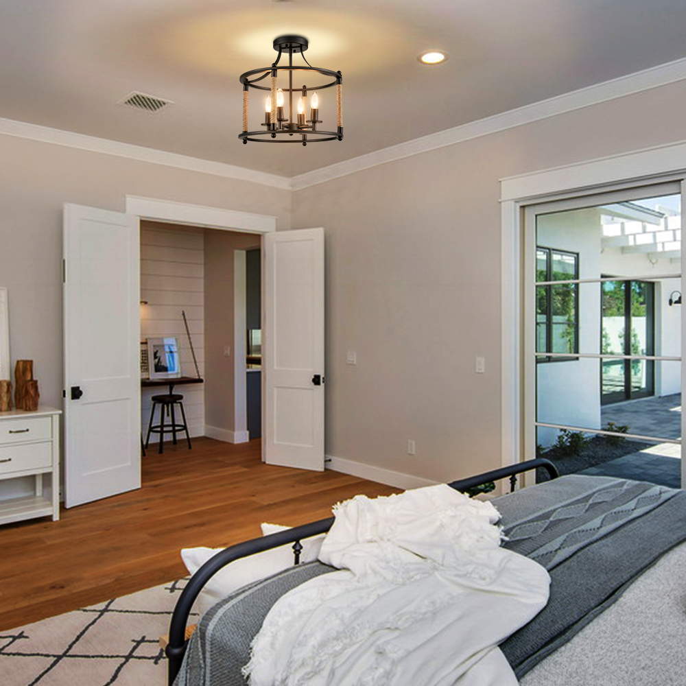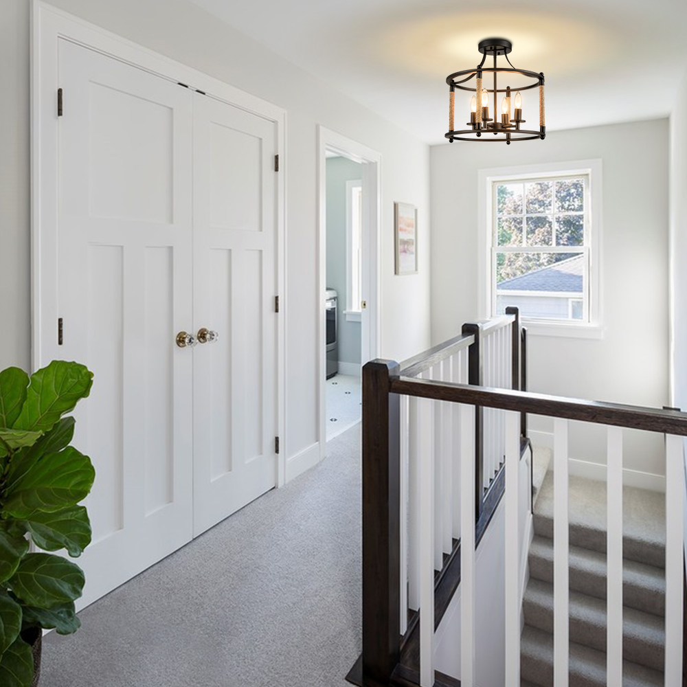 Being finished in black, the ceiling light infuses a vintage inspired charm to your interior. It flaunts an unique drum shade look that keeps your home feel open and airy. It is suspended by two curved arms from the canopy. The drum shade is adorned with four rope-wrapped rods, introducing nautical and coastal vibe to complete the aesthetic. Its exposed candelabra inspired lights add visual interest to your living space.