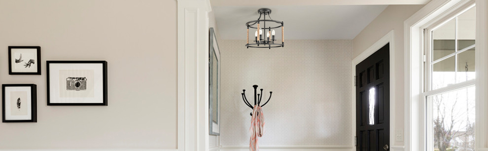 Being finished in black, the ceiling light infuses a vintage inspired charm to your interior. It flaunts an unique drum shade look that keeps your home feel open and airy. It is suspended by two curved arms from the canopy. The drum shade is adorned with four rope-wrapped rods, introducing nautical and coastal vibe to complete the aesthetic. Its exposed candelabra inspired lights add visual interest to your living space.