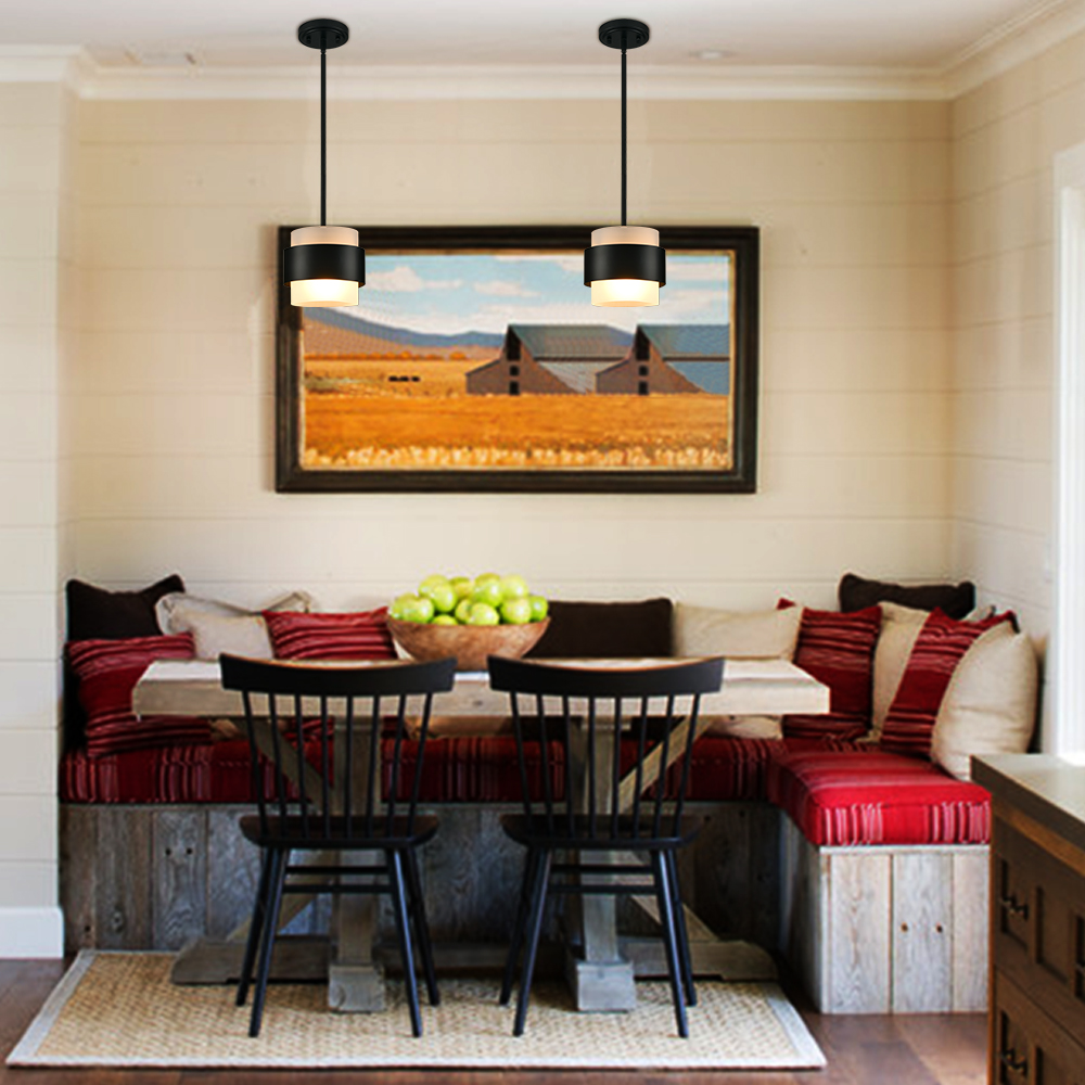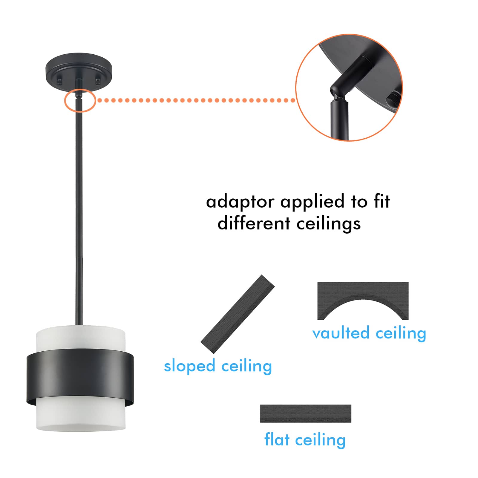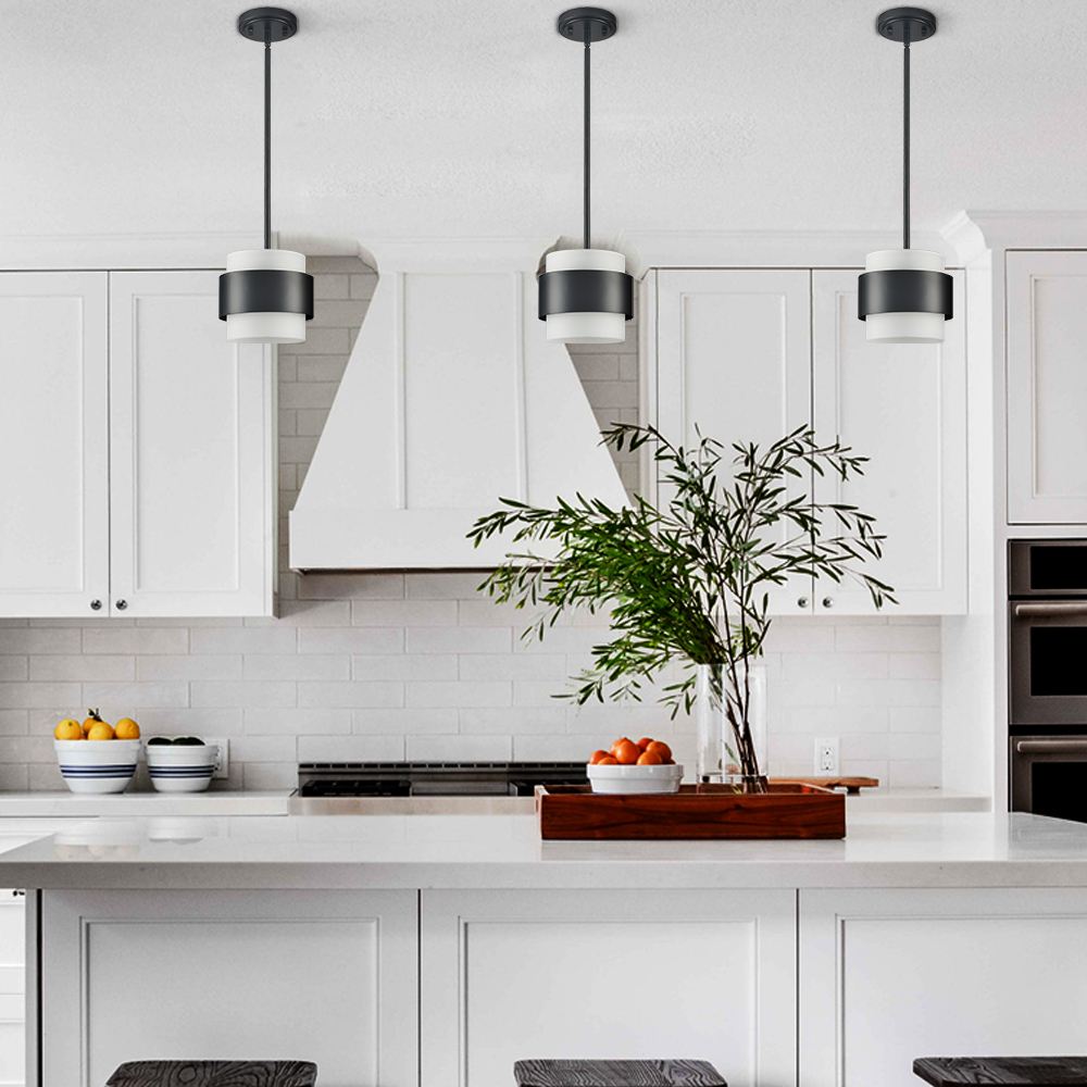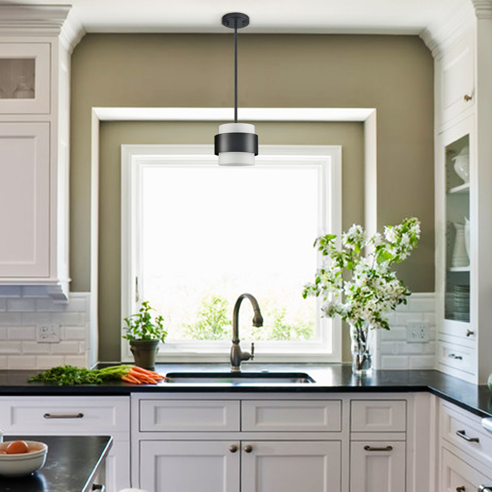 Flaunting a semigloss black finish, the farmhouse glass kitchen pendant light gives your living space a touch of urban sophistication. Its open frosted glass cylinder shade is encircled and protected by a black floating band, adding contrast and a ton of eye appeal to the space. It has all the style, charisma and drama required to make everyone stand still to stare and appreciate. A charming glow shines through the frosted glass shade, creating intriguing light effects and shades. It is sloped ceiling adaptable and comes with three 12-inch rods and one 6-inch rod.