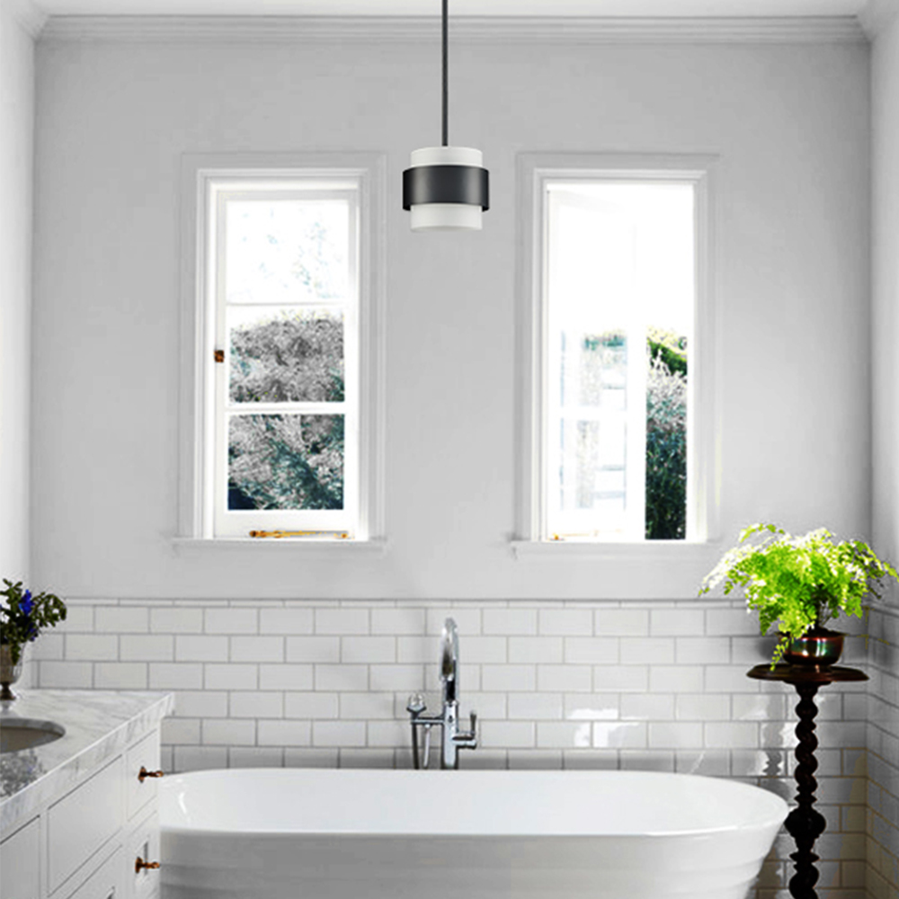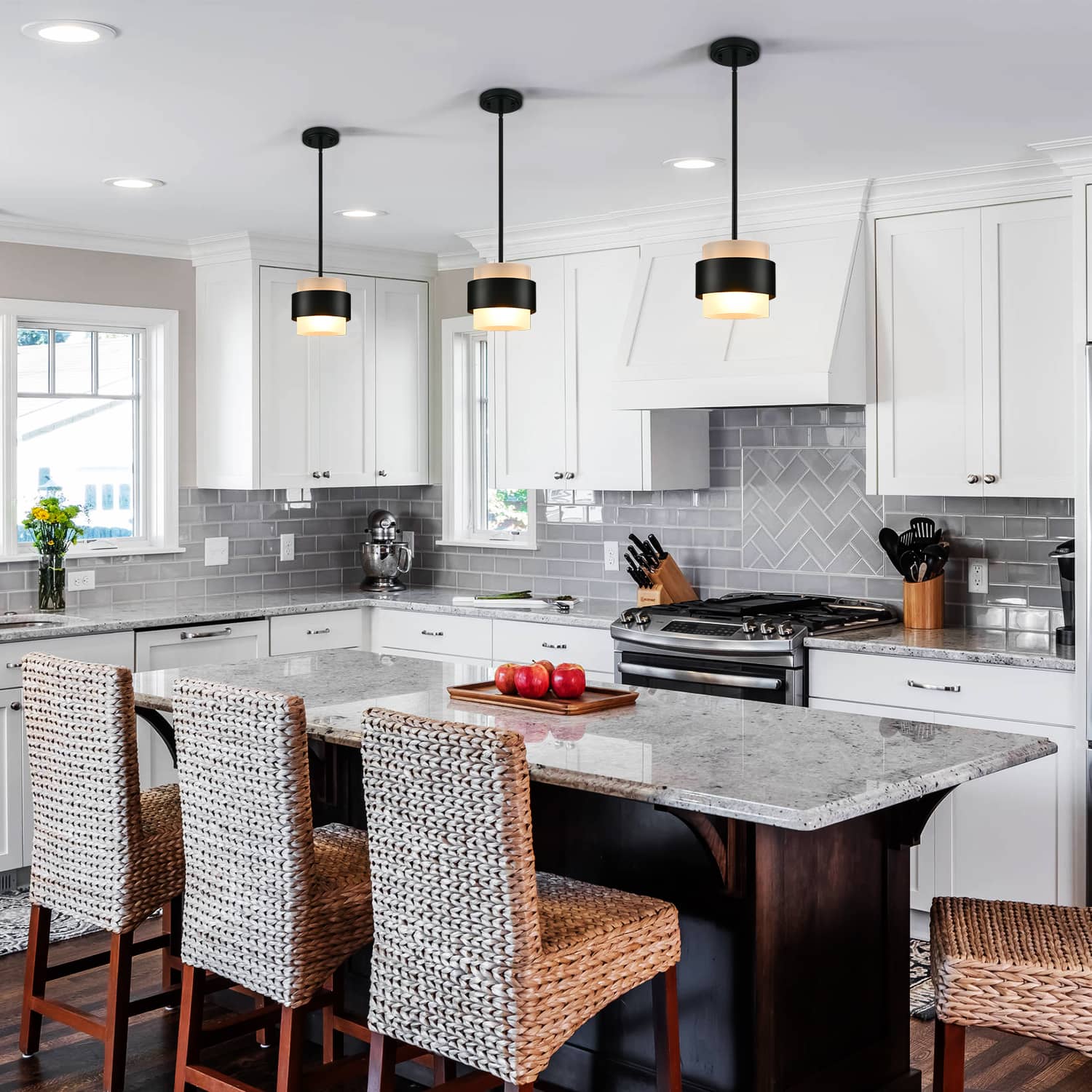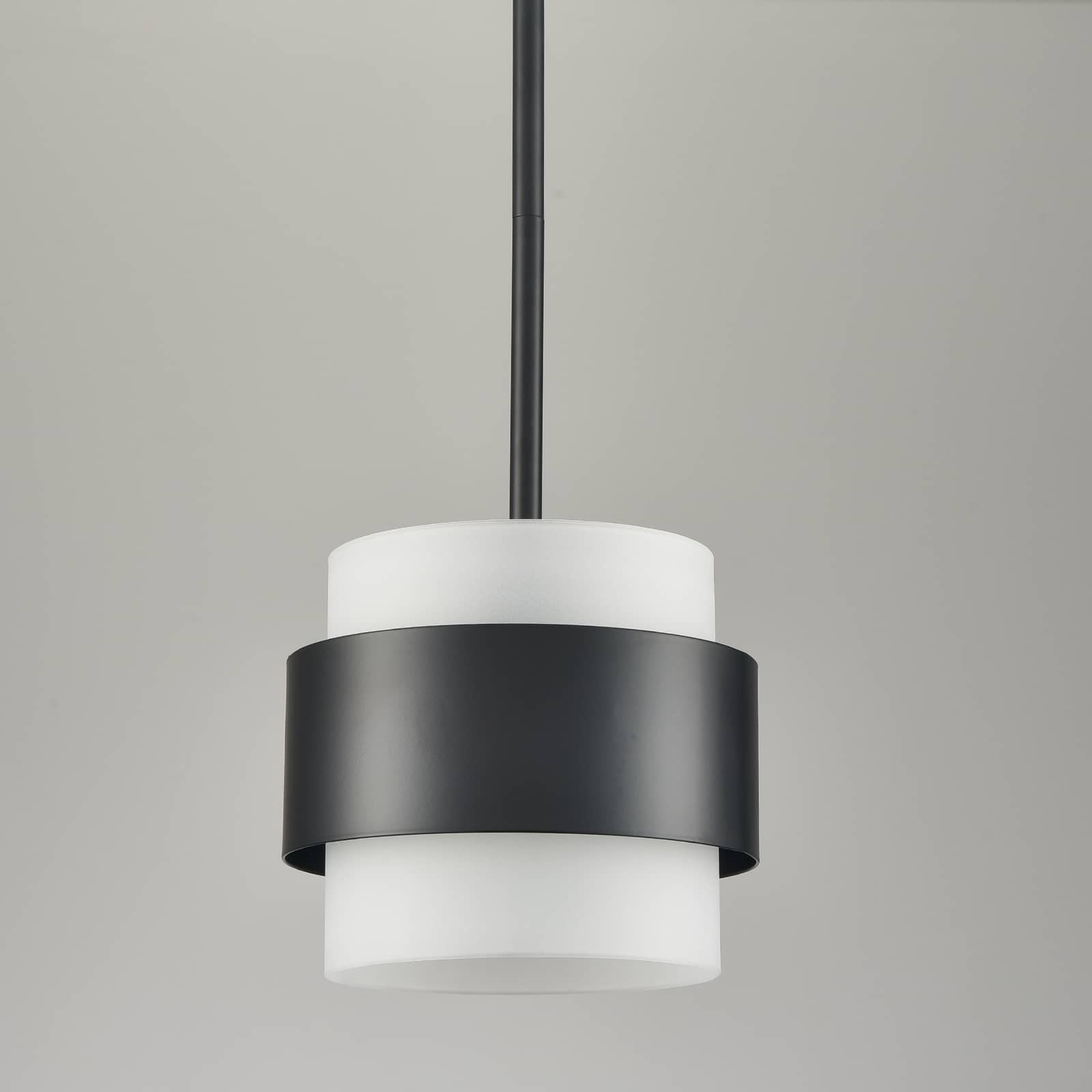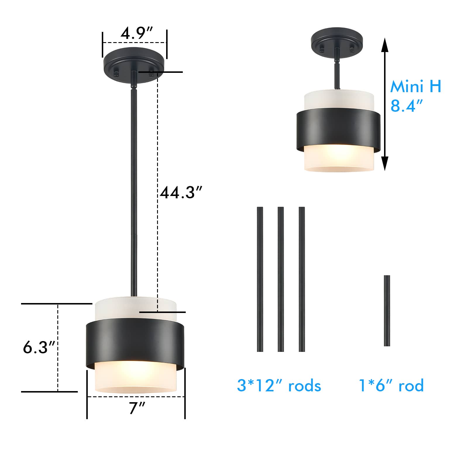 Flaunting a semigloss black finish, the farmhouse glass kitchen pendant light gives your living space a touch of urban sophistication. Its open frosted glass cylinder shade is encircled and protected by a black floating band, adding contrast and a ton of eye appeal to the space. It has all the style, charisma and drama required to make everyone stand still to stare and appreciate. A charming glow shines through the frosted glass shade, creating intriguing light effects and shades. It is sloped ceiling adaptable and comes with three 12-inch rods and one 6-inch rod.