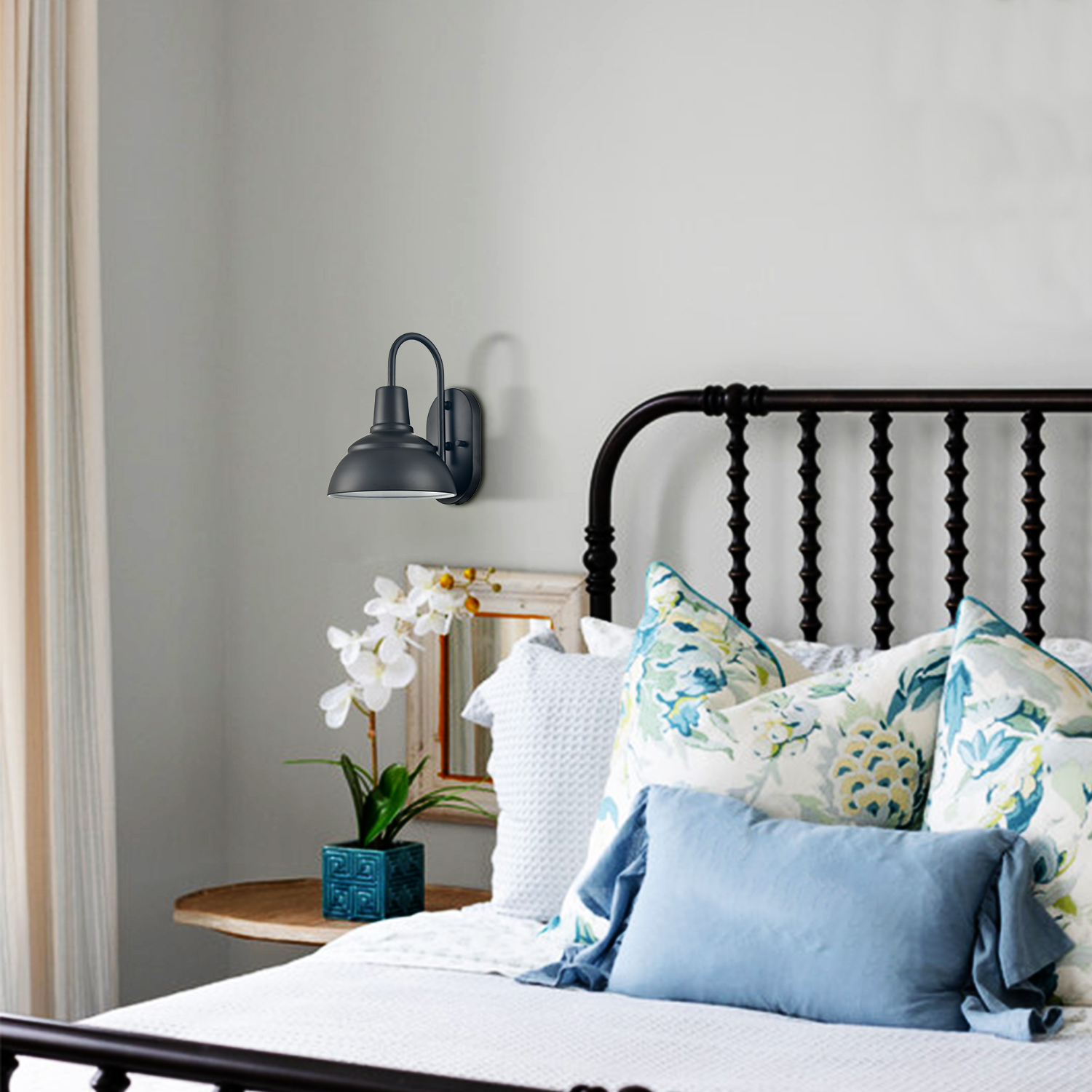The farmhouse indoor/outdoor wall sconce boasts a rustproof semigloss black finish on the outer surface while it flaunts a white finish on the inner surface of the lampshade. The white interior of the lampshade helps reflect the light. Showing off a sleek sphere silhouette and a timeless delicately curved gooseneck design, it offers the perfect blend of industrial classic and farmhouse elements and completes the aesthetic with an elegant touch. Being waterproof, it is perfect for both indoor and outdoor use.