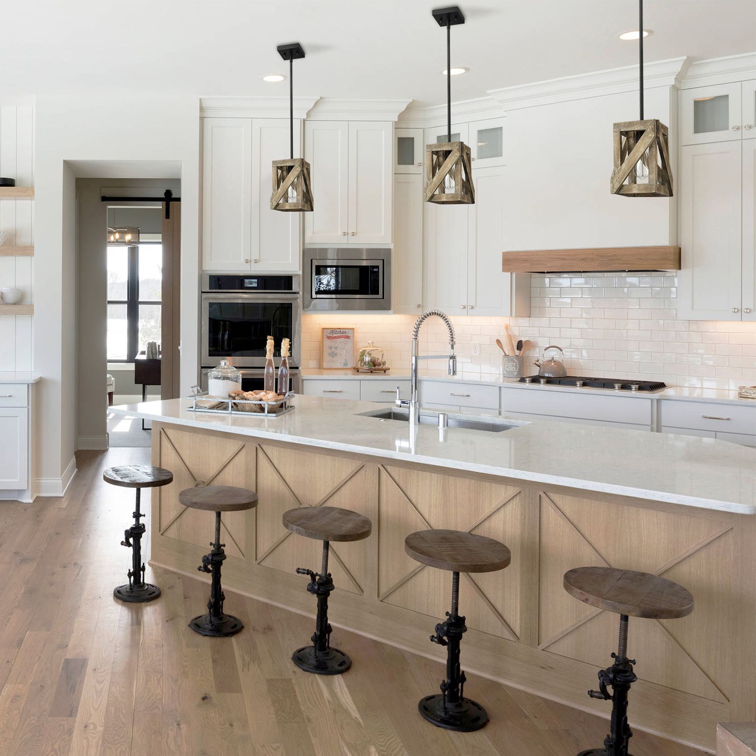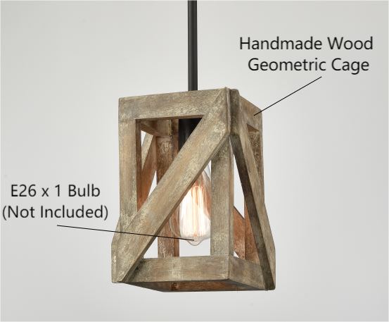 Flaunting a semigloss black finish, the farmhouse pendant light fixture’s canopy, hanging rod, and lamp holder bring a dash of drama to your home. Its open wooden cage adds a hint of rusticity to the living space with a tortilla finish. A few wood slats are put together to form an airy rectangular lampshade and encircle an exposed bulb, showcasing the beauty of geometry. The wood cage sports slantwise wood slats that add visual interest and character to the light fixture. It is sloped ceiling adaptable and comes with four 10.63-inch rods to suit your different lighting needs.