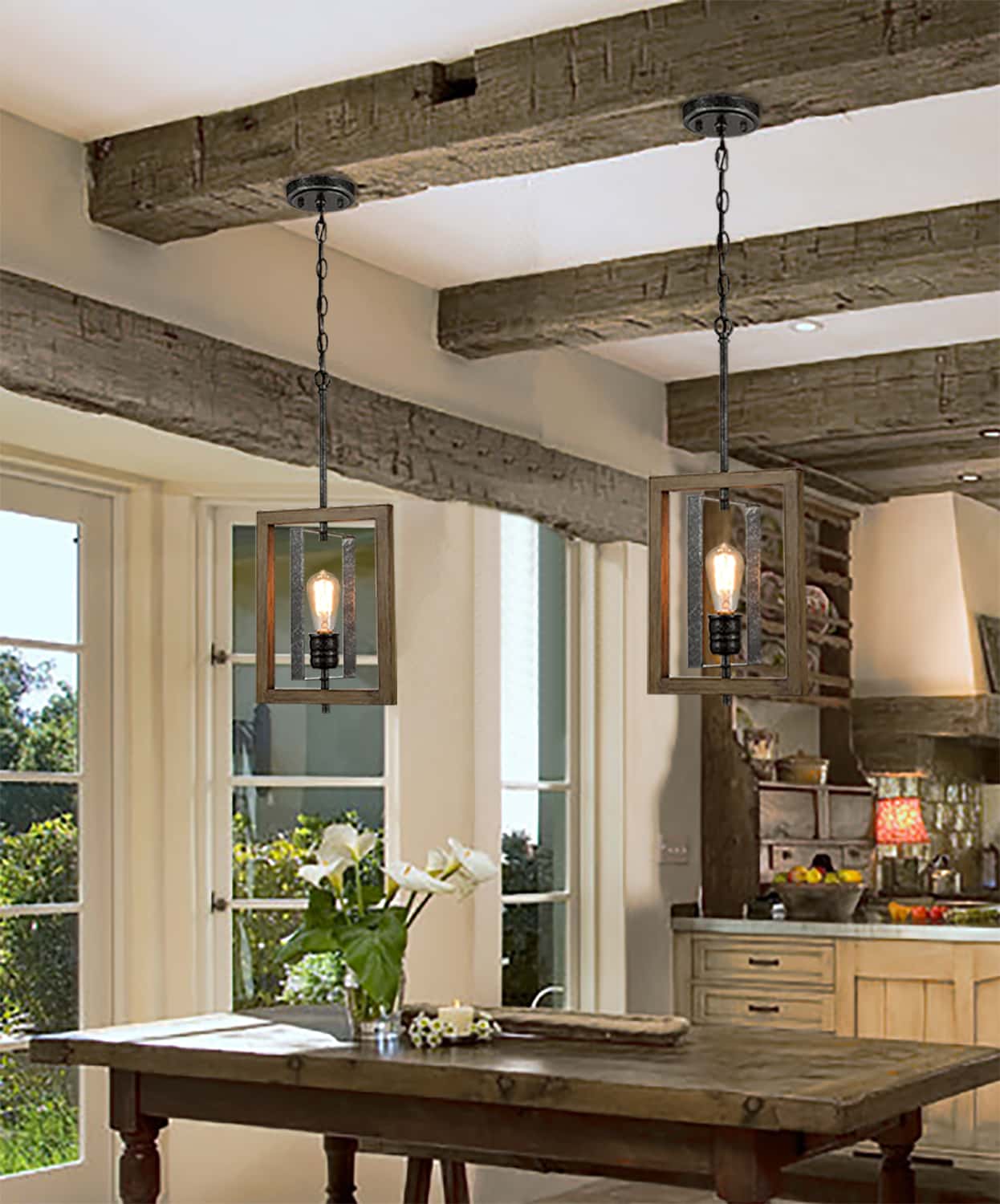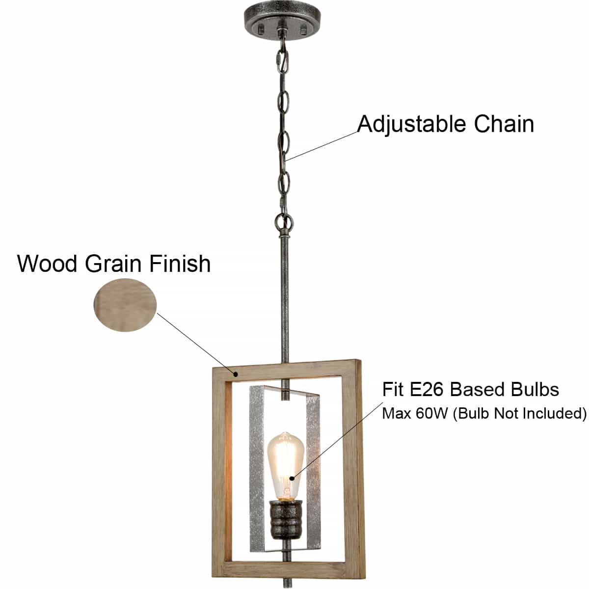 Sporting an oil-rubbed bronze finish with silver glitter, the pendant light’s canopy, rod, chain, lampholder, and the interior metal frame introduce a dramatic decorative impact to the space. Its outer frame gives the space a hint of rusticity with a wood grain finish.
