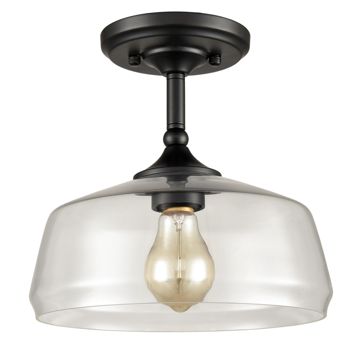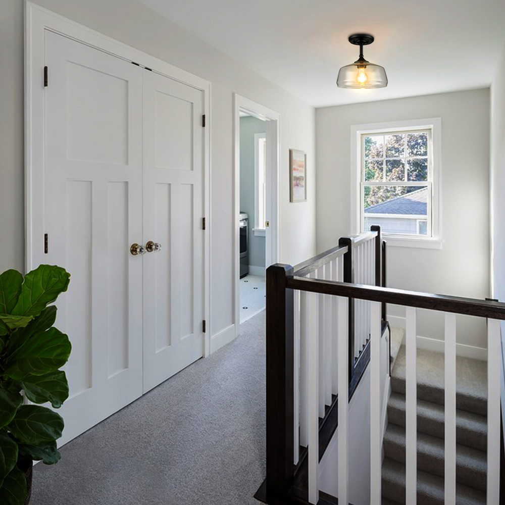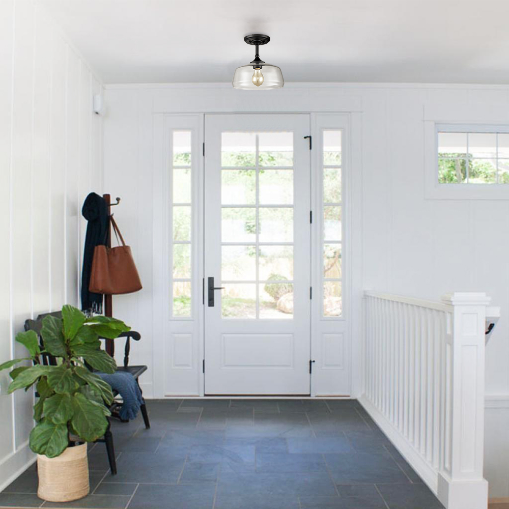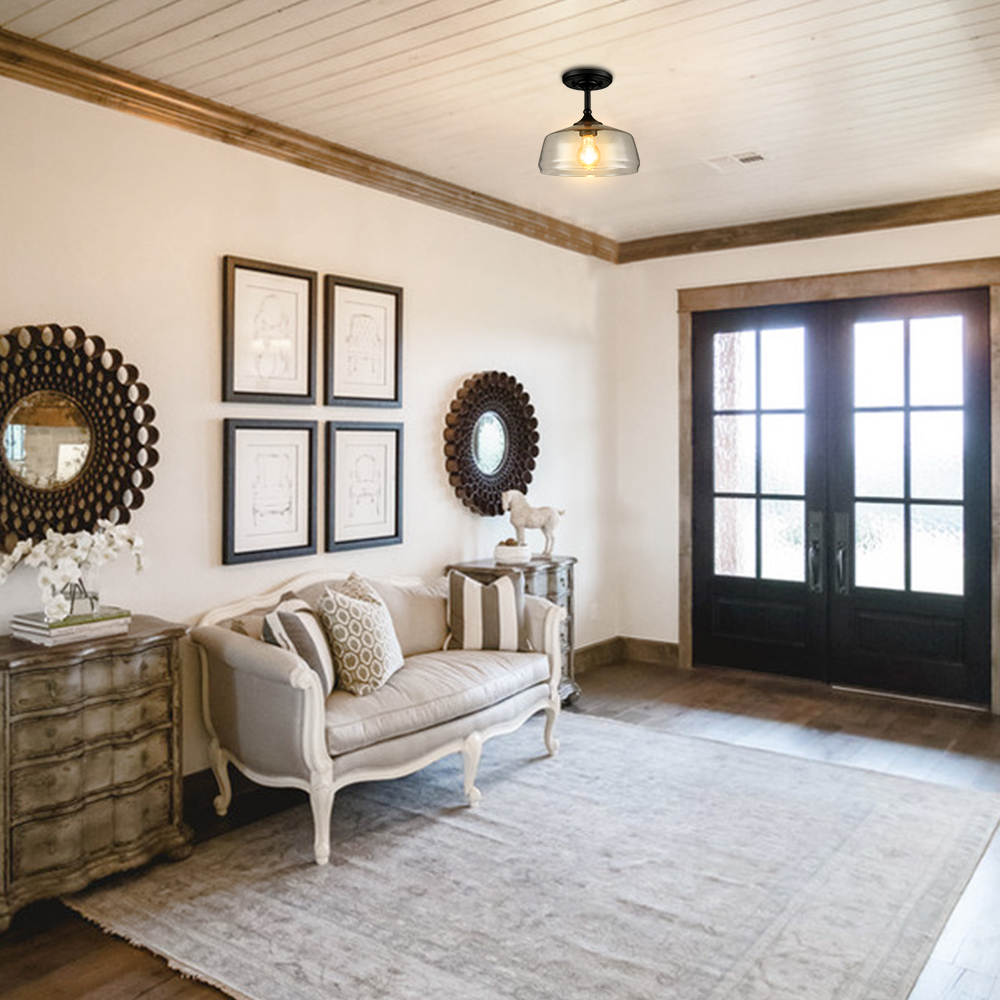 The semi flush mount glass ceiling light’s canopy, rod, and lamp-holder are coated in a shimmery black finish, enlivening your space with a touch of glitz. Crafted of impurity-free hand-blown clear glass, its barn shade with excellent light transmittance makes an industrial yet modern statement.