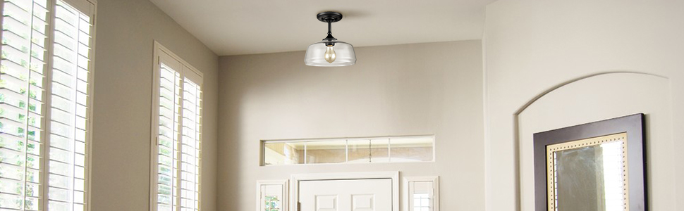 The semi flush mount glass ceiling light’s canopy, rod, and lamp-holder are coated in a shimmery black finish, enlivening your space with a touch of glitz. Crafted of impurity-free hand-blown clear glass, its barn shade with excellent light transmittance makes an industrial yet modern statement.