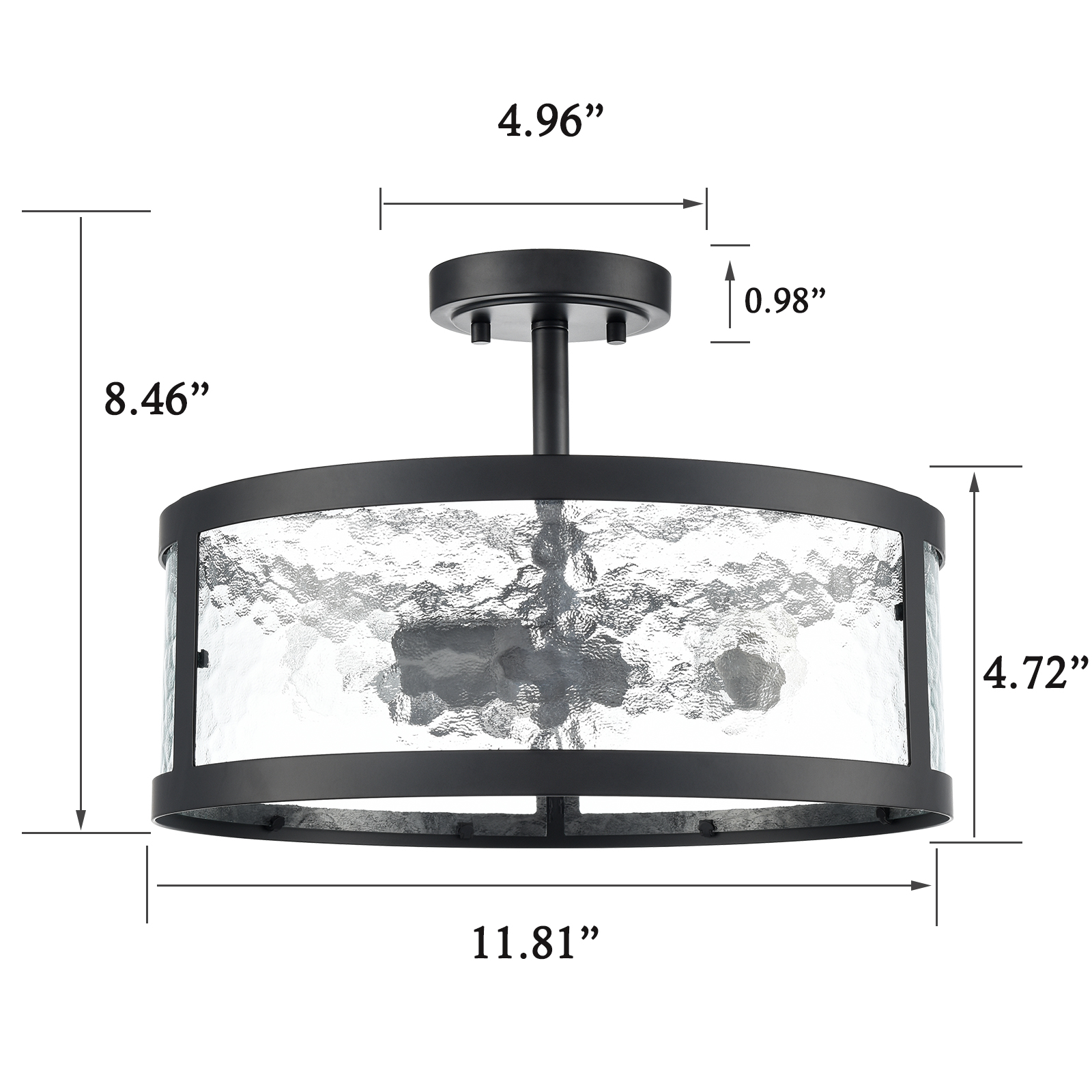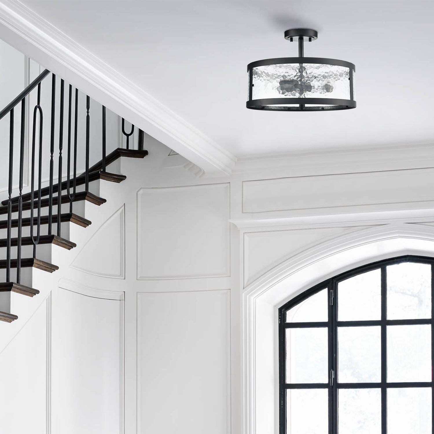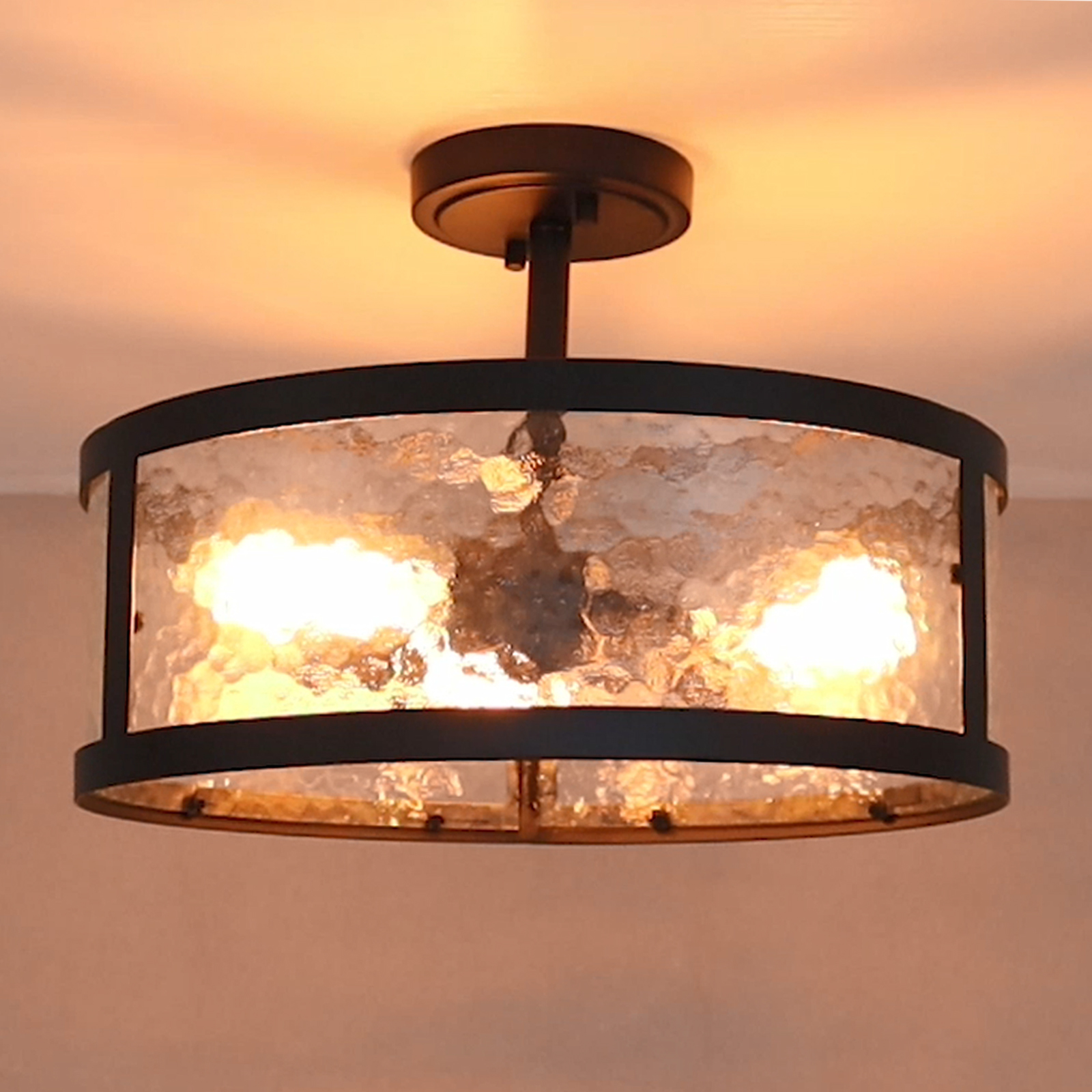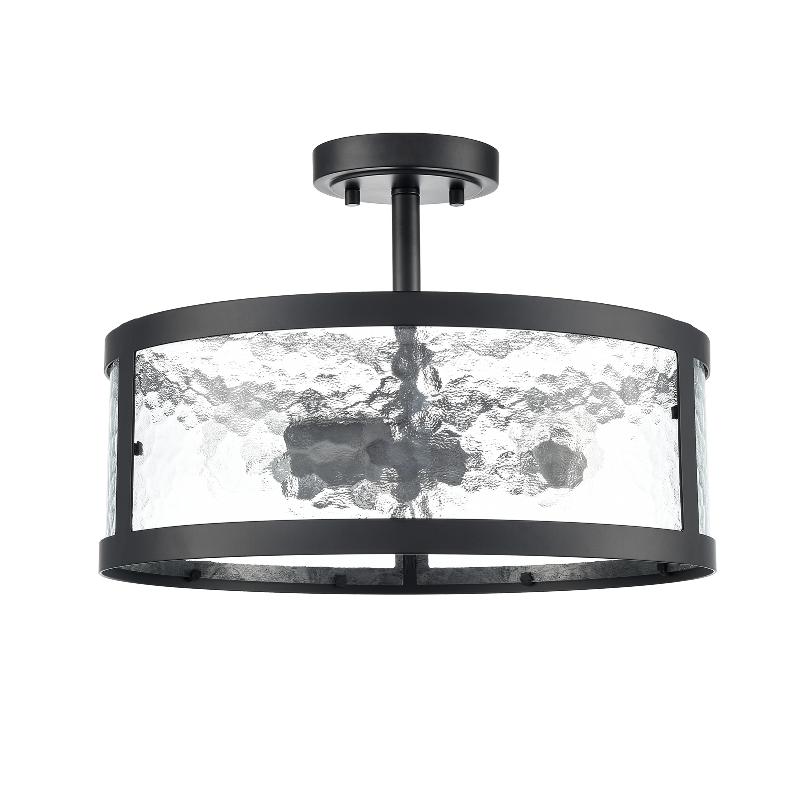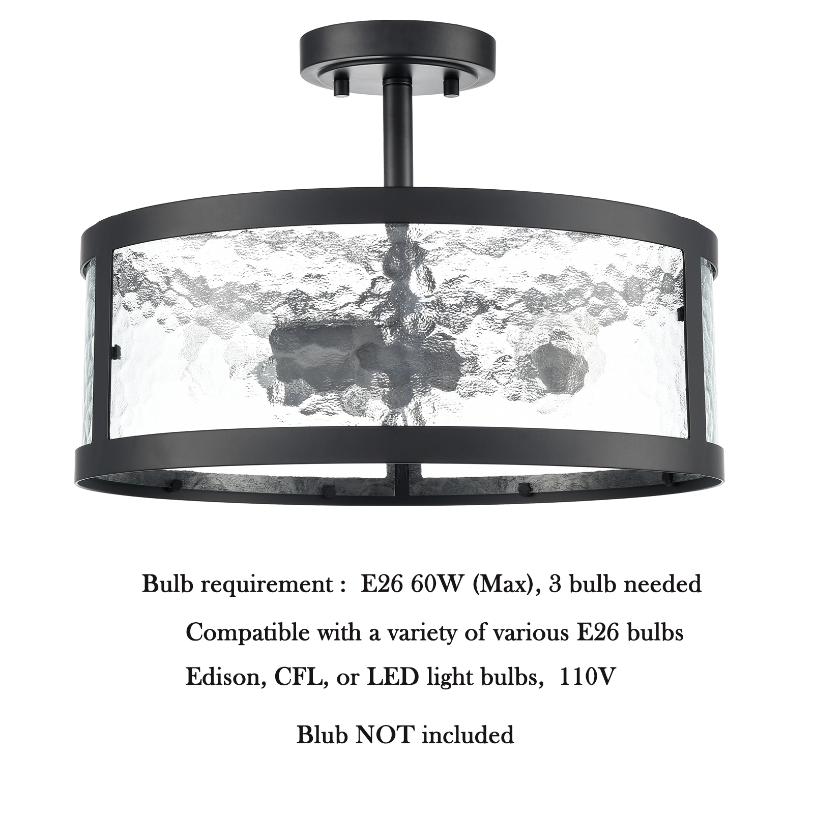 Being finished in matte black, the semi flush mount ceiling light perks up your living space with a touch of urban sophistication. It flaunts an open drum shade encasing three exposed bulbs and lends a breezy and airy touch. Its opaque stone-patterned contour-baked glass panels add visual interest and character to your living space. Its black finish contrasts the opaque glass panels, which brings an alluring visual interest to the living area. Its matte black finish and the glass panels draw the eye upward to a beautiful display of glass and metal suspended above.