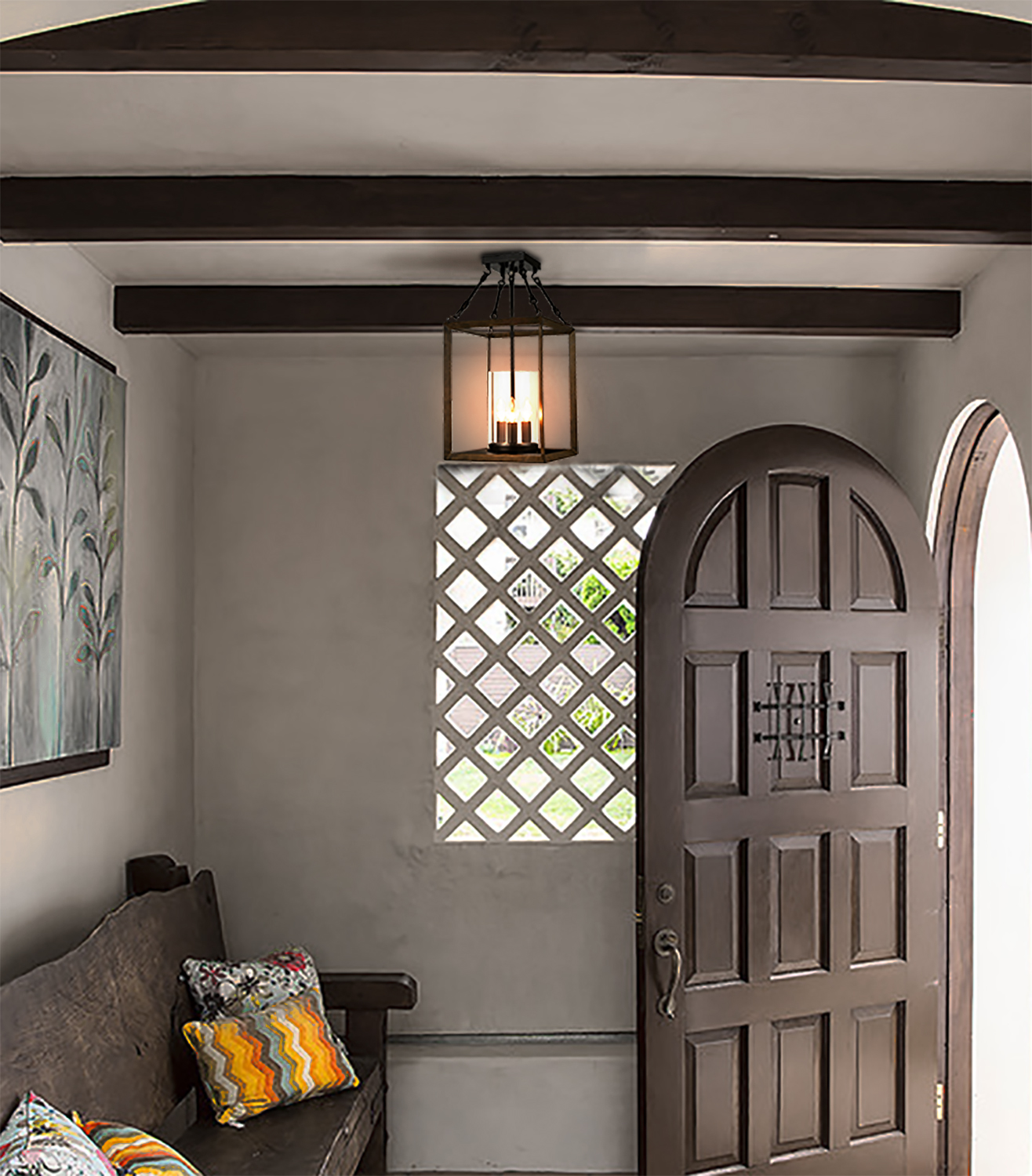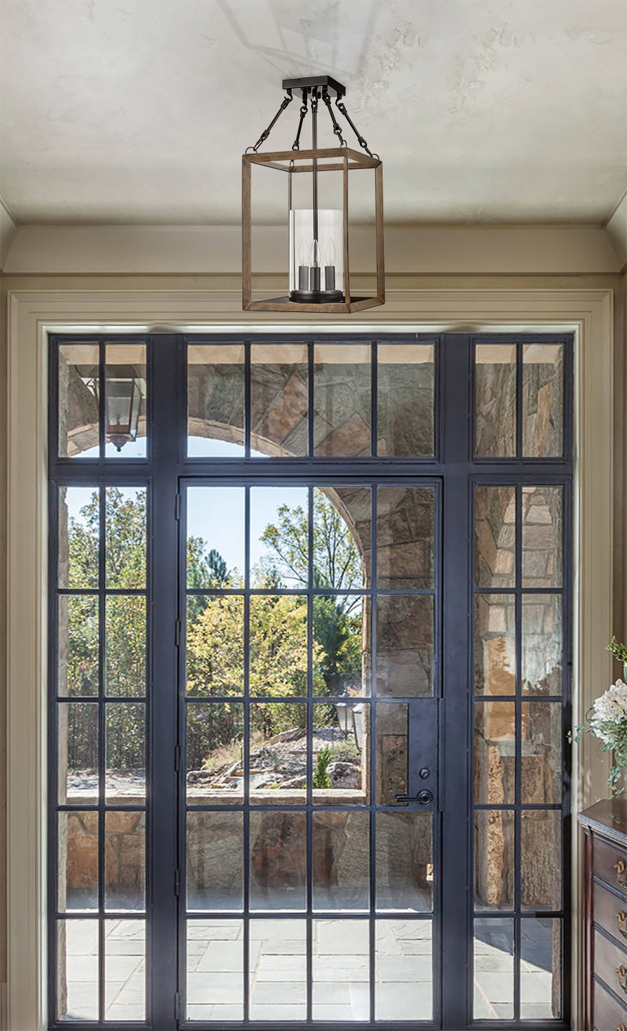 Finished in rustproof mahogany bronze, the semi flush lantern ceiling light lends a retro-inspired style to your home decor. Three candelabra-inspired lights are enveloped in a clear glass cylinder shade. Its rectangular lantern cage instills bold geometric accent into your interior.