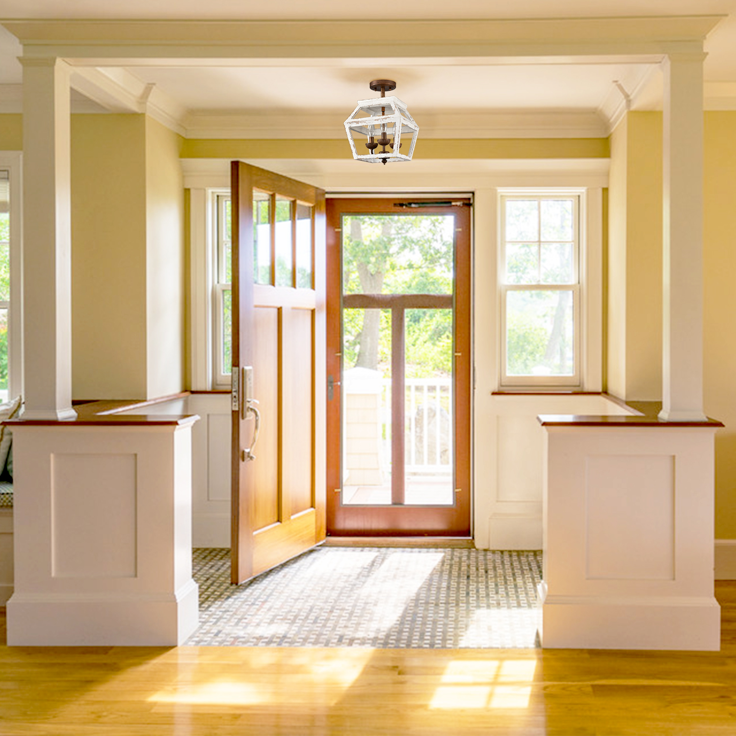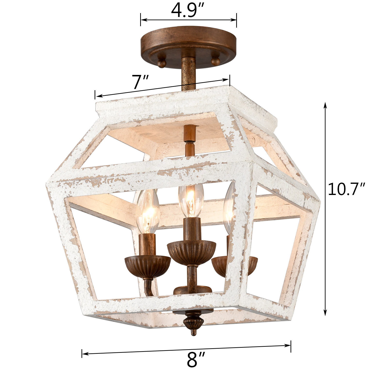 Crafted from solid wood, the farmhouse wood ceiling light sports a wooden trapezoid cage dressed in a distressed white finish, showcasing the beauty of geometry. Its lamp holders, canopy, rod, and bobeches are coated in an antique gold finish, delivering a nice pop of brightness to your living space. The farmhouse wood ceiling light’s wooden cage encircles three exposed bulbs, making the light an eye-catching addition to your home. Its open cage design allows the light to pass right through and creates intriguing light effect and shades.