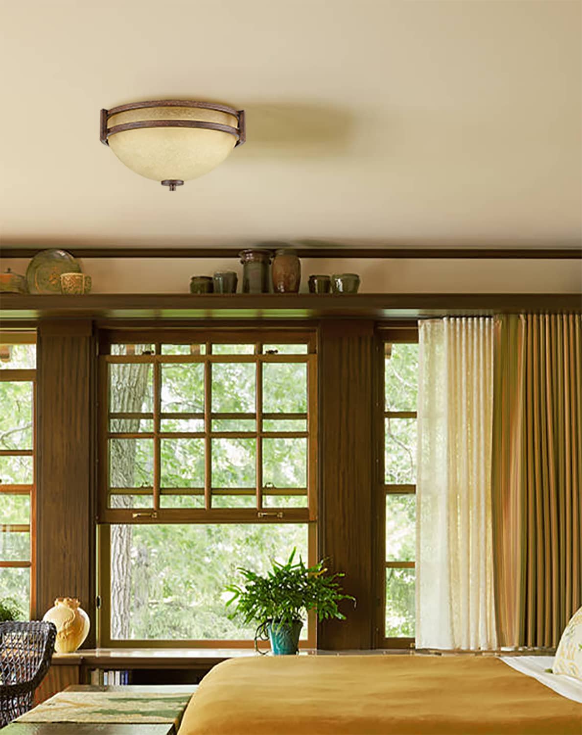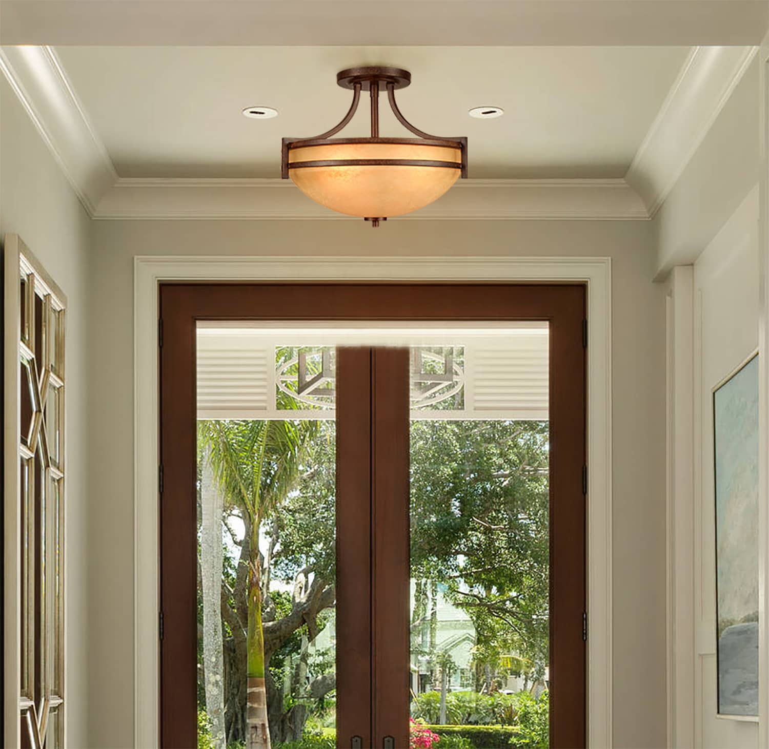 The flush mount ceiling light imparts rich textural appeal to your aesthetic with a rusty brown finish. It flaunts an amber Scavo glass shade that is held in place by a rounded frame, bringing tasteful details to the interior. Crafted of impurity-free handblown glass, the ceiling light’s Scavo glass dome shade elevates your interior with a graceful touch.