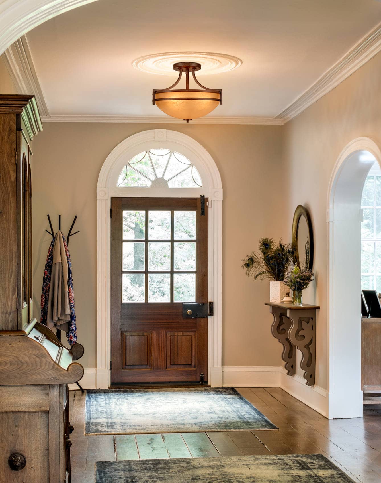 A mix of finishes encompasses both rustic qualities and farmhouse elements, yet maintains a vintage feel. The Scavo glass shade allows the lights to gently filter through and cast intricate shadows. Add this amazing piece to your bedroom, entryway, exterior, foyer, kids’ room, and kitchen.