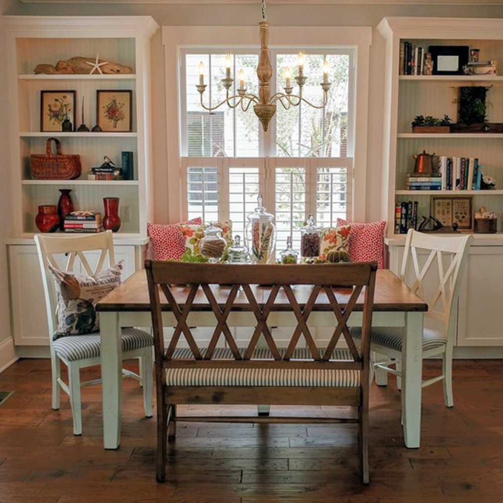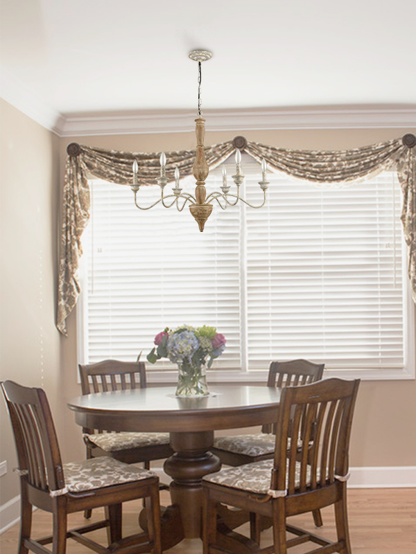 Crafted from wood and metal, the chandelier’s wooden frame and and candelabra-inspired lights introduce a dash of old-time element and a French country chic to your living space. Being finished in distressed white, its canopy, chain, bobeches, scrolling arms and lamp-holders offer sculpted details and farmhouse chic to your aesthetic.