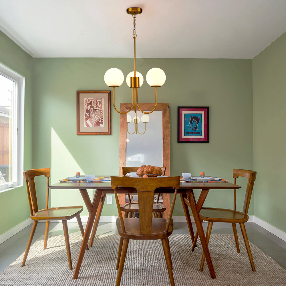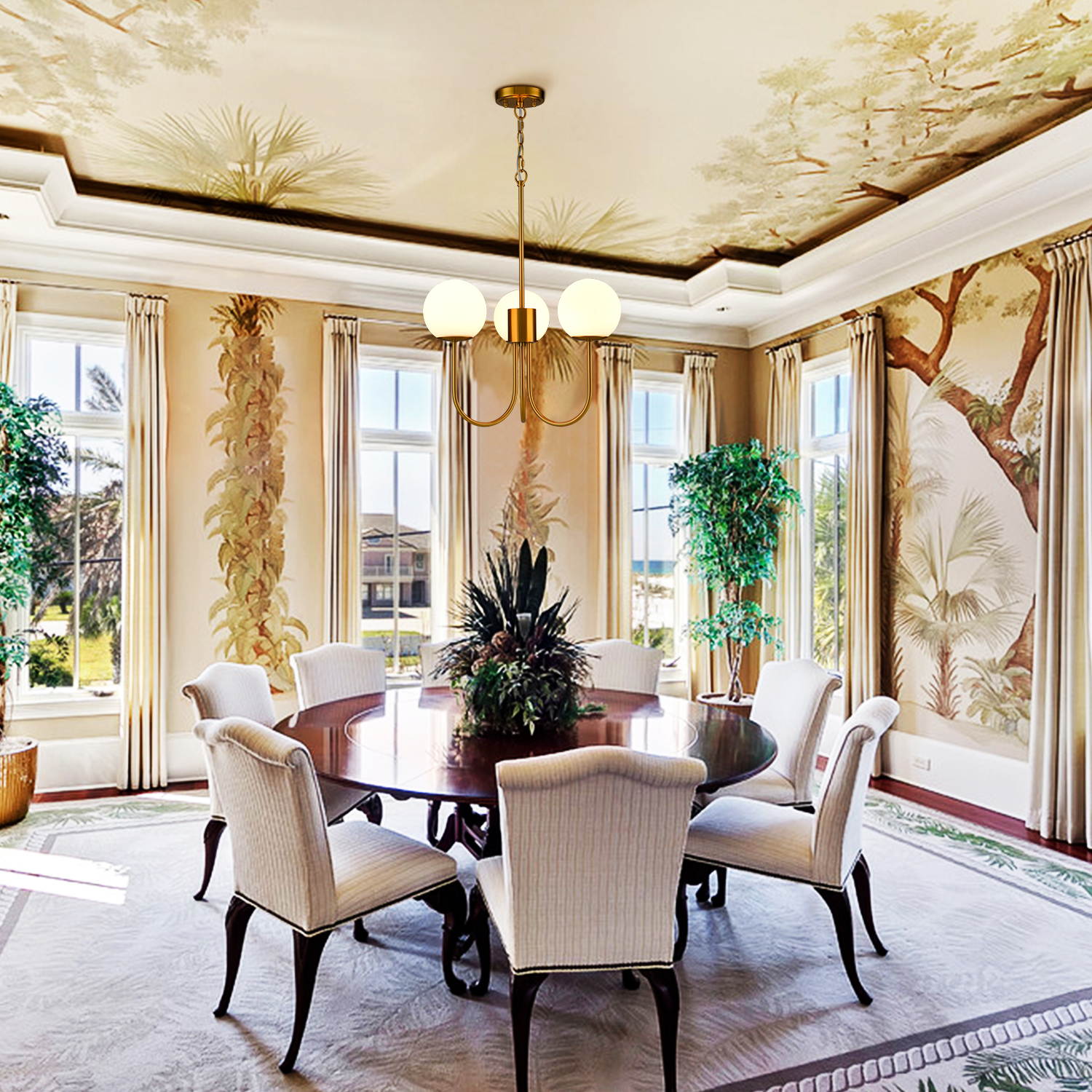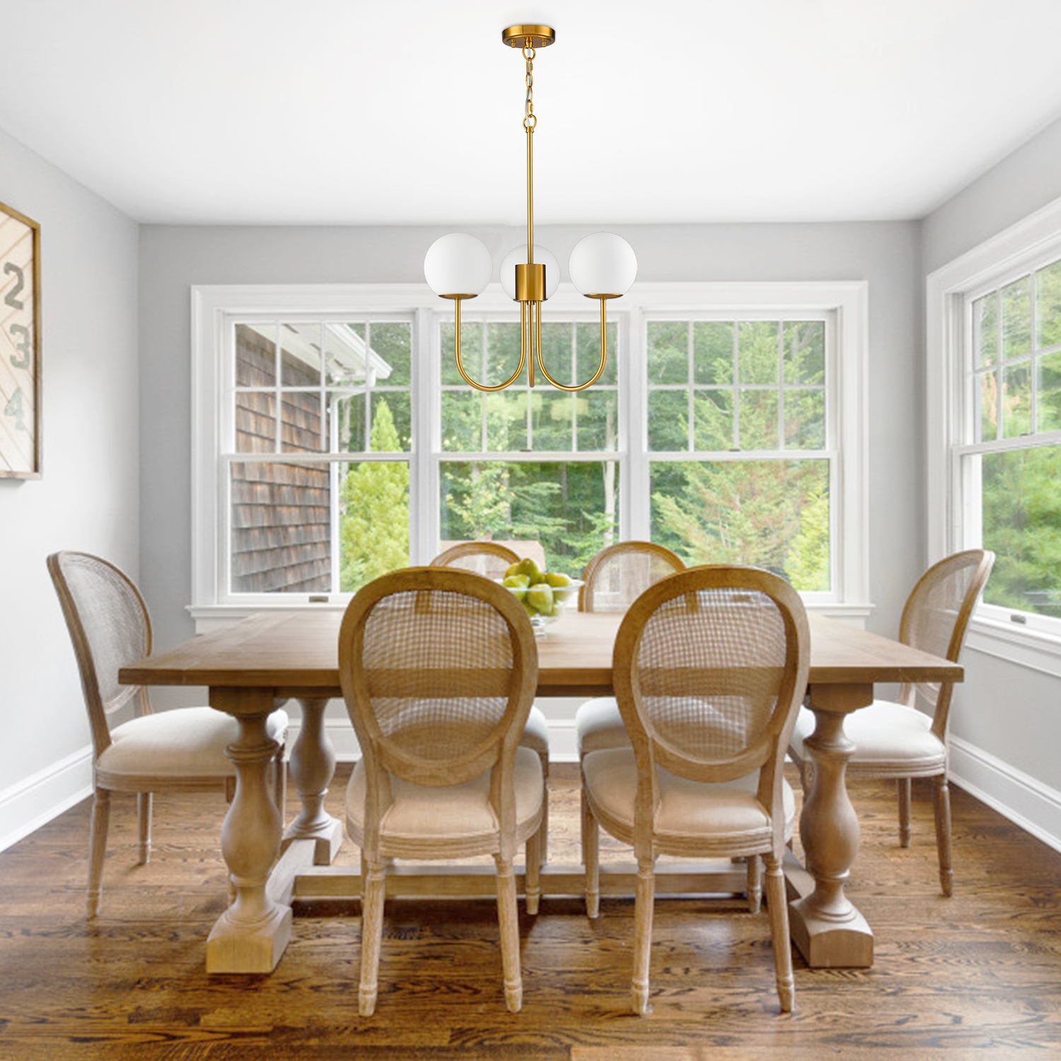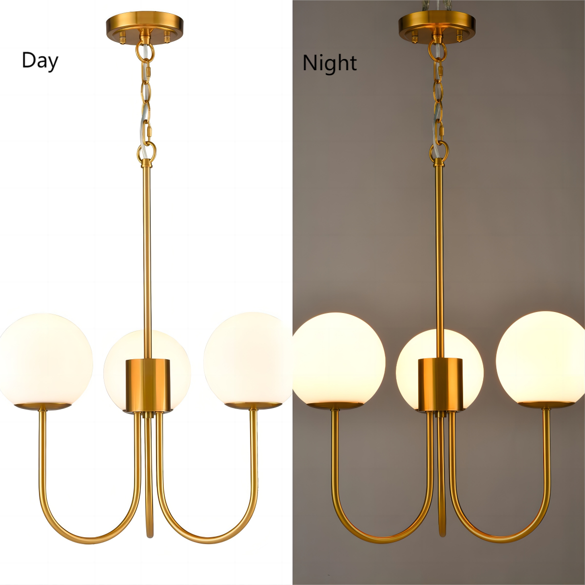 Flaunting a rustproof electrophoretic brass finish, the glass globe chandelier spruces up your living space with a glint of glamour and makes your home fizz with a pop of personality. Crafted from hand-blown opaque opal glass, it provides the perfect blend of mid-century classic and contemporary elements. Three glass shades are supported by gracefully curved arms extending upward, conveying a refined touch. Its opal glass shades contrast the brass finish and add alluring visual interest to the space. It comes with one 12-inch rod and one 47.24-inch adjustable chain.