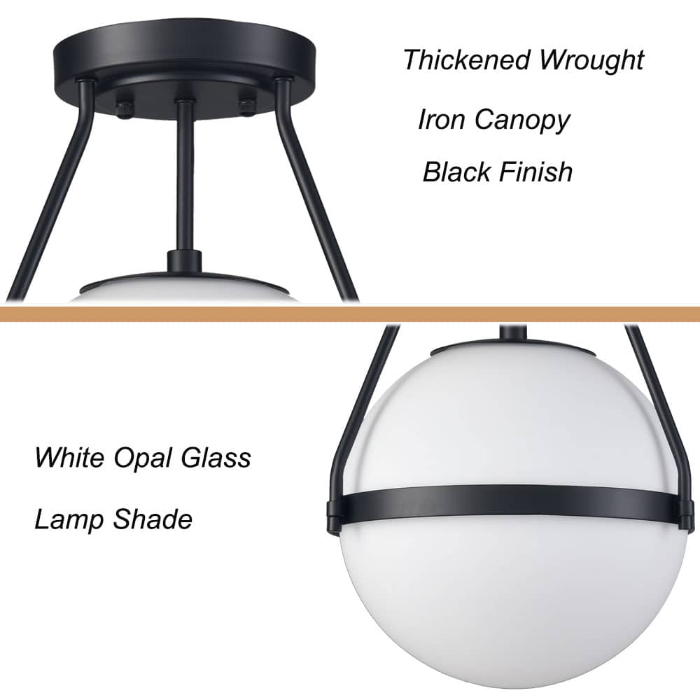 The globe semi flush ceiling light’s canopy, arms, lamp-holder and the metal ring give your interior a touch of modern sophistication with a semigloss black finish. Crafted from impurity-free hand-blown opaque opal glass, its glass shade is held aloft by arched arms and a metal ring. It provides the perfect blend of mid-century classic and contemporary elements and completes the aesthetic with an elegant touch. Its glass globe shade contrasts the dark finish while the black-and-white color combo adds alluring eye appeal to the space. It can be used to provide both function and style in your bedroom, dining room, entryway, foyer, kids’ room, kitchen, and living room.