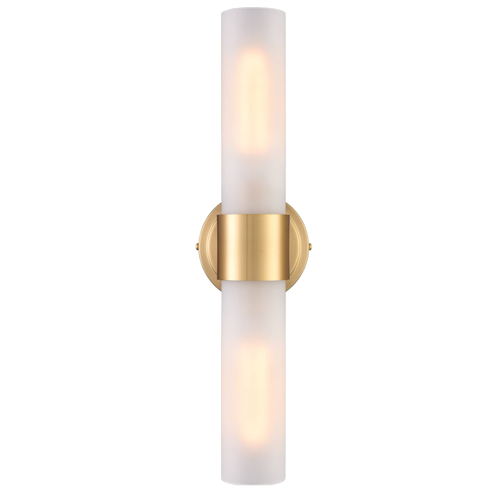 The modern gold bathroom sconce flaunts a rustproof electrophoretic gold finish, sprucing up your living space with a touch of sparkle. It shows off an elongated cylinder shade crafted from impurity-free handblown frosted glass. The shade is designed to encircle two candelabra-inspired sockets to complete the aesthetic. It is held aloft by a gold metal ring in the middle of the glass shade, bringing an unrivaled level of sophistication. Its cylinder shade contrasts the gold finish and adds alluring visual interest to the living area. A charming glow shines through its opaque frosted glass shade, creating intriguing light effects and shades. It can be installed horizontally or vertically.