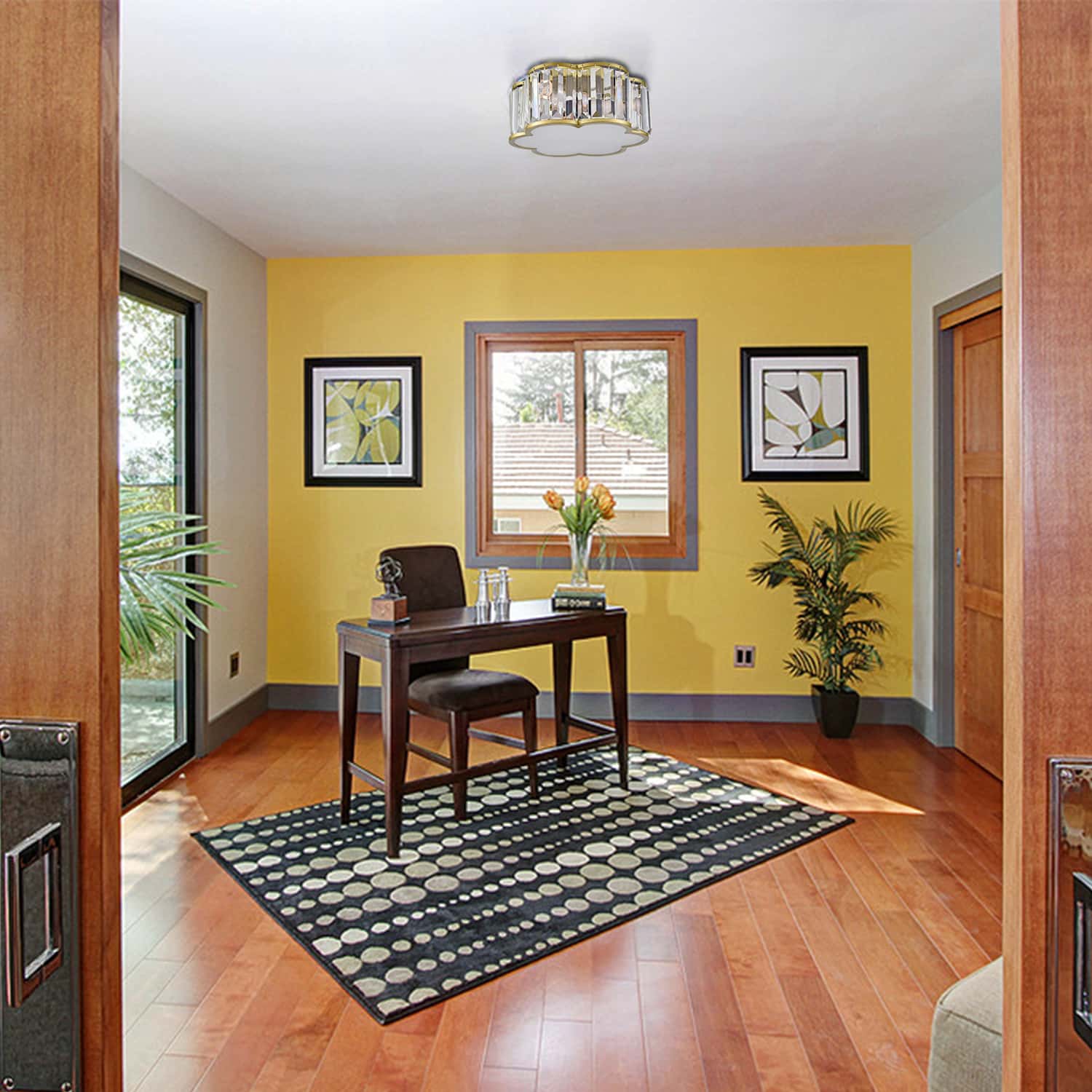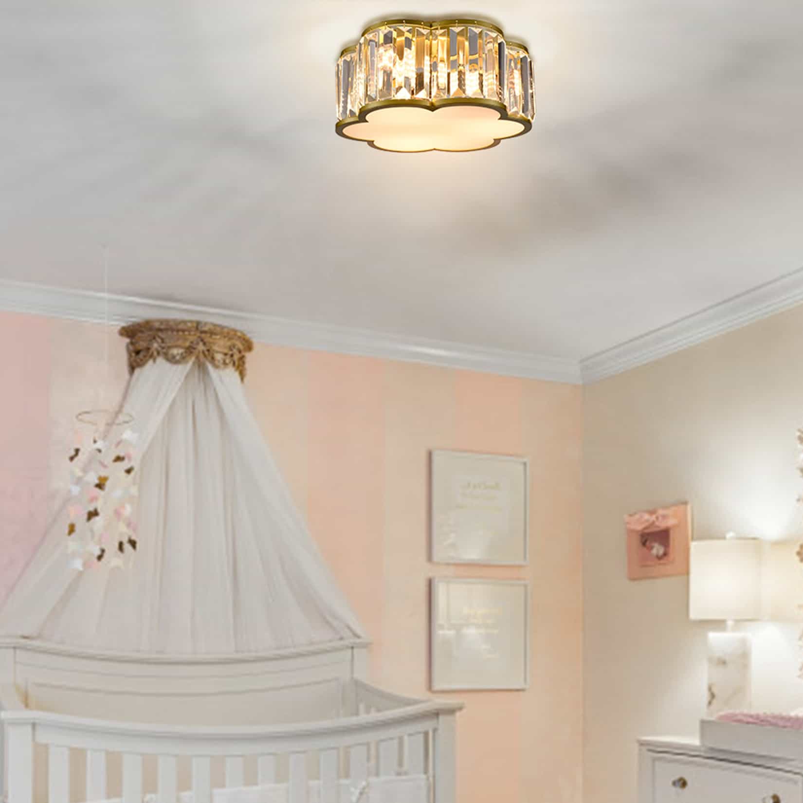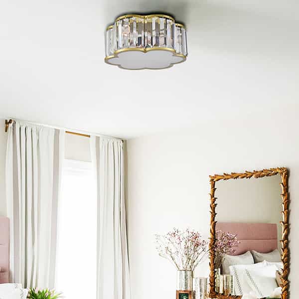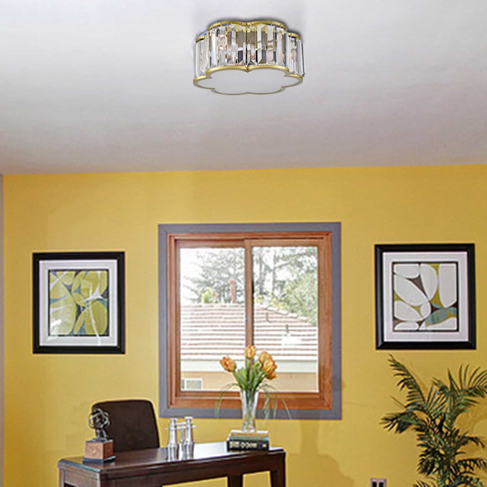 The crystal ceiling light fixture is sure to draw the eye upward and adds glitzy sparkle to the space with its breath-taking gold finish. It sports a scalloped drum shade decorated with angular K9 crystal prisms. Offering a surprising twist, it delivers a huge dose of contemporary sparkle and a luxurious touch to your interior. It casts gorgeous light rays throughout your space while the light bounces and reflects off the crystal prisms to create bright, intriguing light effects and shades. Its gleaming finish contrasts the airy crystal drum shade and serves as eye candy. It is a show-stopping addition to your home with its crystal accent.