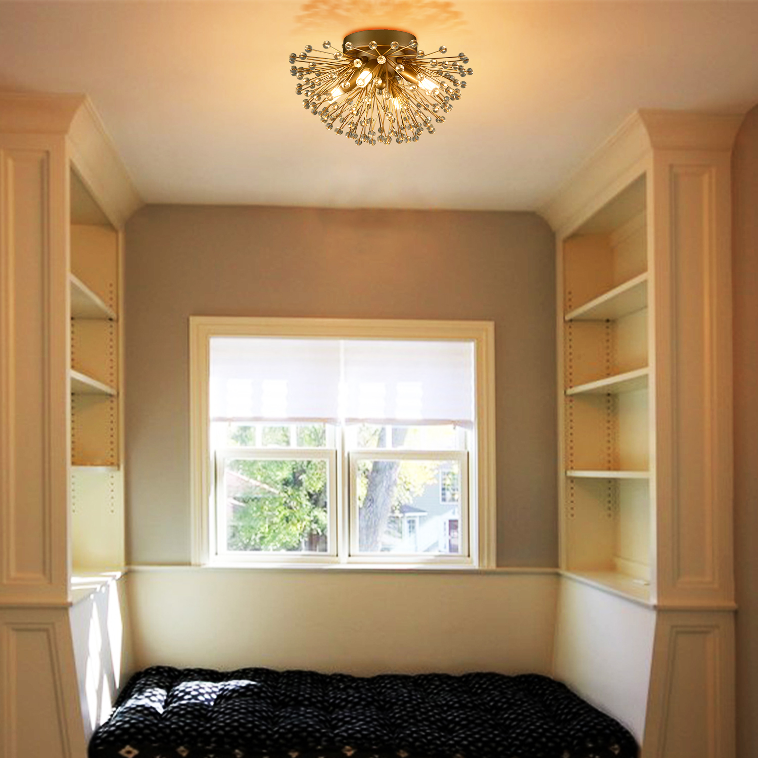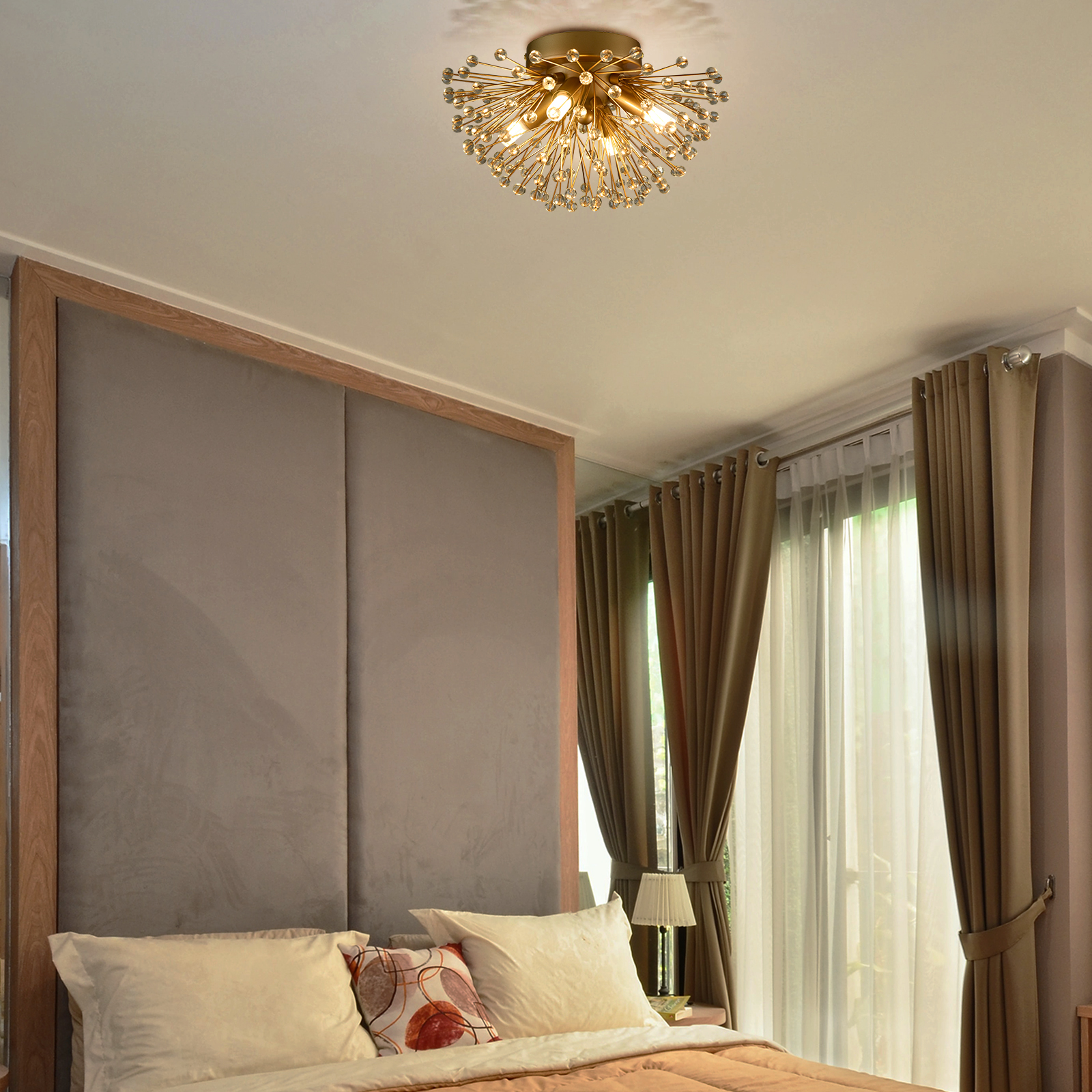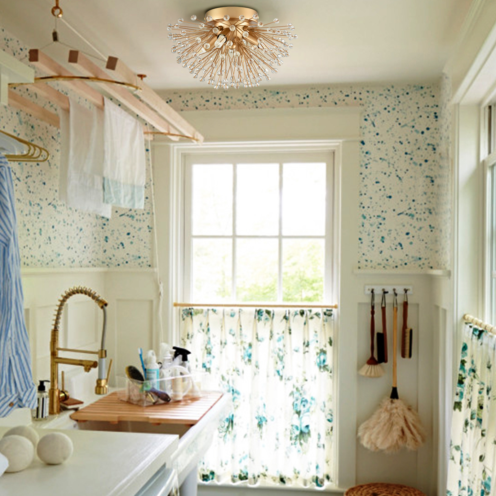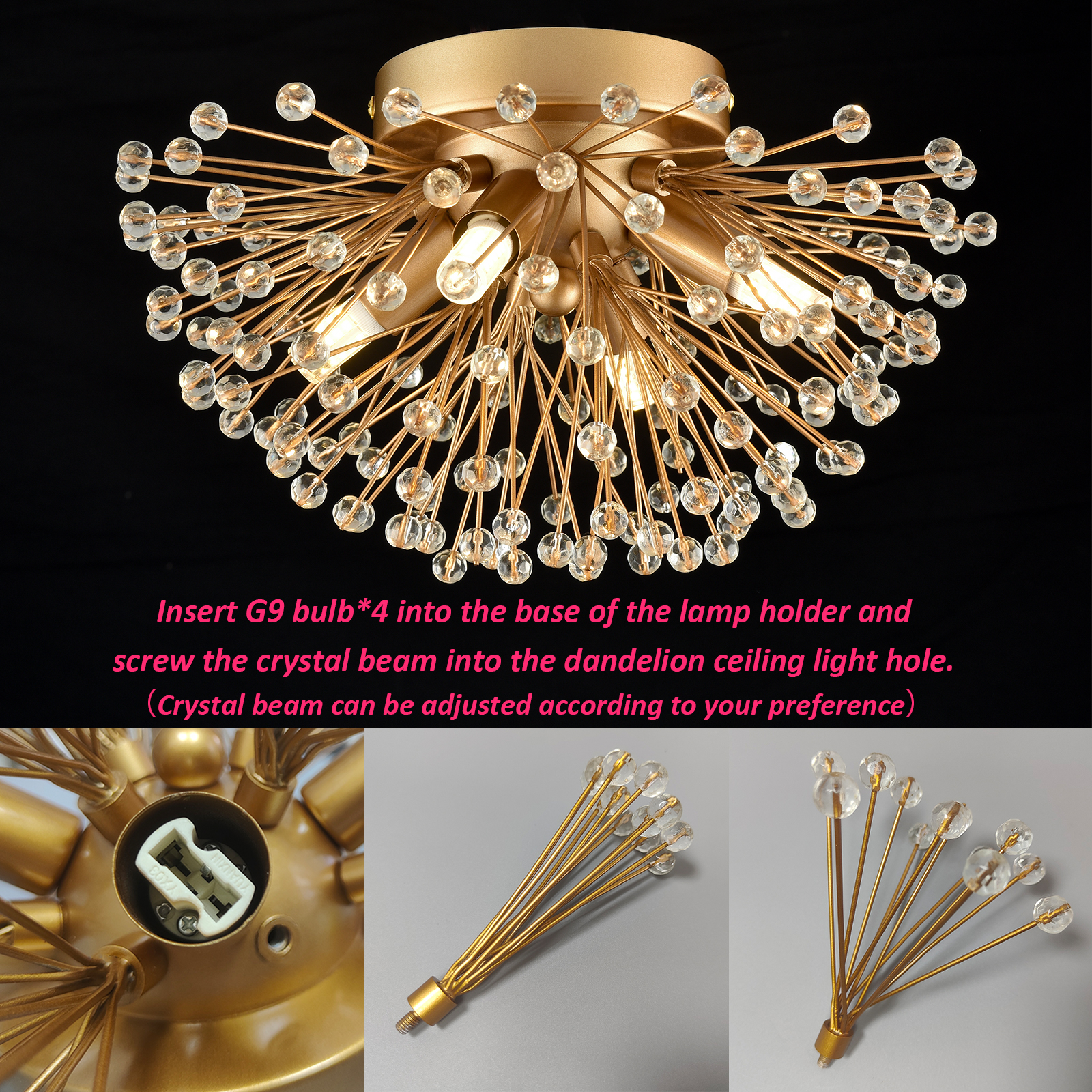 Showing off a rustproof gold finish, the crystal ceiling light effortlessly lends a nice pop of brightness to your living space. Inspired by the appearance of dandelion flowers, the light fixture encompasses glamour and whimsy. Boasting a multitude of K9 crystal branches and four lamp holders shooting out from the center sphere, it delivers a huge dose of contemporary sparkle and shine. Its crystal beads on the wires largely resemble hundreds of tiny flowers collected together into a composite flower head, providing a ton of eye appeal and packing a powerful, artistic punch to your home. A charming glow shines through the crystal branches, which creates intriguing light effects and shades.