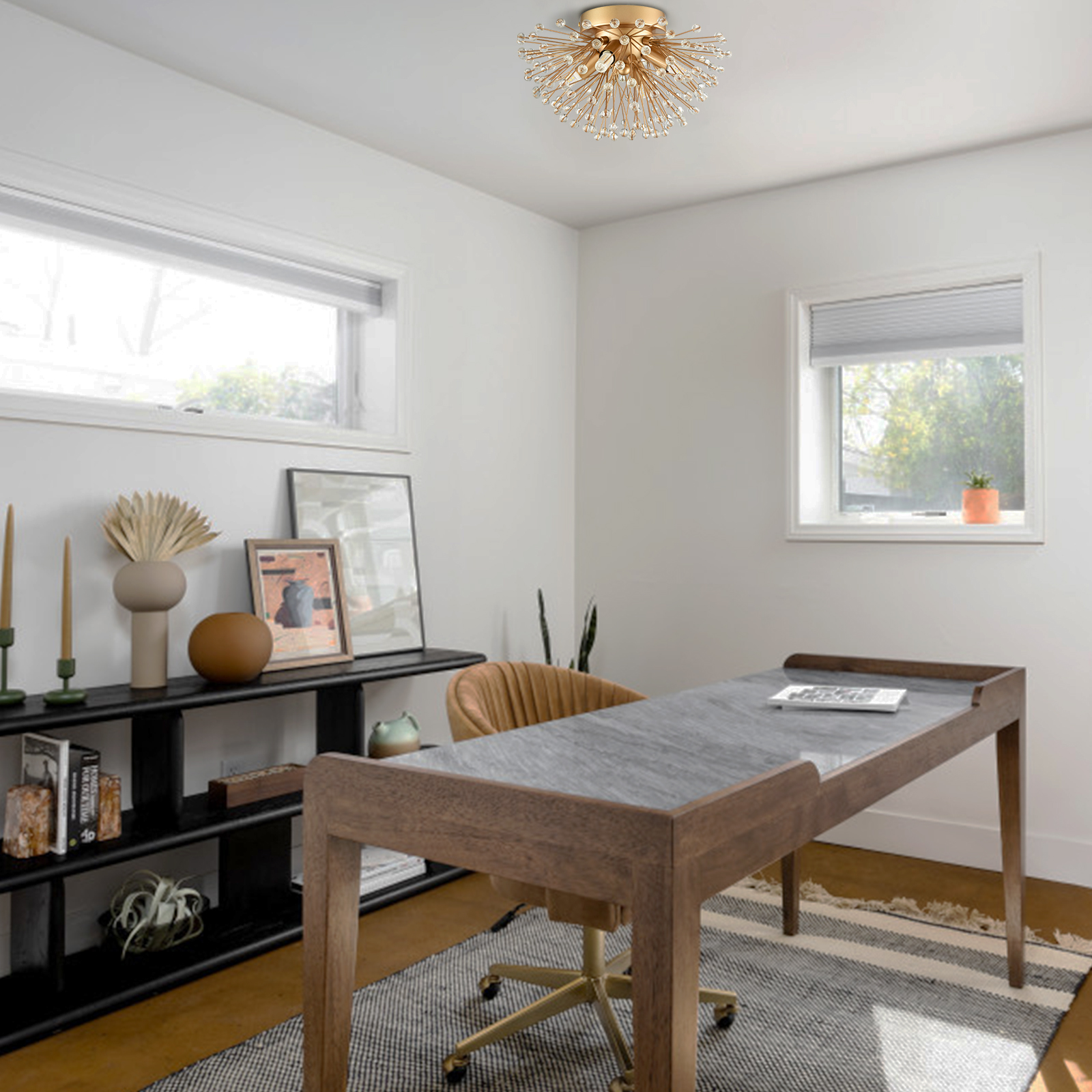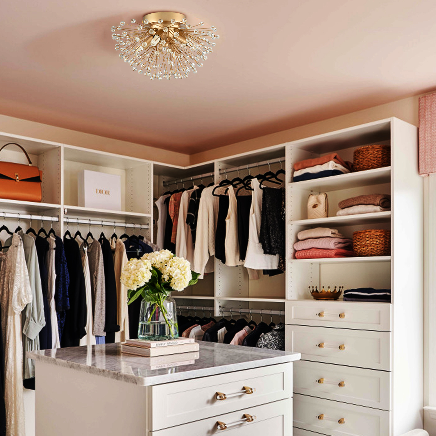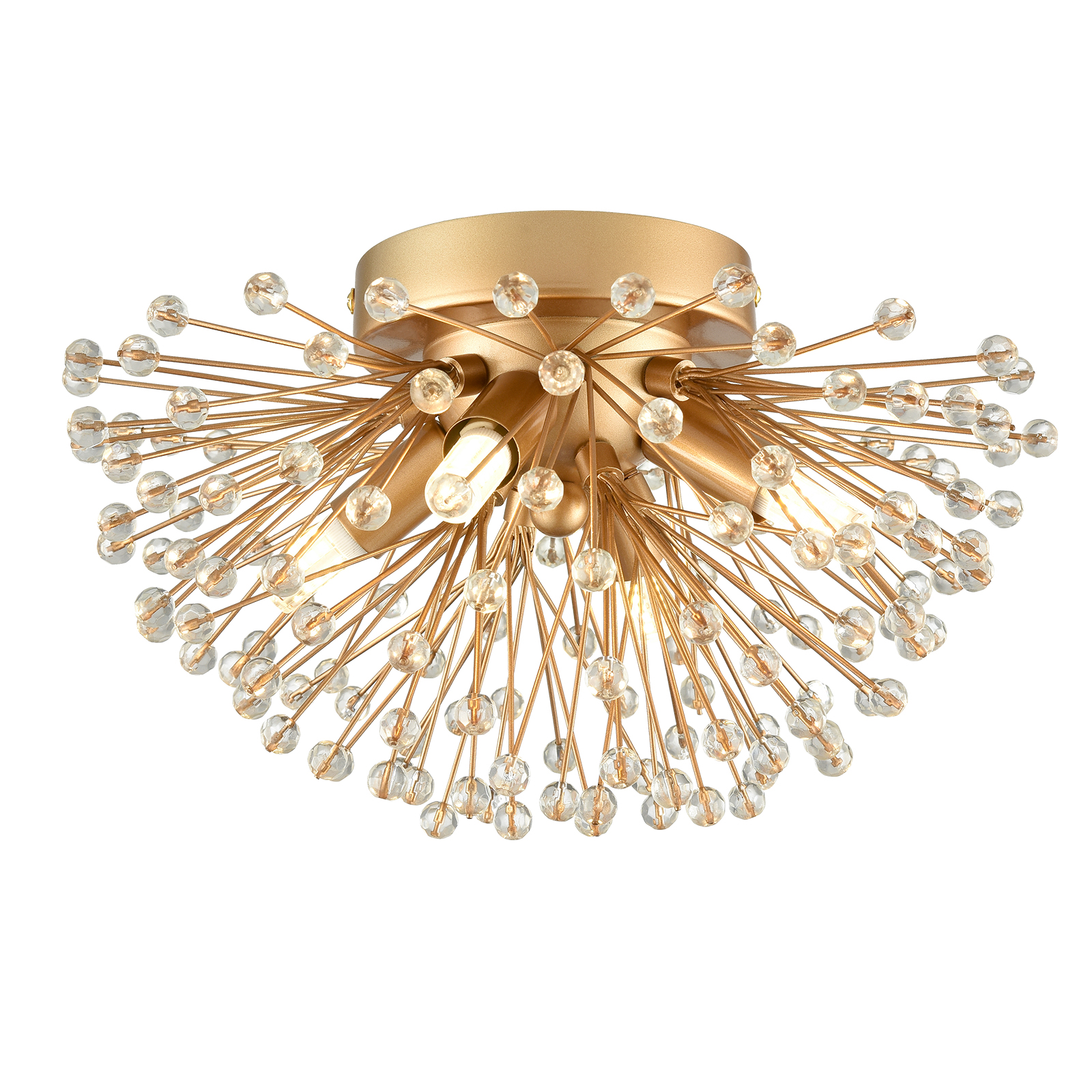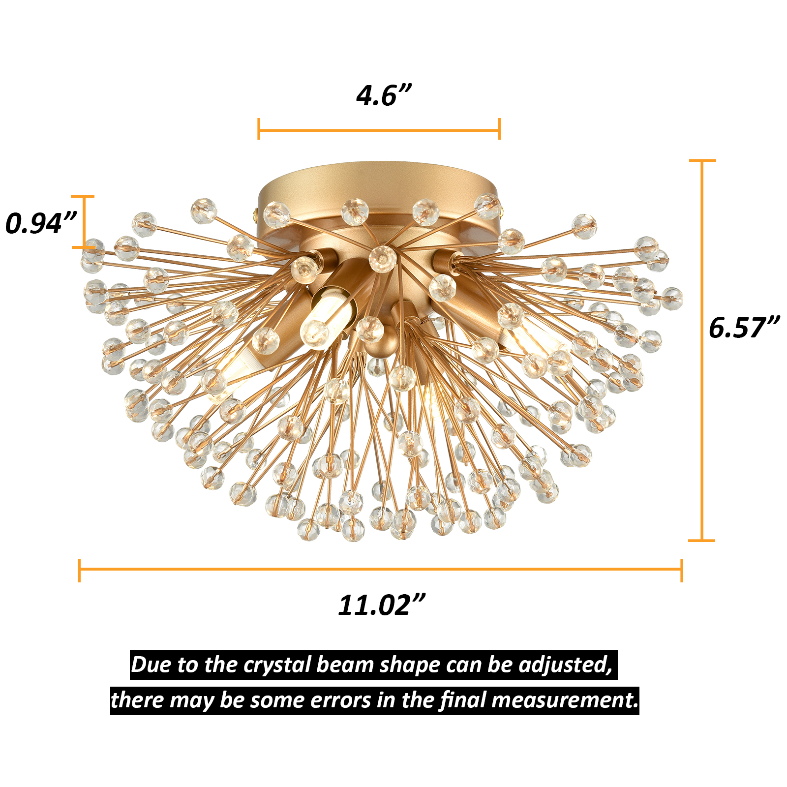 Showing off a rustproof gold finish, the crystal ceiling light effortlessly lends a nice pop of brightness to your living space. Inspired by the appearance of dandelion flowers, the light fixture encompasses glamour and whimsy. Boasting a multitude of K9 crystal branches and four lamp holders shooting out from the center sphere, it delivers a huge dose of contemporary sparkle and shine. Its crystal beads on the wires largely resemble hundreds of tiny flowers collected together into a composite flower head, providing a ton of eye appeal and packing a powerful, artistic punch to your home. A charming glow shines through the crystal branches, which creates intriguing light effects and shades.