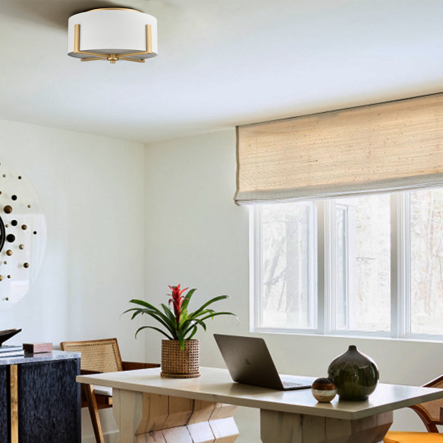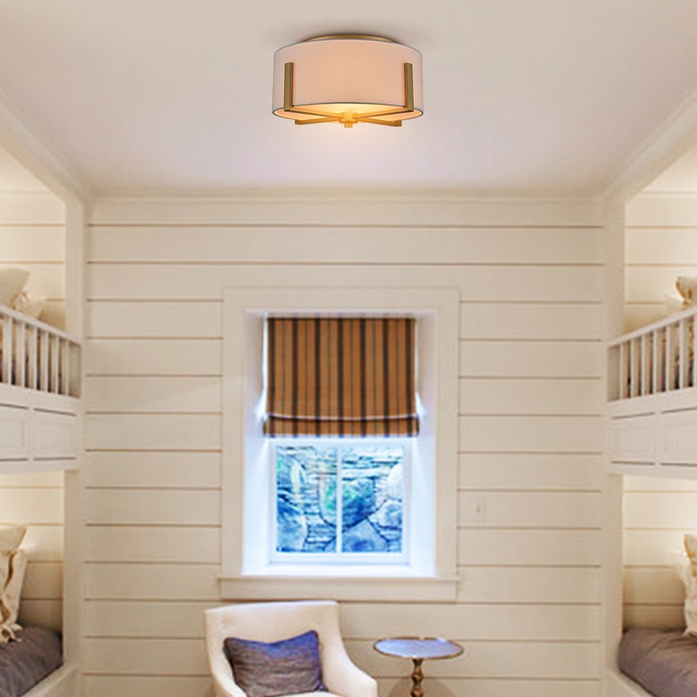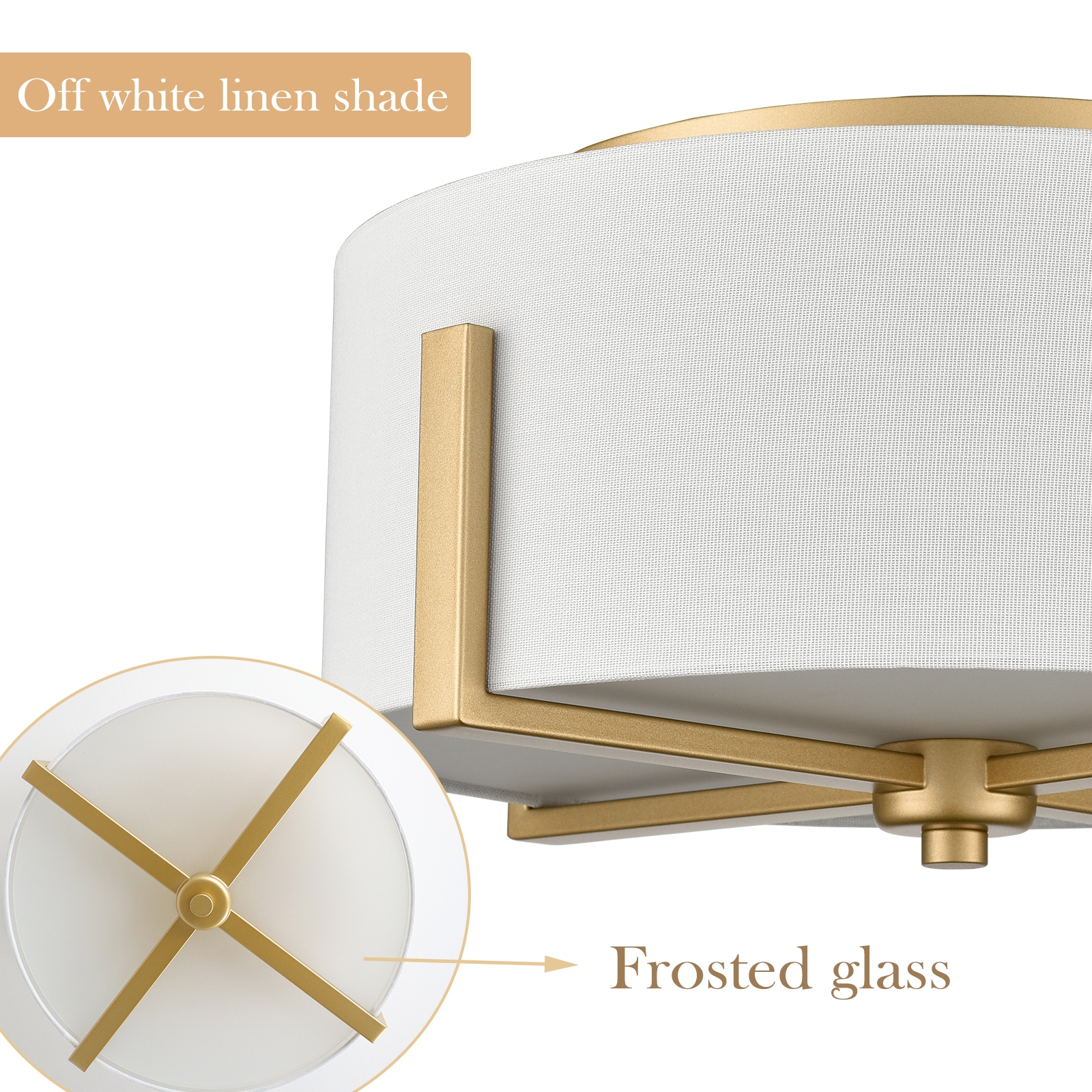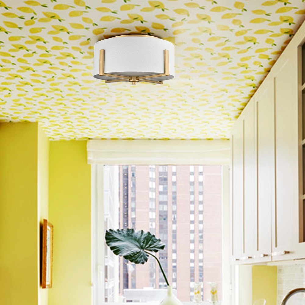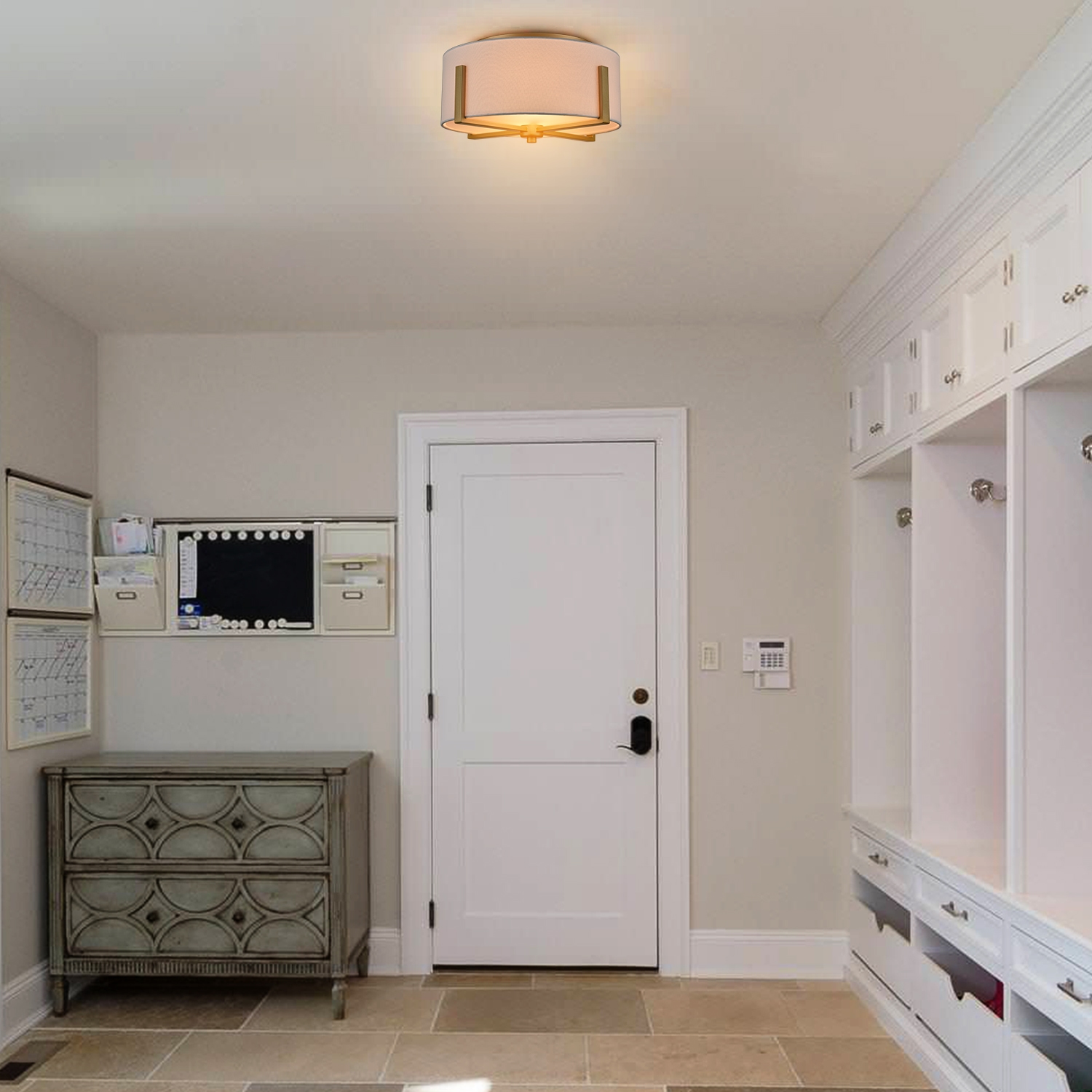 The gold flush mount ceiling light flaunts a rustproof gold finish, pepping up your living space with a bit of bling. Its white linen drum shade is held aloft by the four-pronged gold metal frame which brings rich visual interest to your interior. The light pouring through the linen drum shade is gently muted and fills the room without any glare. Its rounded drum shade gives your home a touch of geometry. Its gold finish contrasts the white linen drum shade and adds a ton of eye appeal to the space.