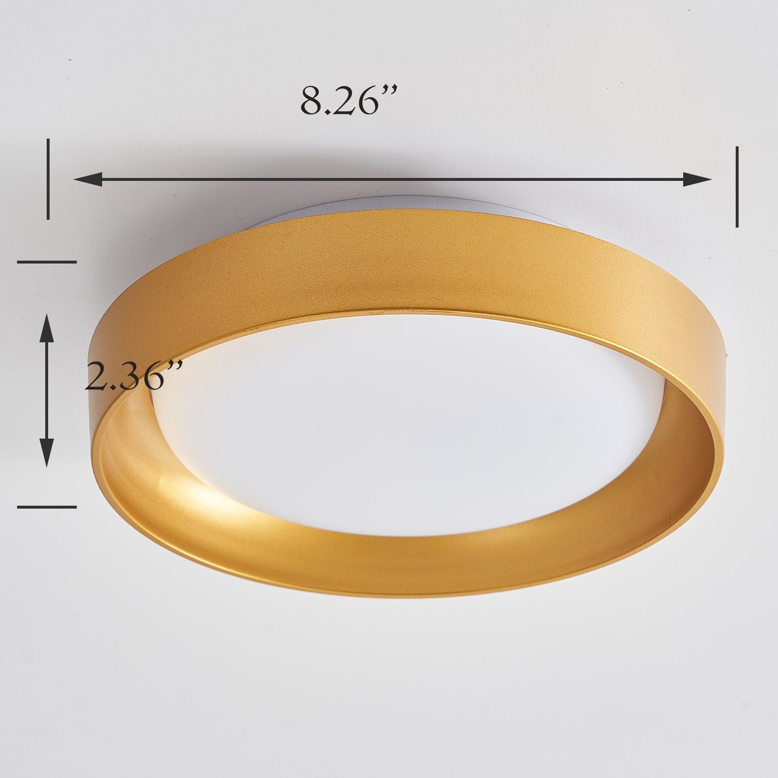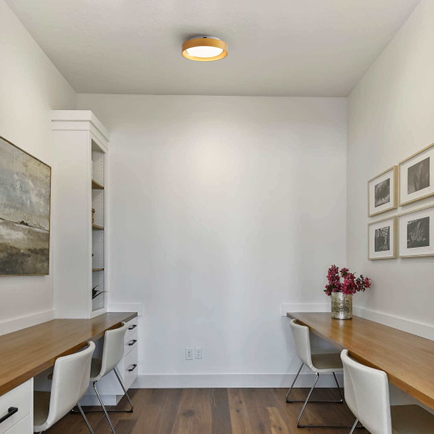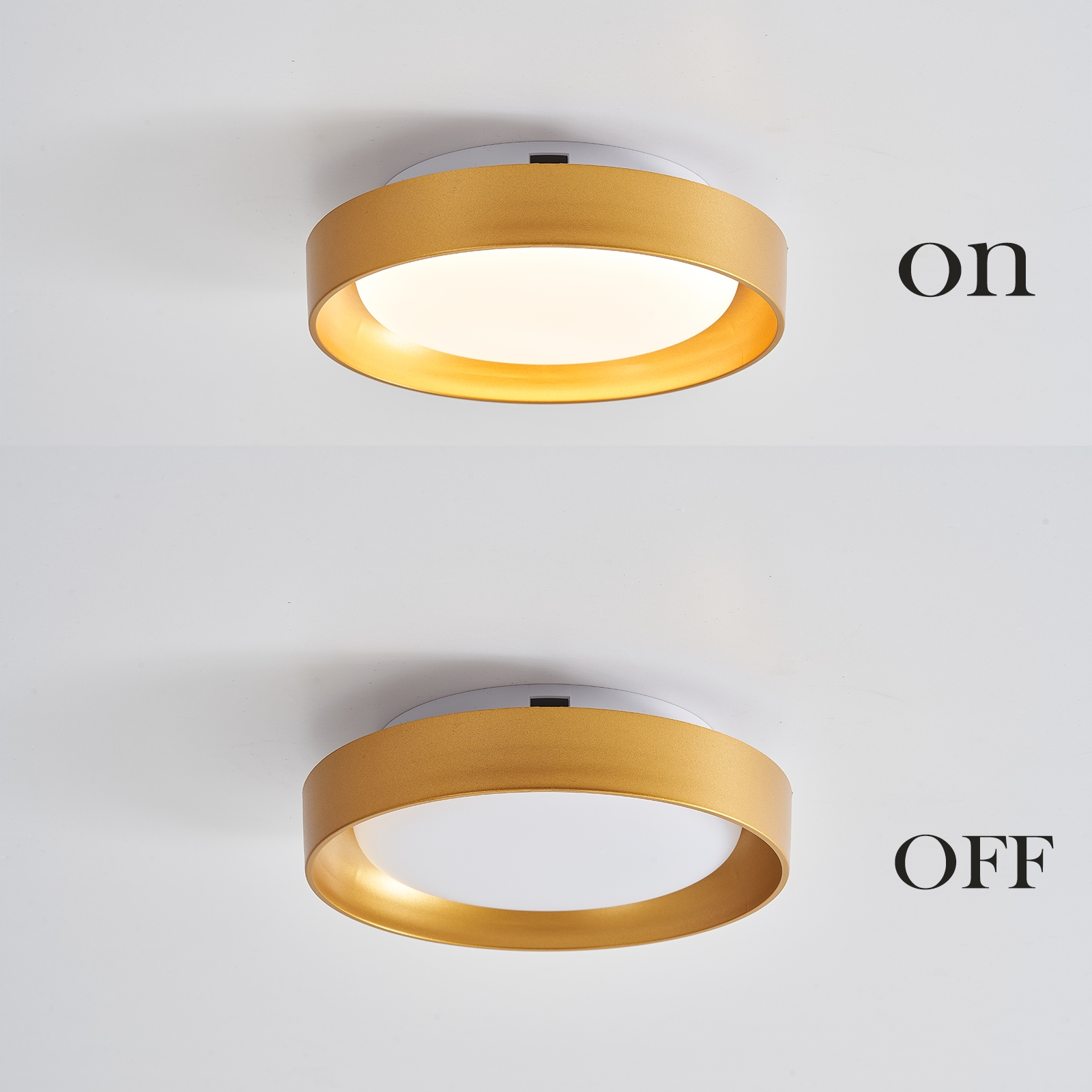 Flaunting a modern design, the LED flush mount ceiling light’s lamp body gives your living space a nice pop of sparkle with a gold finish while the lampshade flaunts a white finish. The rounded lampshade is crafted of polycarbonate while the rounded lamp body is made from ABS plastic. Its gold lamp body contrasts the white lampshade and adds alluring visual interest to the living area. Its polycarbonate lampshade allows a soft glow to pass right through, filling the space without any glare. A mix of finishes encompasses both modern-inspired qualities and a touch of geometry, yet maintains a minimalist vibe.