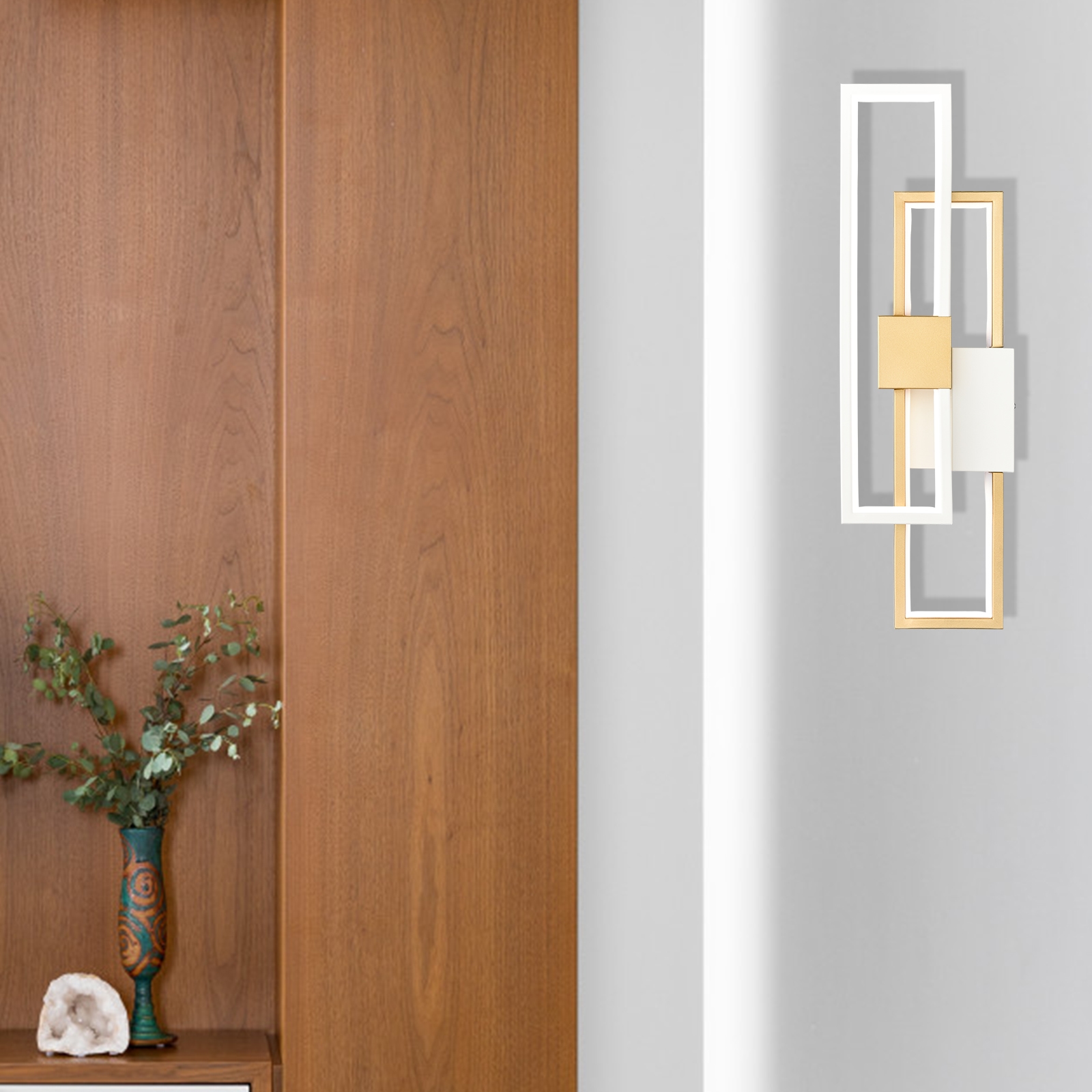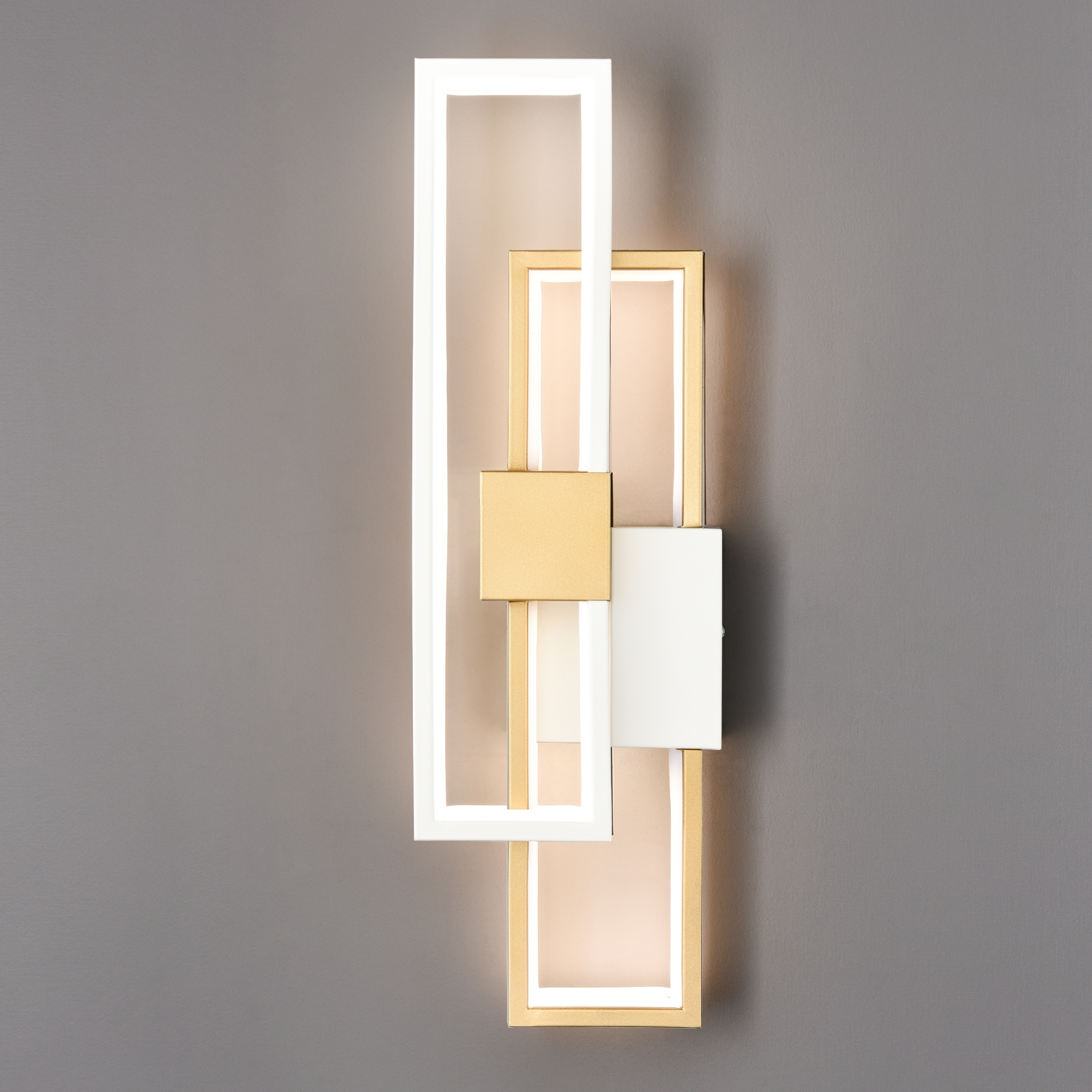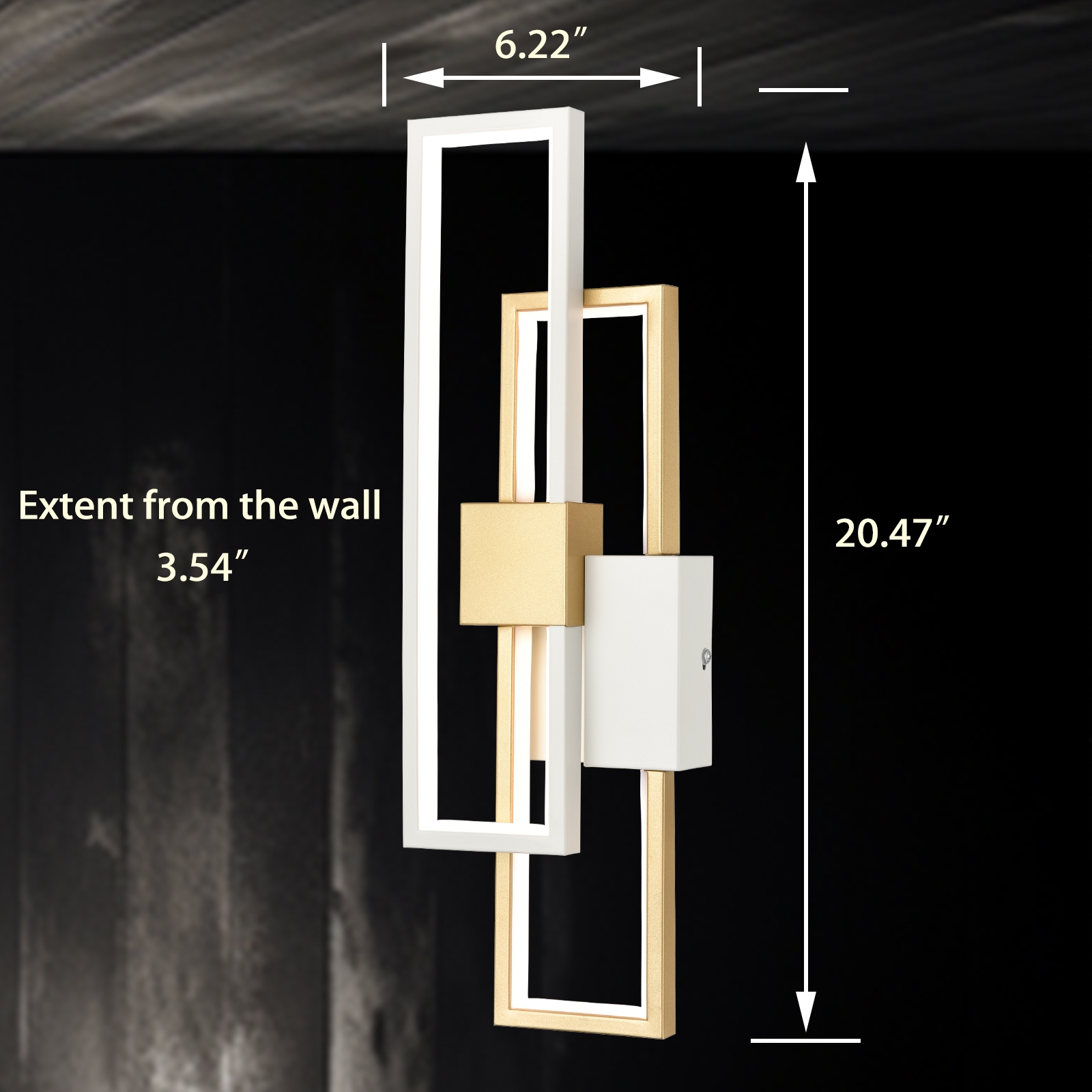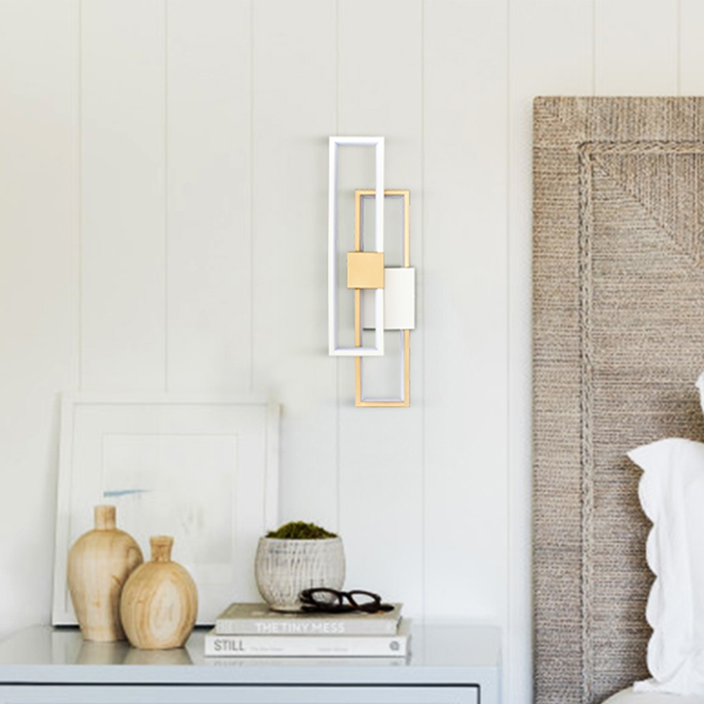Two of the gold LED wall sconce’s metal frames effortlessly lend a nice pop of shimmer to your living space with a gold finish. The rest of the light fixture is dressed in a white finish, adding a touch of modern elegance to your interior. A mix of finishes encompasses both shiny accent and mid-century elements, yet maintains an industrial edge. It shows off a simple but edgy design as an energy-efficient wall light. Two rectangular metal frames intersect and are held aloft by the smaller rectangular metal frames in the middle, presenting an intricate yet whimsical look. A charming glow shines through the light, filling the space without any glare. It supplies a dash of drama and showcases the beauty of geometry. It can be installed horizontally or vertically.