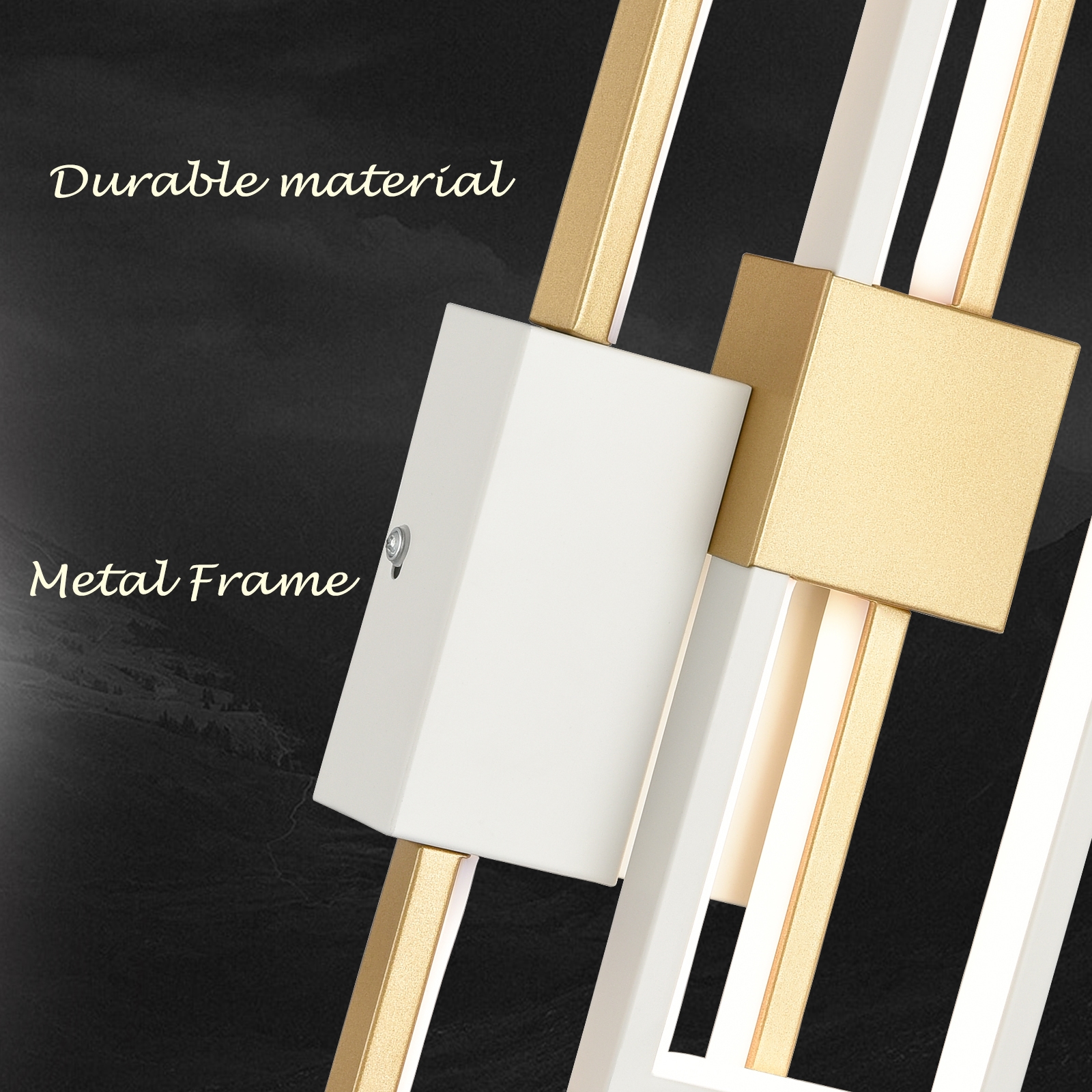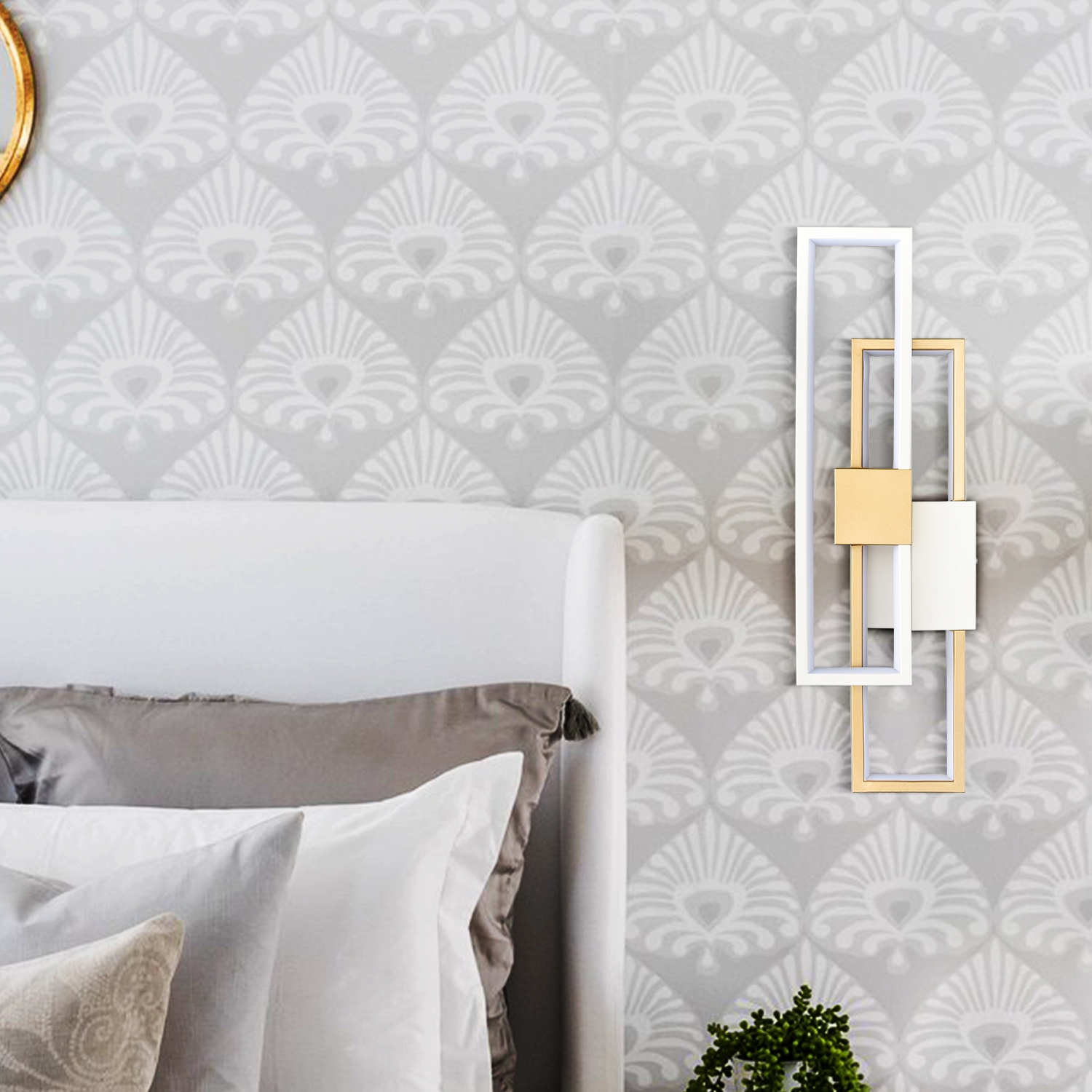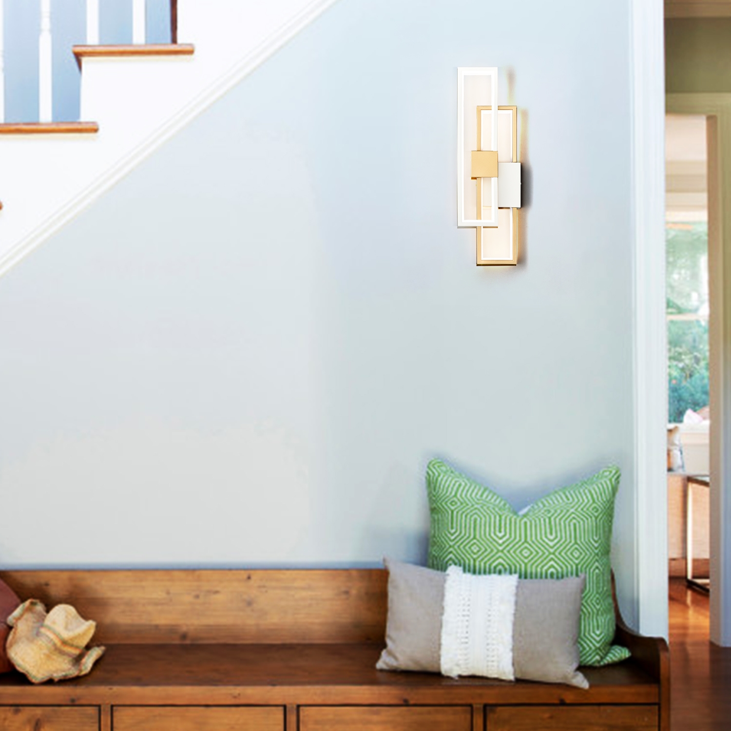 Two of the gold LED wall sconce’s metal frames effortlessly lend a nice pop of shimmer to your living space with a gold finish. The rest of the light fixture is dressed in a white finish, adding a touch of modern elegance to your interior. A mix of finishes encompasses both shiny accent and mid-century elements, yet maintains an industrial edge. It shows off a simple but edgy design as an energy-efficient wall light. Two rectangular metal frames intersect and are held aloft by the smaller rectangular metal frames in the middle, presenting an intricate yet whimsical look. A charming glow shines through the light, filling the space without any glare. It supplies a dash of drama and showcases the beauty of geometry. It can be installed horizontally or vertically.