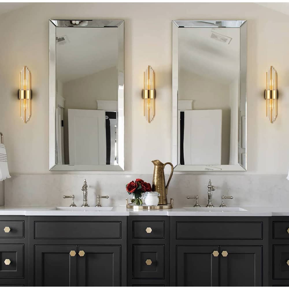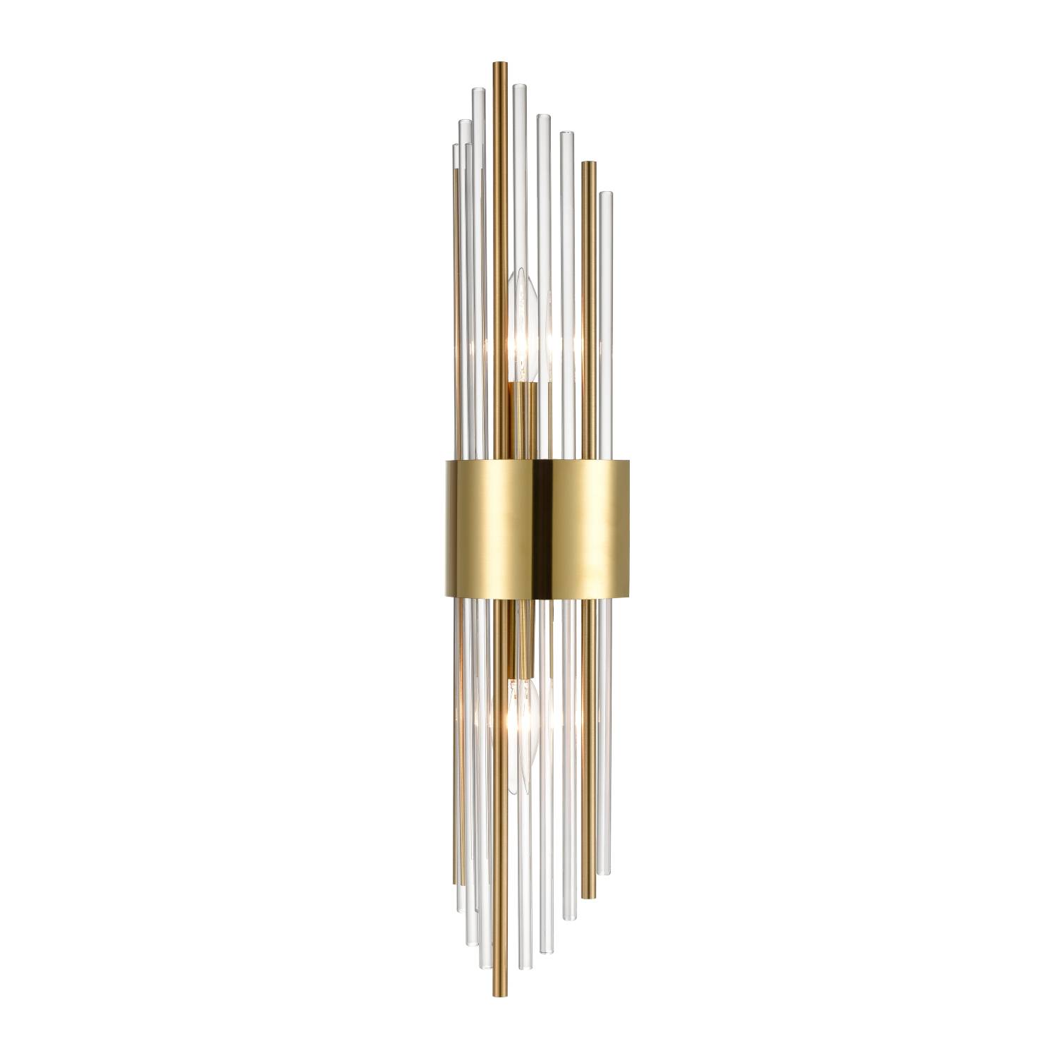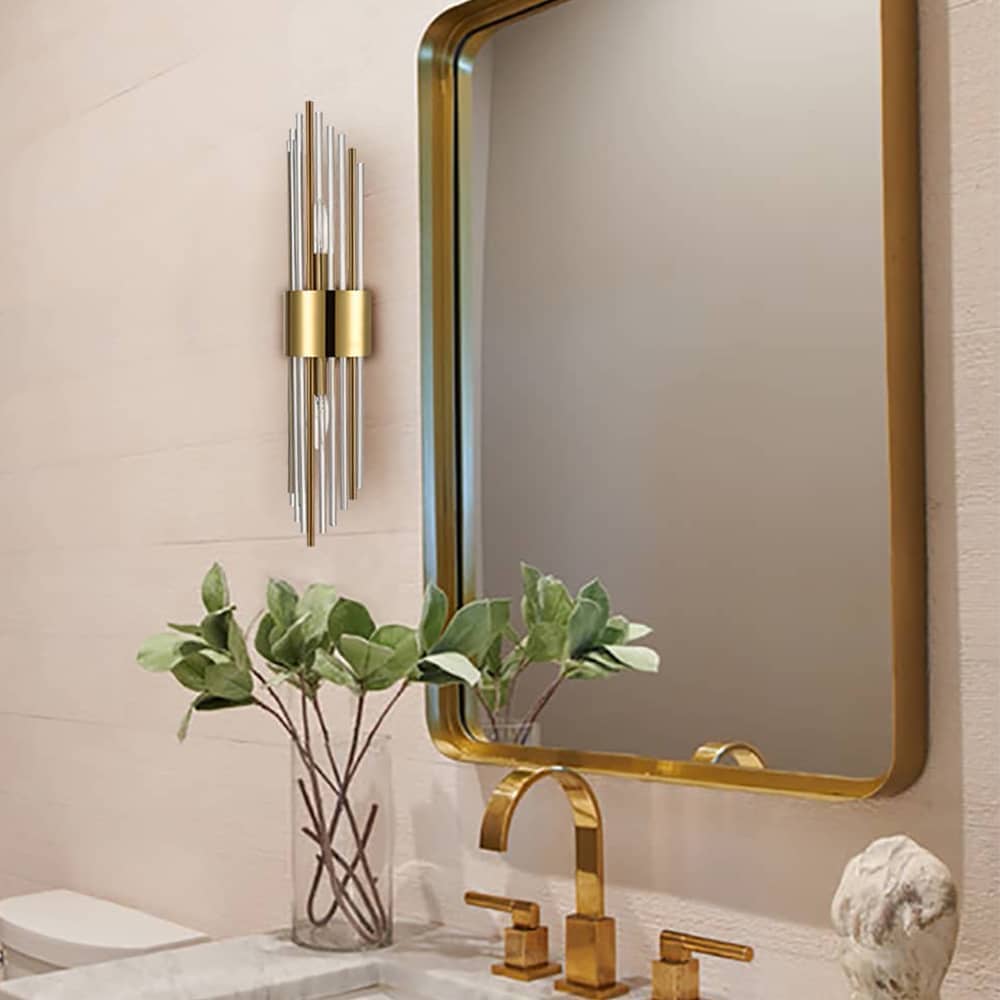 Inspired by the idea of twin buildings, the gold metal wall sconces boast a rustproof gold finish, pepping up your living space with a boost of sparkle. They are brimming with modern style with a mix of metal rods and crystal clear glass rods and make a dramatic statement in your home. Showing off the unique texture of brushed metal, their metal lamp bodies are shaped by integrated welding. Their mirror-polished transparent glass rods flaunt even light distribution and allow a soft glow to pass right through, creating intriguing light effects.