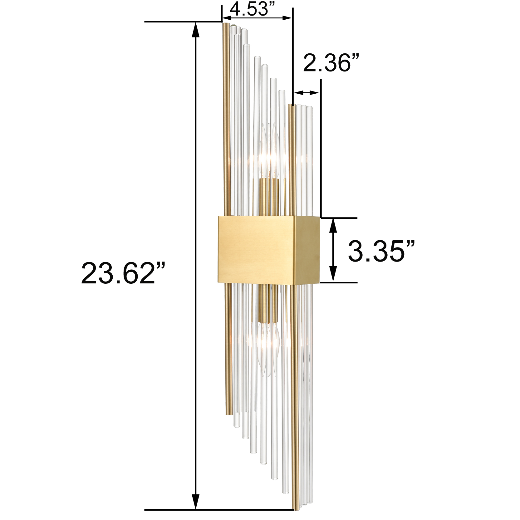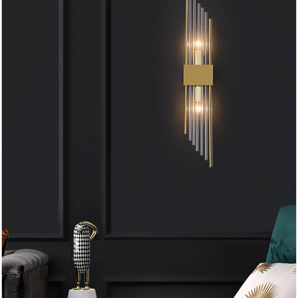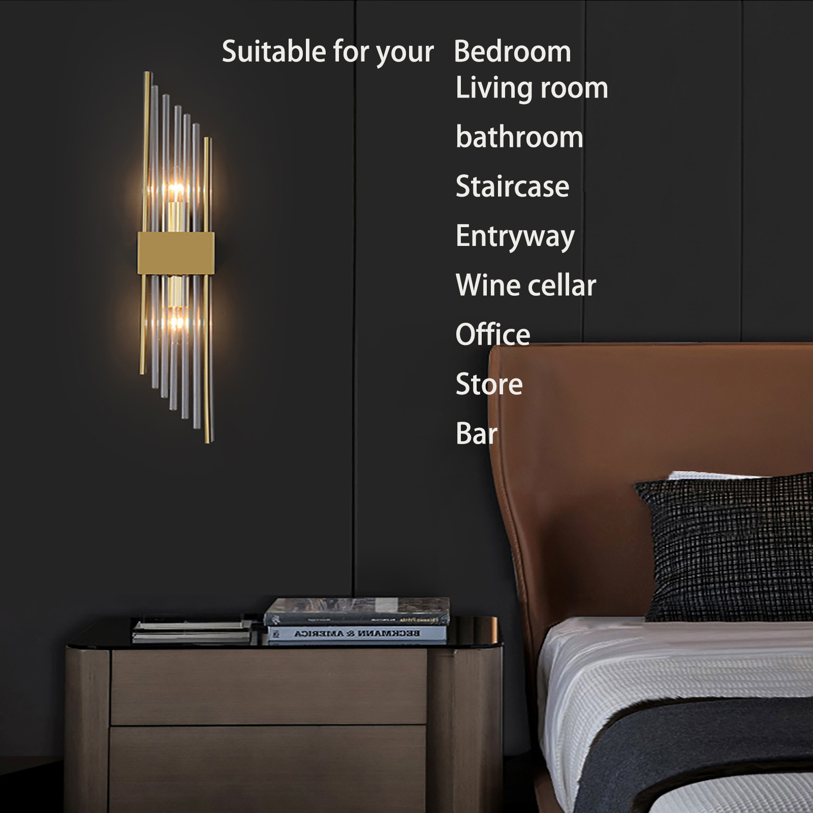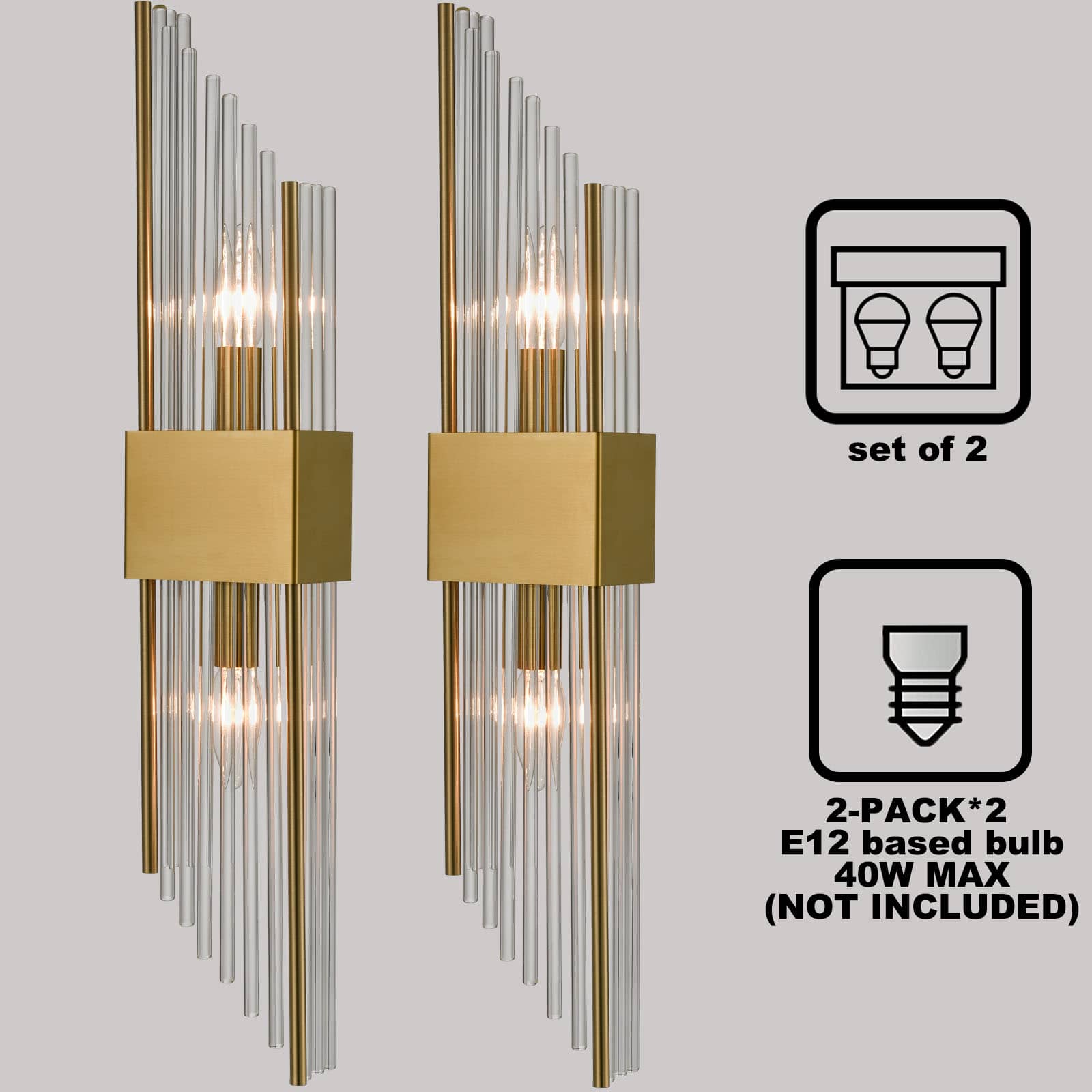 Inspired by the idea of twin buildings, the brass metal wall sconces boast an electroplated titanium brass finish, pepping up your living space with glitzy sparkle. Featuring an impressive overall design, the wall sconces are brimming with mid-century modern style with a mix of metal rods and clear glass rods and make a dramatic statement in your home. The wall sconces’ glass and metal rods encircle two exposed bulbs in the middle, rounding out the design with a large dose of texture. They are show-stopping additions to your living space with their edgy look. Each wall sconce is compatible with two 40-watt E12-base bulbs (NOT included).