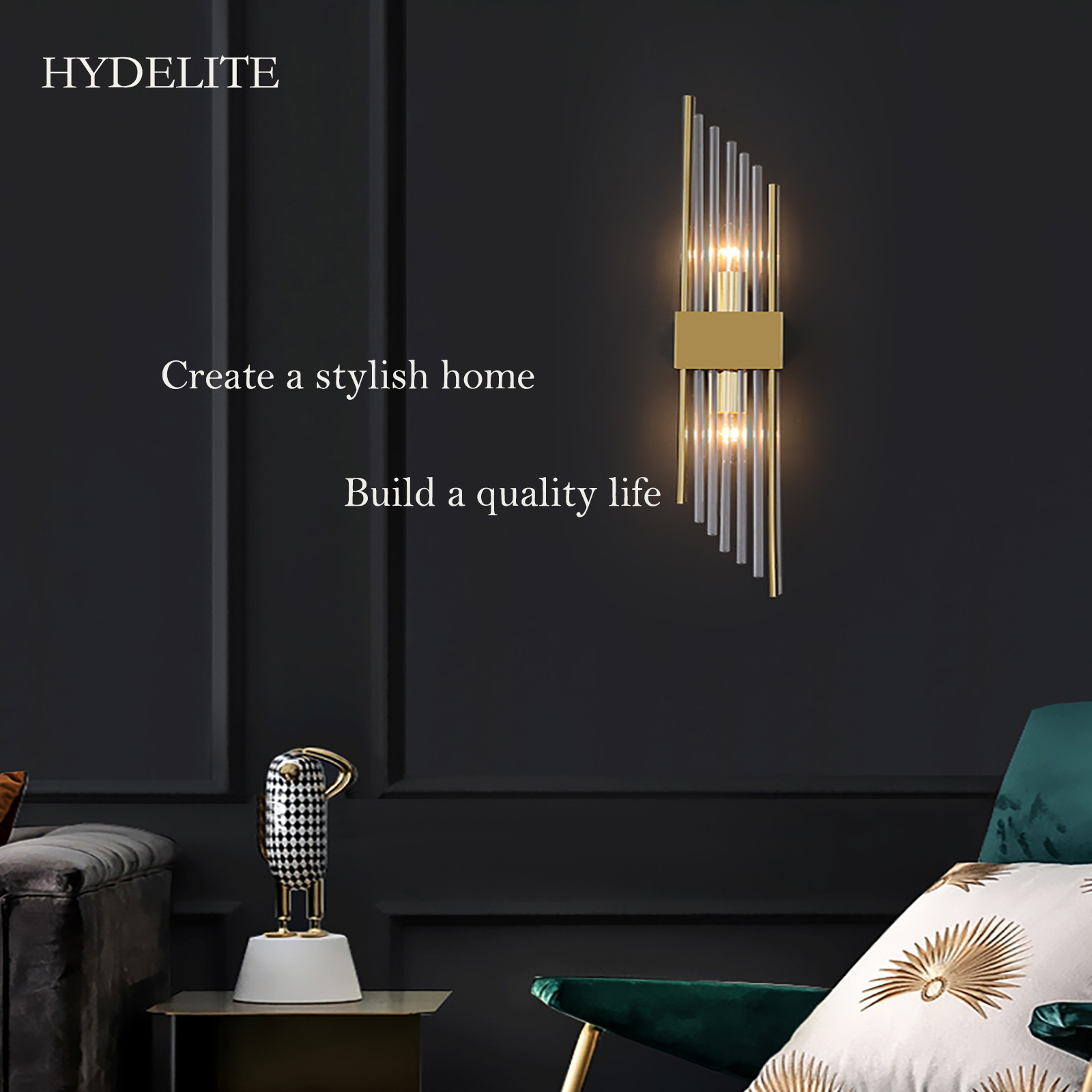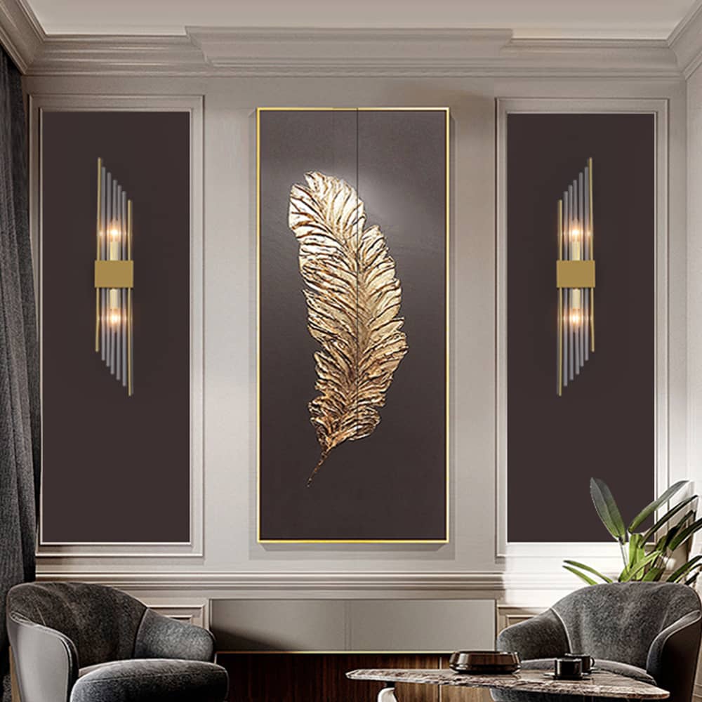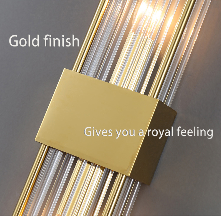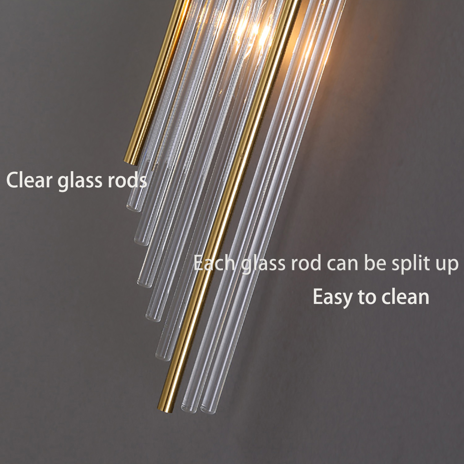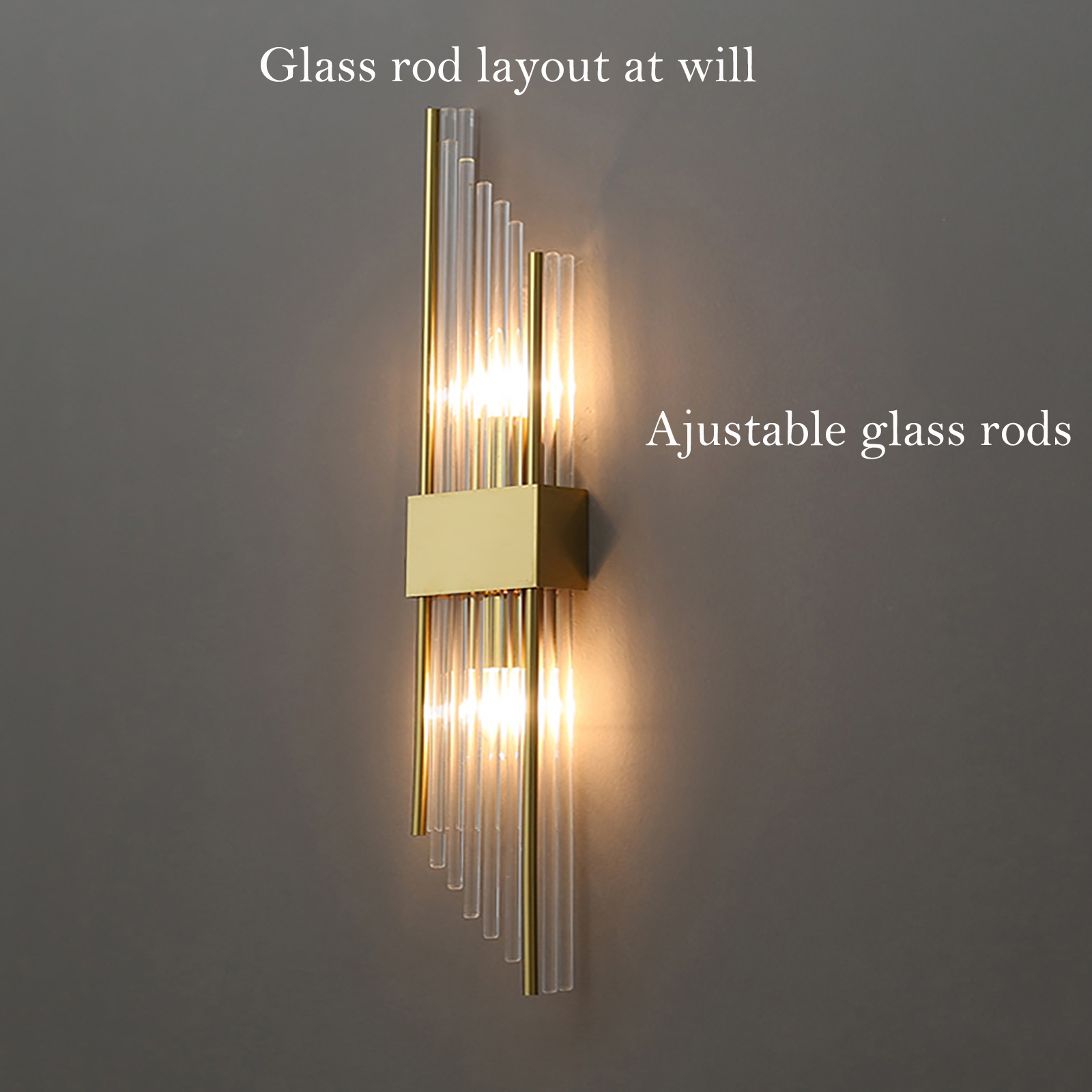 Inspired by the idea of twin buildings, the brass metal wall sconces boast an electroplated titanium brass finish, pepping up your living space with glitzy sparkle. Featuring an impressive overall design, the wall sconces are brimming with mid-century modern style with a mix of metal rods and clear glass rods and make a dramatic statement in your home. The wall sconces’ glass and metal rods encircle two exposed bulbs in the middle, rounding out the design with a large dose of texture. They are show-stopping additions to your living space with their edgy look. Each wall sconce is compatible with two 40-watt E12-base bulbs (NOT included).
