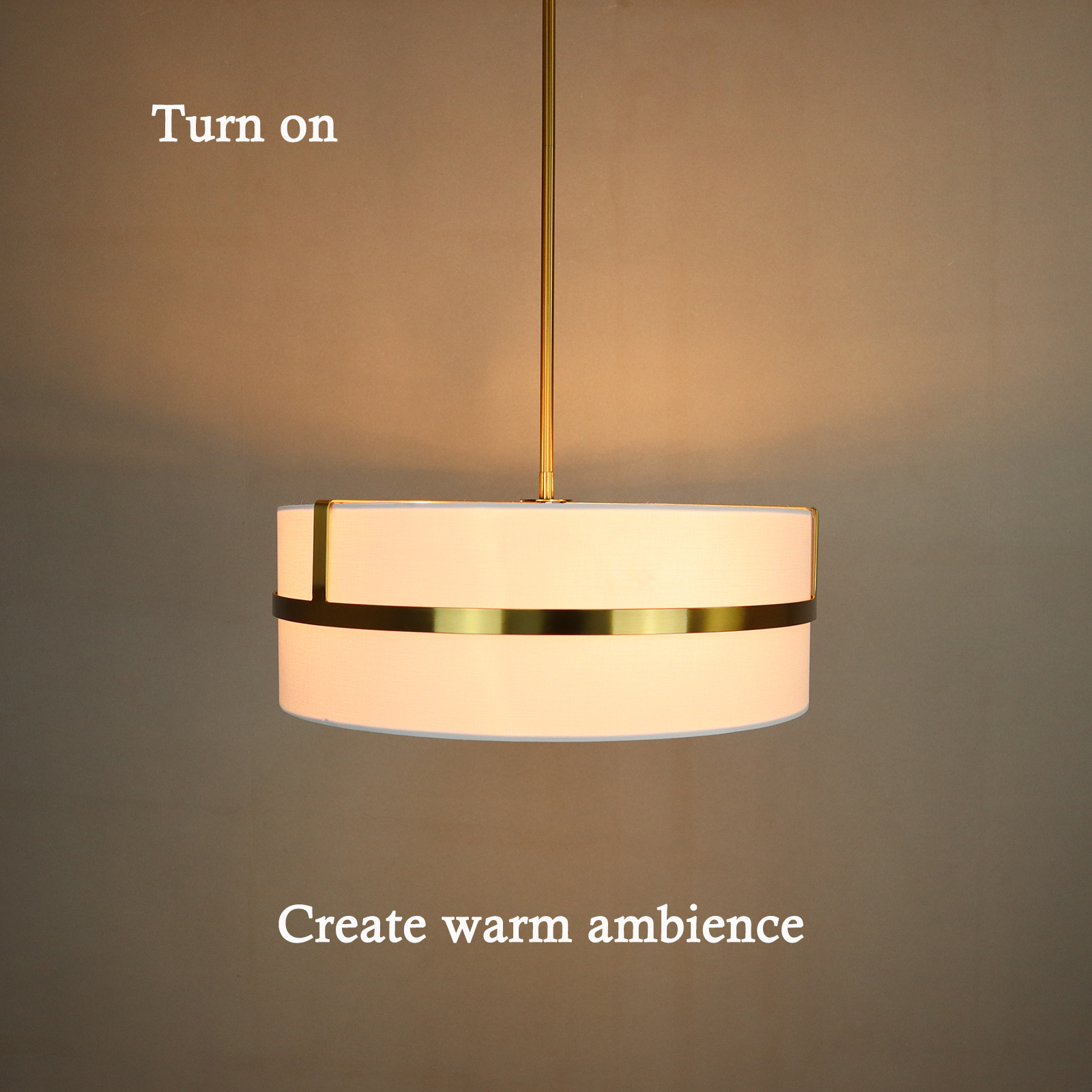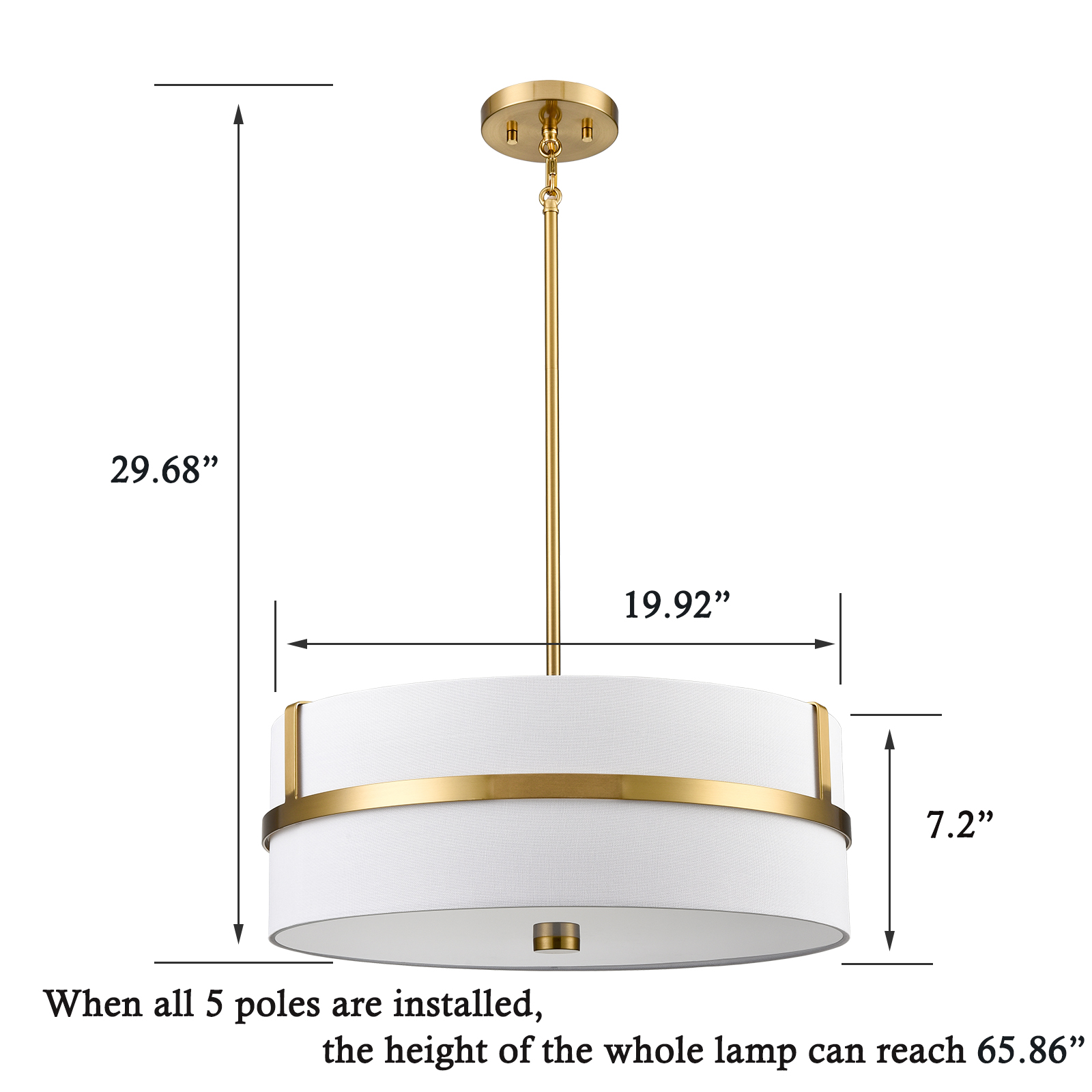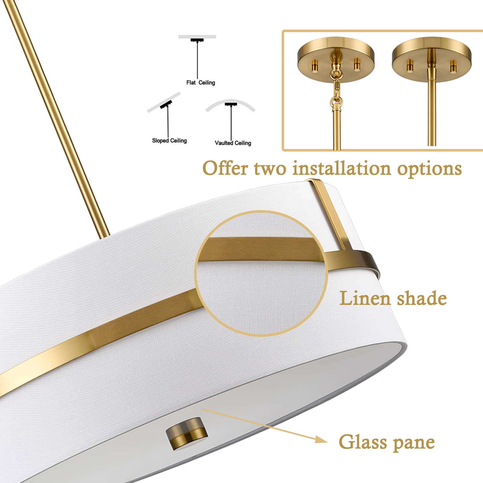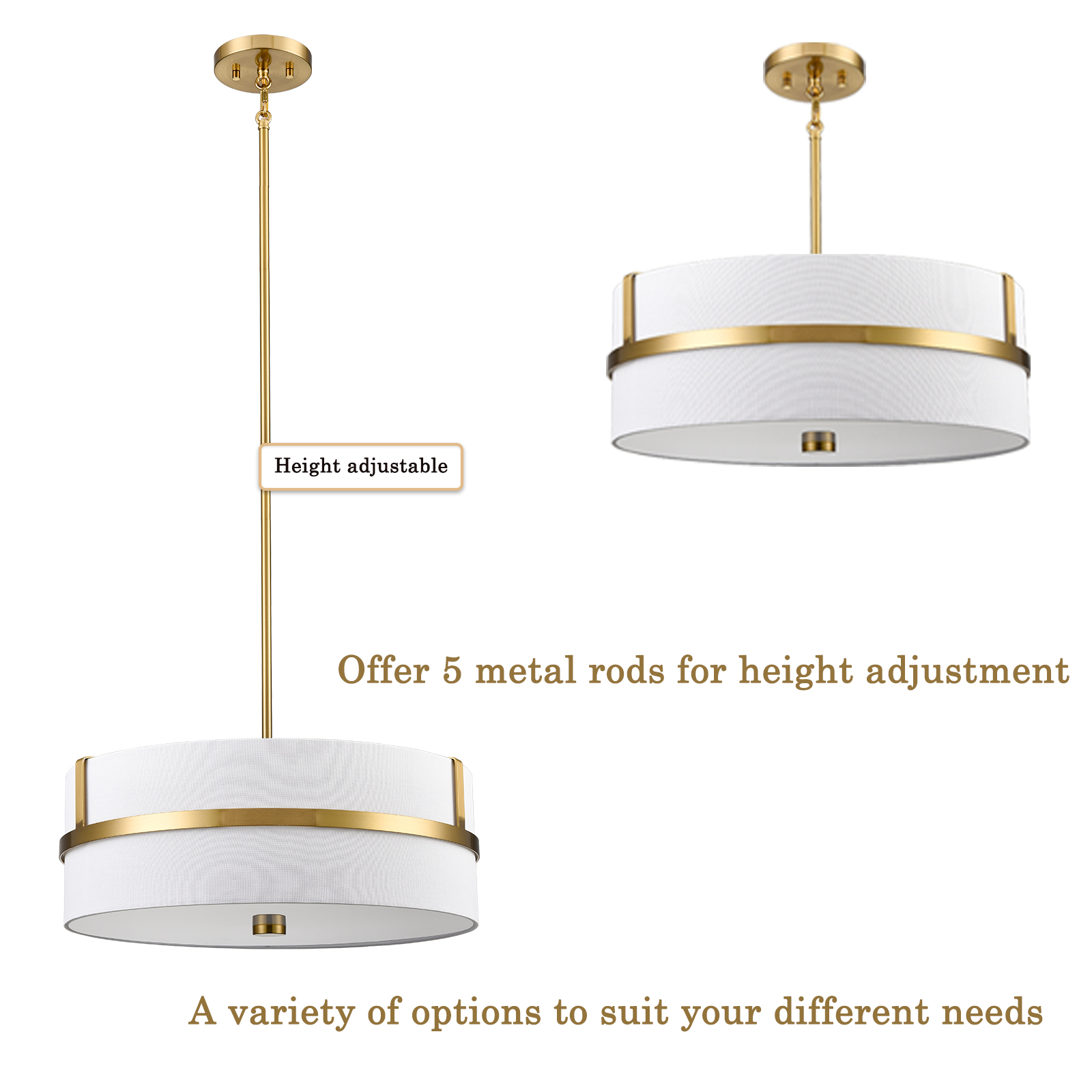 The gold pendant light flaunts a rustproof electrophoretic gold finish, pepping up your living space with a bit of bling. Its white linen drum shade is held aloft by the gold metal frame which brings rich visual interest to your interior. Its rounded drum shade gives your home a touch of geometry. Its gold finish contrasts the white linen drum shade and adds a ton of eye appeal to the space. It comes with 4 12-inch rods and one 6-inch rod. With an adapter, it can accommodate both sloped or vaulted ceilings. You can either directly screw the rods into the canopy or connect the rods and the canopy with the screw collar loops and the carabiners.