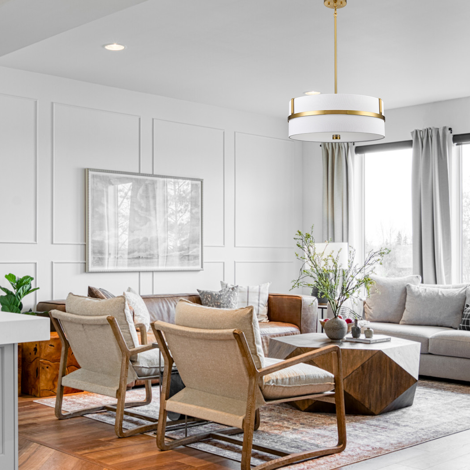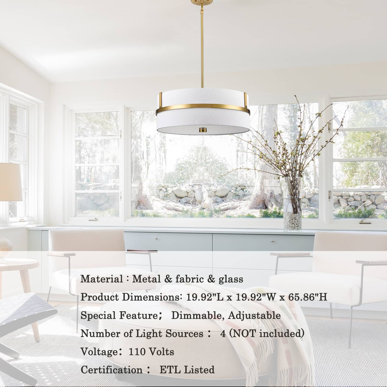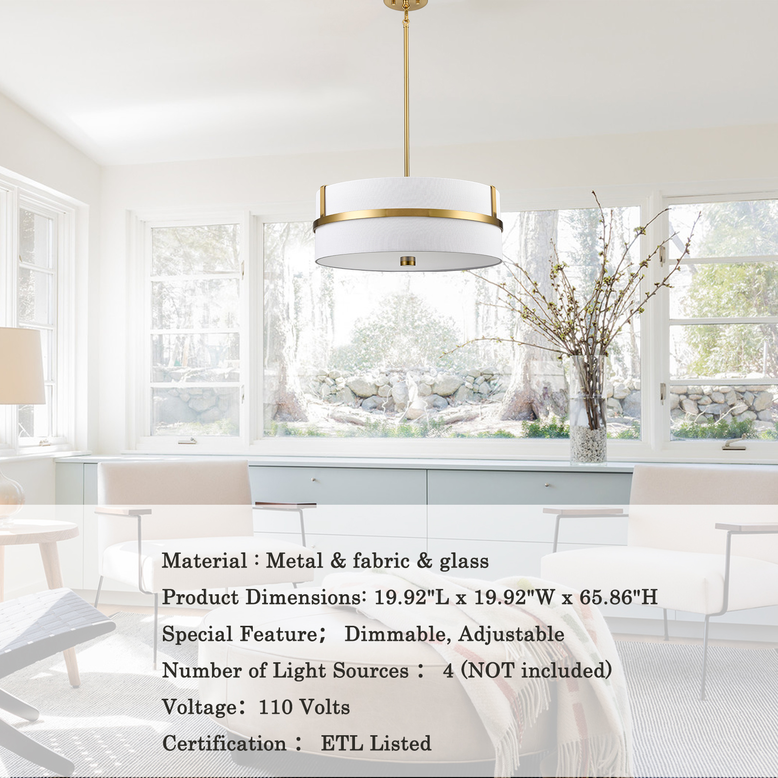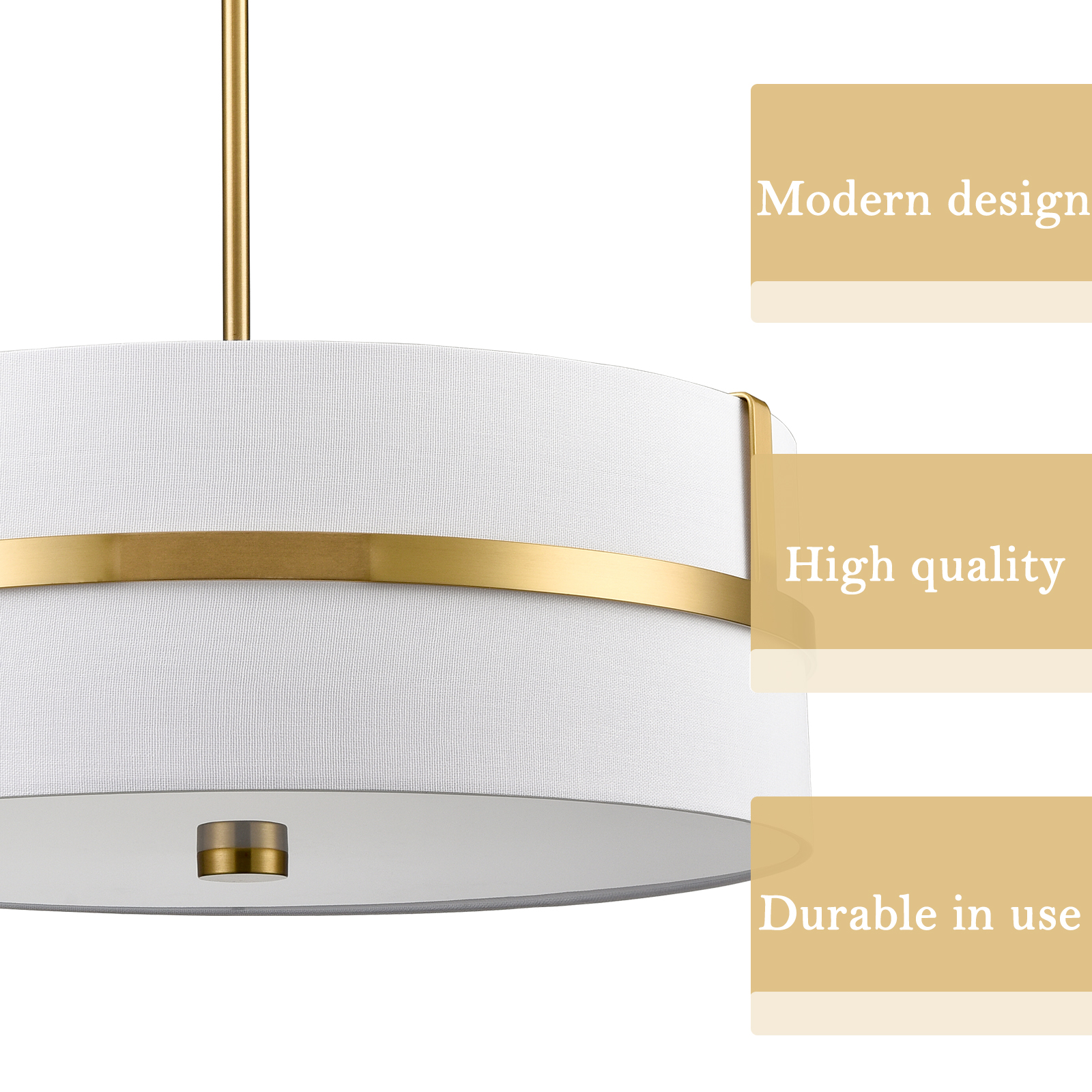 The gold pendant light flaunts a rustproof electrophoretic gold finish, pepping up your living space with a bit of bling. Its white linen drum shade is held aloft by the gold metal frame which brings rich visual interest to your interior. Its rounded drum shade gives your home a touch of geometry. Its gold finish contrasts the white linen drum shade and adds a ton of eye appeal to the space. It comes with 4 12-inch rods and one 6-inch rod. With an adapter, it can accommodate both sloped or vaulted ceilings. You can either directly screw the rods into the canopy or connect the rods and the canopy with the screw collar loops and the carabiners.
