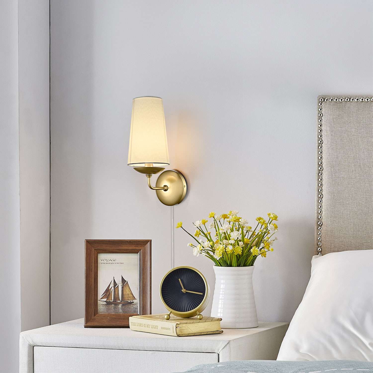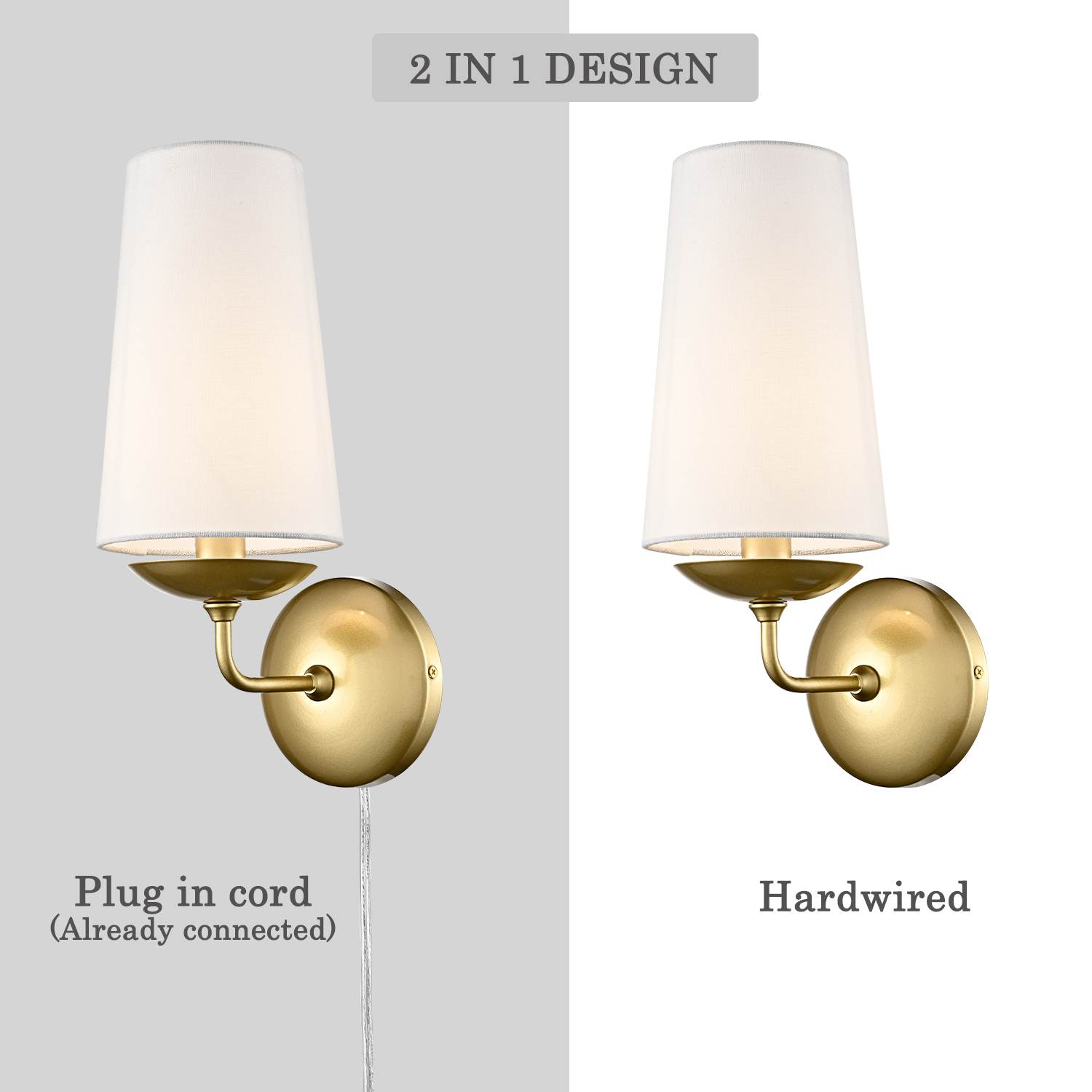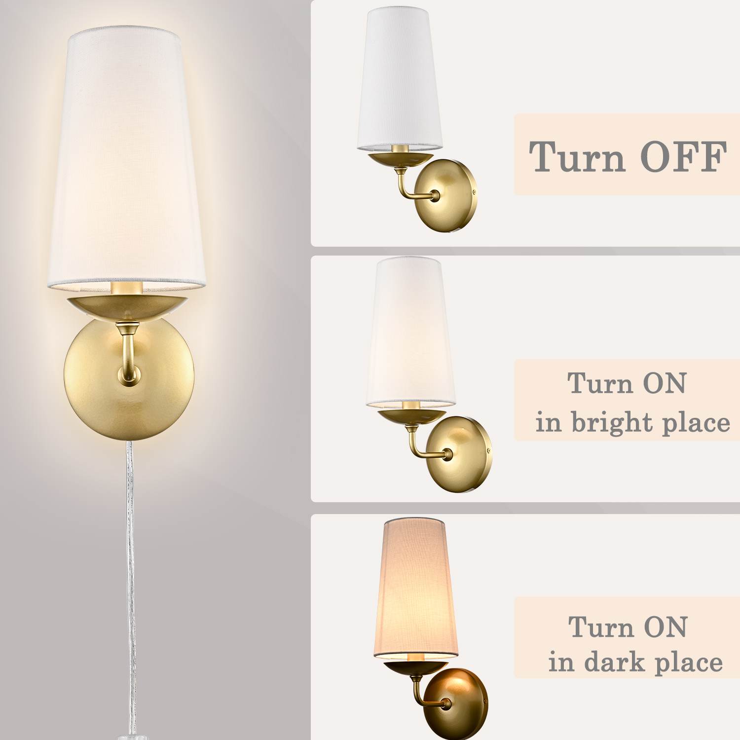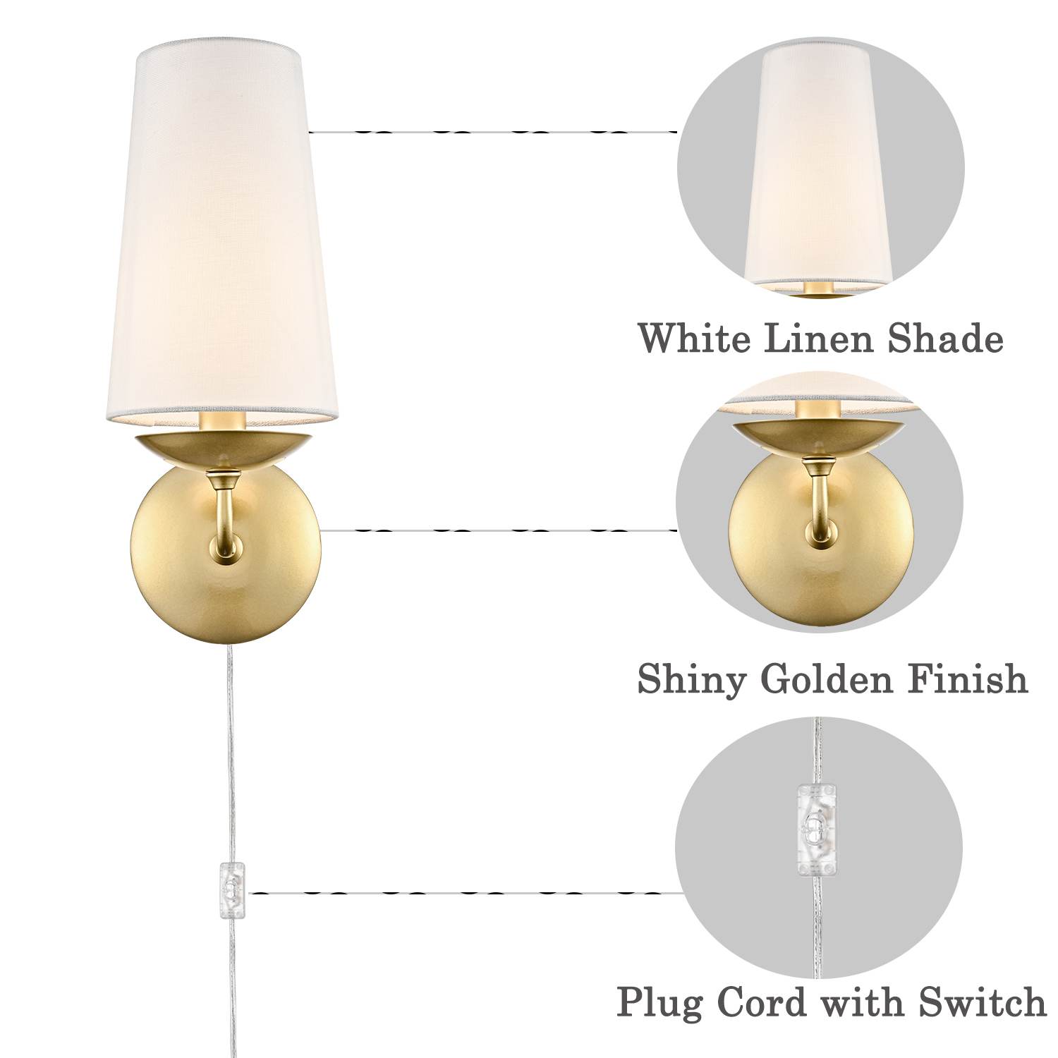 The gold plug-in wall sconces’ canopies, lamp holders, and arms flaunt a rustproof shiny gold finish, sprucing up your interior with a bit of metallic pizzazz. Their elongated white linen cone shades cast an enchanting aura of elegance and make for a tasteful statement in your home. The light pouring through the linen lampshades is gently muted and fills the room without any glare. Their white linen cone shades contrast the gold finish and add alluring visual interest to the living area. Each wall sconce comes with a 78.74-inch plug-in cord. The switches on the plug-in cords are just on/off switches without a dimming function.
