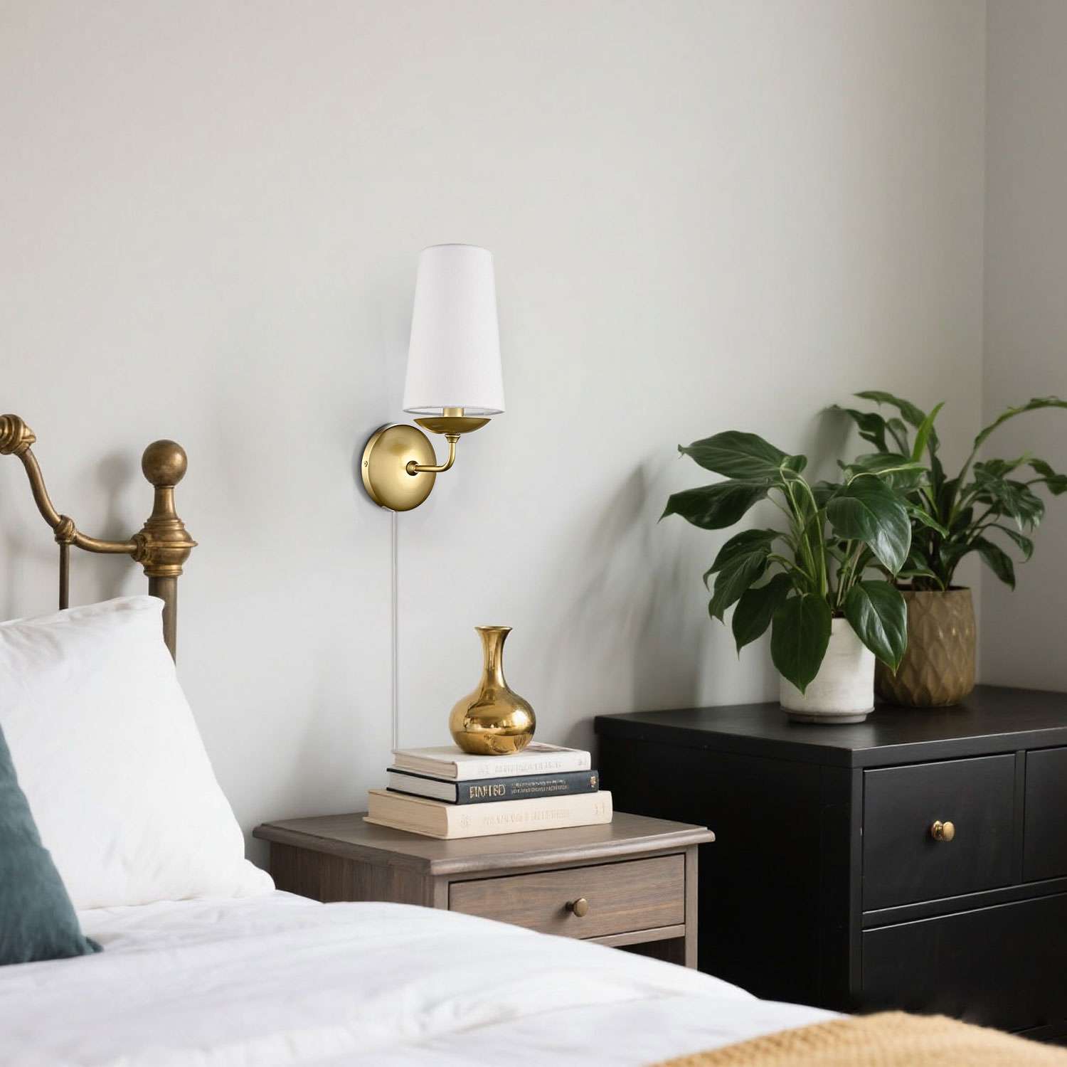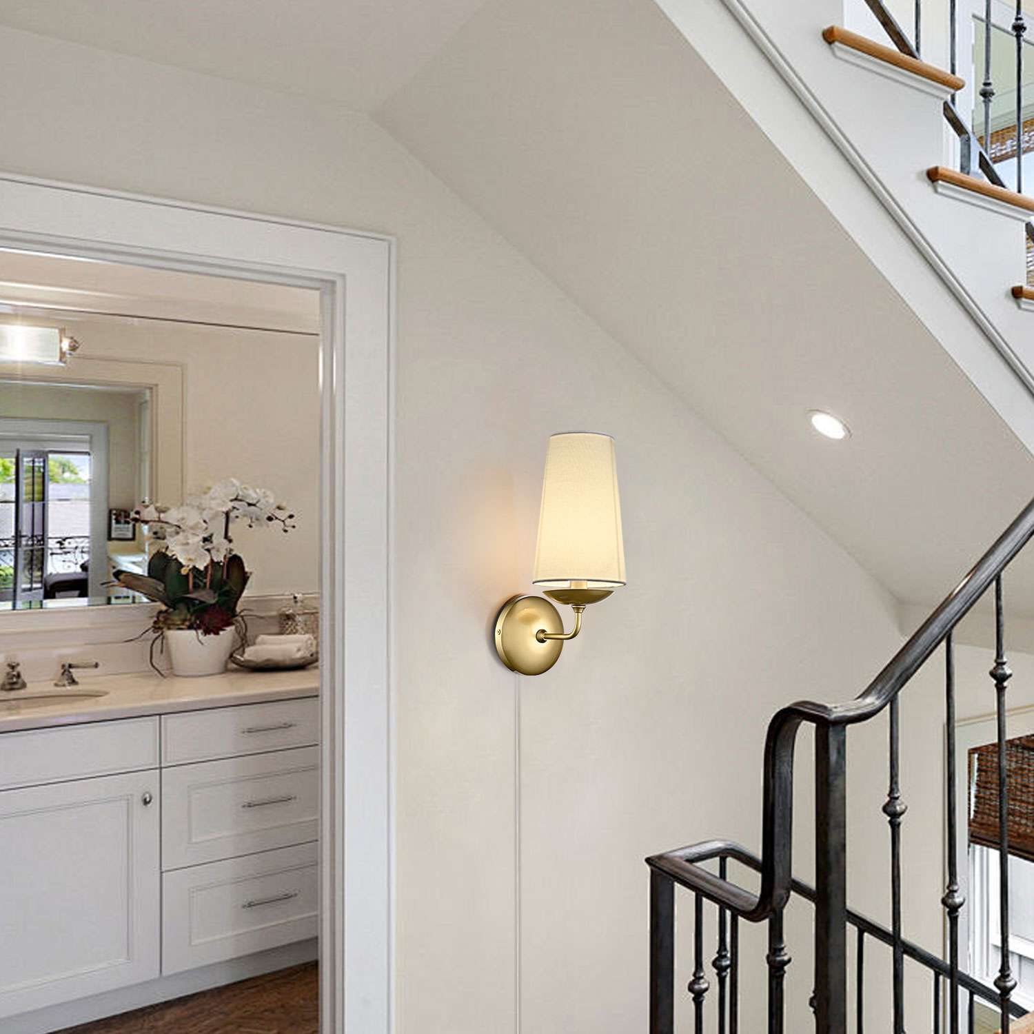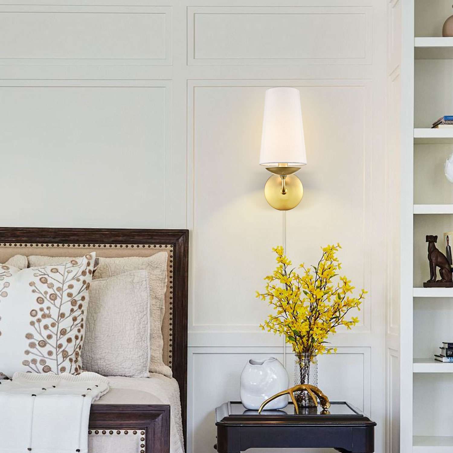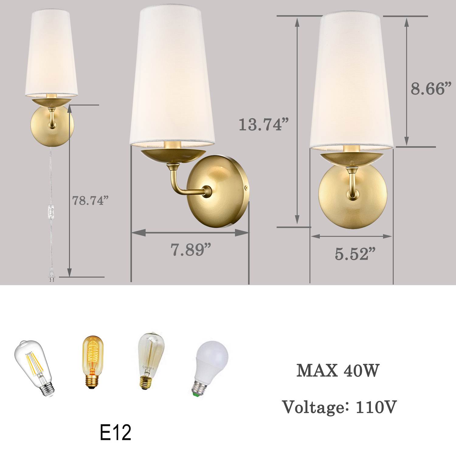 The gold plug-in wall sconces’ canopies, lamp holders, and arms flaunt a rustproof shiny gold finish, sprucing up your interior with a bit of metallic pizzazz. Their elongated white linen cone shades cast an enchanting aura of elegance and make for a tasteful statement in your home. The light pouring through the linen lampshades is gently muted and fills the room without any glare. Their white linen cone shades contrast the gold finish and add alluring visual interest to the living area. Each wall sconce comes with a 78.74-inch plug-in cord. The switches on the plug-in cords are just on/off switches without a dimming function.