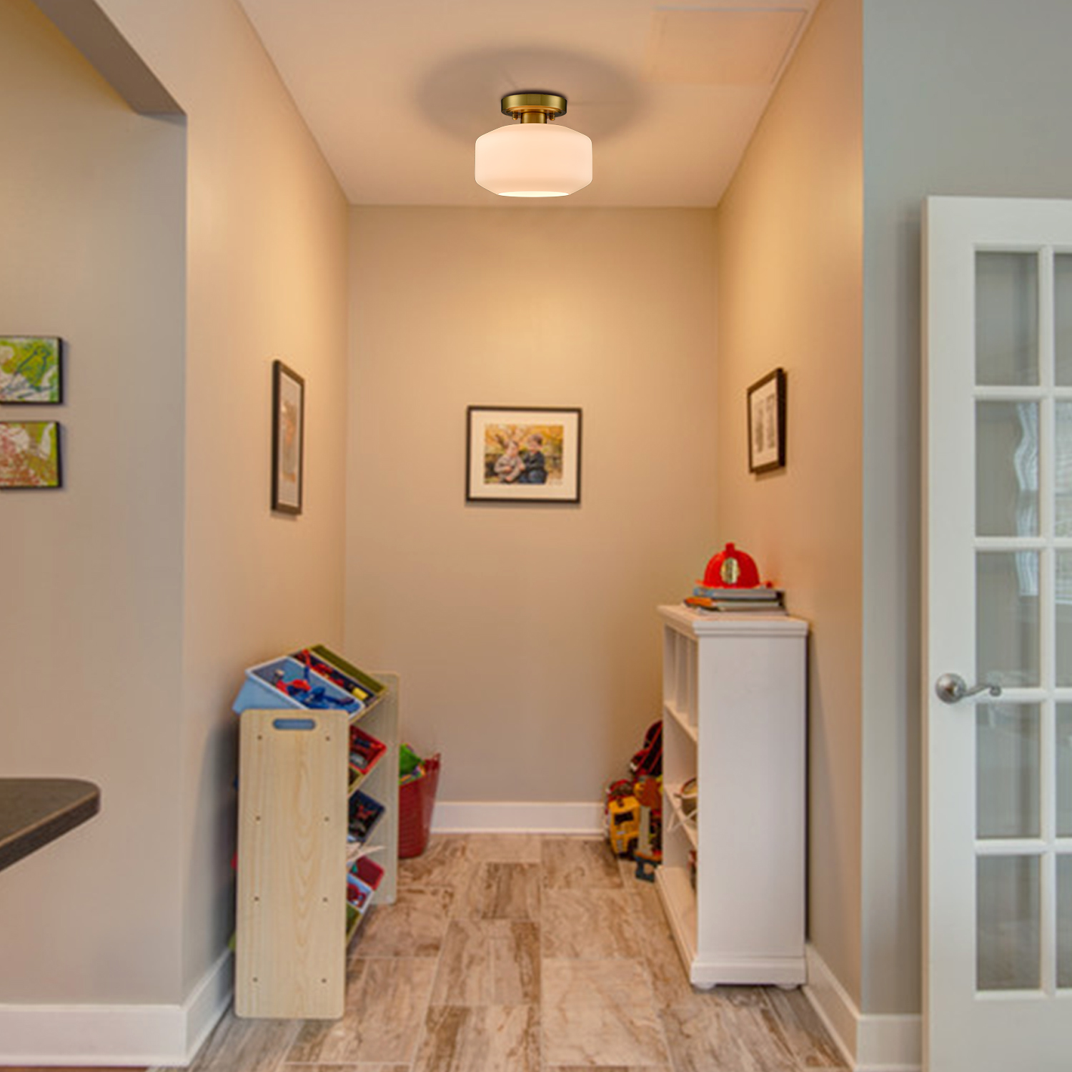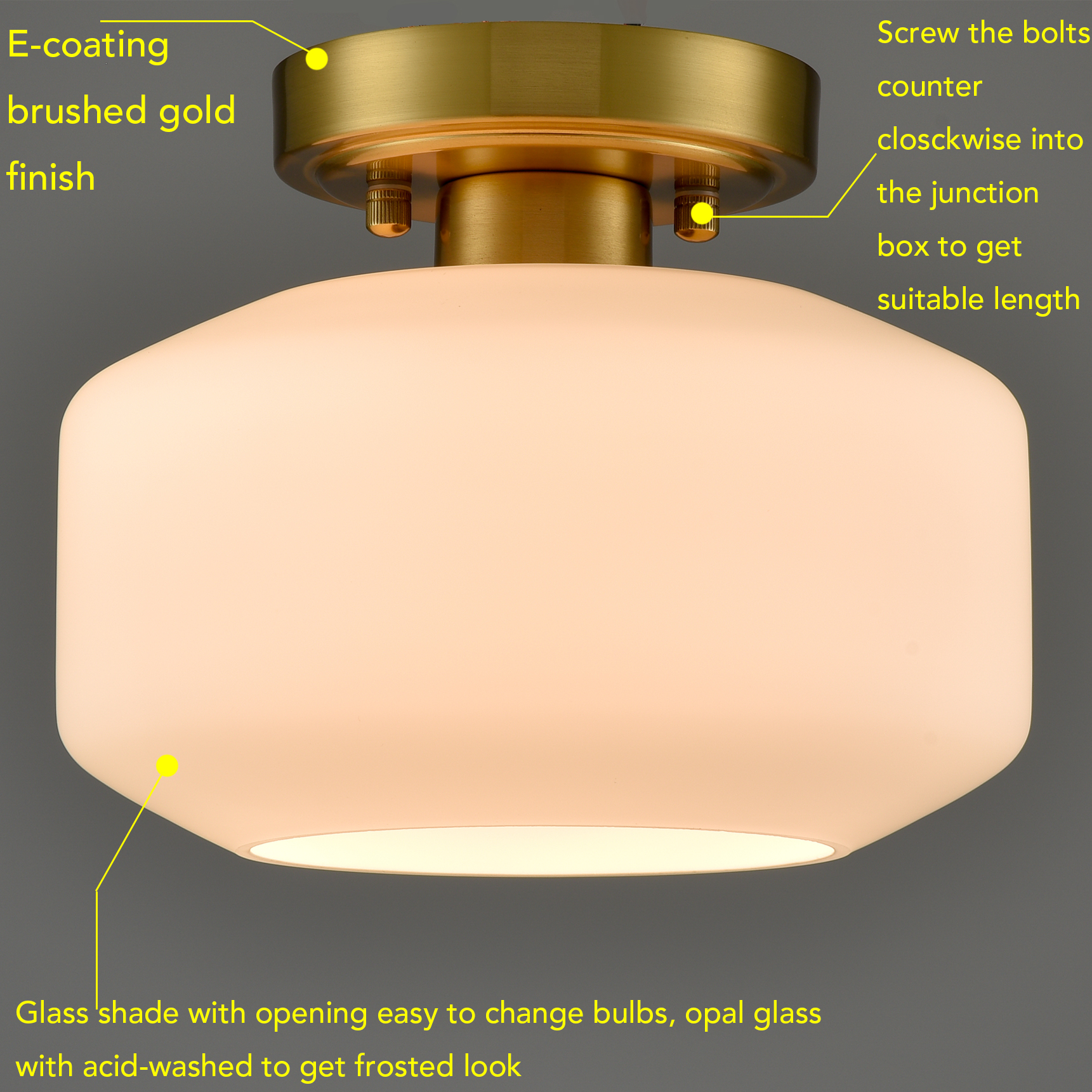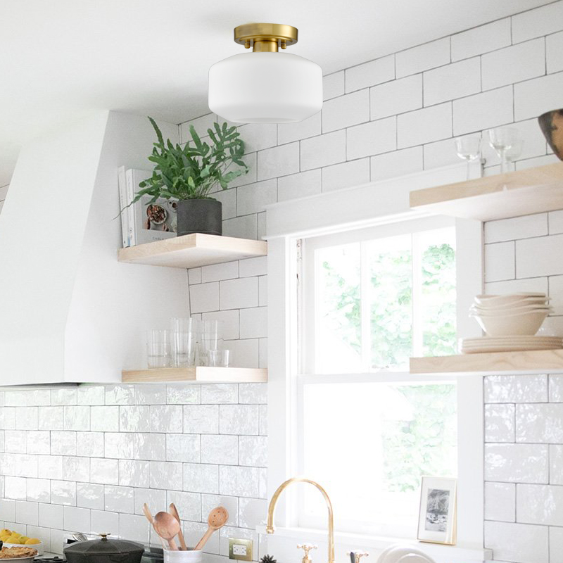 The modern semi flush ceiling light's canopy and lamp-holder are coated in a shimmery electrophoretic brass finish, pepping up your space with metallic pizzazz. Crafted from impurity-free hand-blown opaque opal glass, it provides the perfect blend of mid-century classic and modern elements. Its shimmery brass finish contrasts the opal glass shades and adds alluring visual interest to the space. It can be used to provide both function and style in your bedroom, entryway, foyer, hallway, and kitchen.
