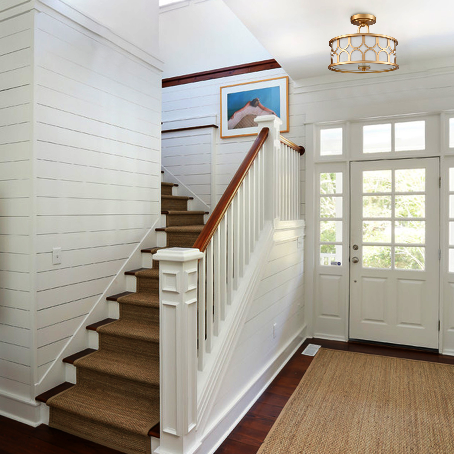 I recently installed this light in my entryway, and I couldn't be happier with the results. The fixture's elegant design and warm gold finish add a touch of sophistication to the space. The double drum lamp shade, with its combination of a gold hollow metal shade on the outside and a white linen shade on the inside, creates a beautiful contrast that enhances the overall aesthetic.One of the standout features is the high-quality gold-painted lamp frame and the thickened tempered frosted glass diffusion plate. The frosted glass diffuser provides a soft, even light that is perfect for creating a cozy atmosphere. The light emitted is bright enough to illuminate the room effectively but not so harsh that it feels overwhelming.The installation was straightforward and hassle-free. The fixture comes with all the necessary hardware and clear instructions, making it easy to set up even for someone with limited DIY experience. The E26 base and compatibility with dimmer switches (though dimmers are not included) offer flexibility in adjusting the light intensity to suit different moods and occasions.Overall, this light is a fantastic addition to my home. Its classic yet modern design, combined with its high-quality construction and ease of installation, make it a worthwhile investment. Whether you're looking to update your hallway, bedroom, living room, porch, or entryway, this fixture is a versatile and stylish choice.