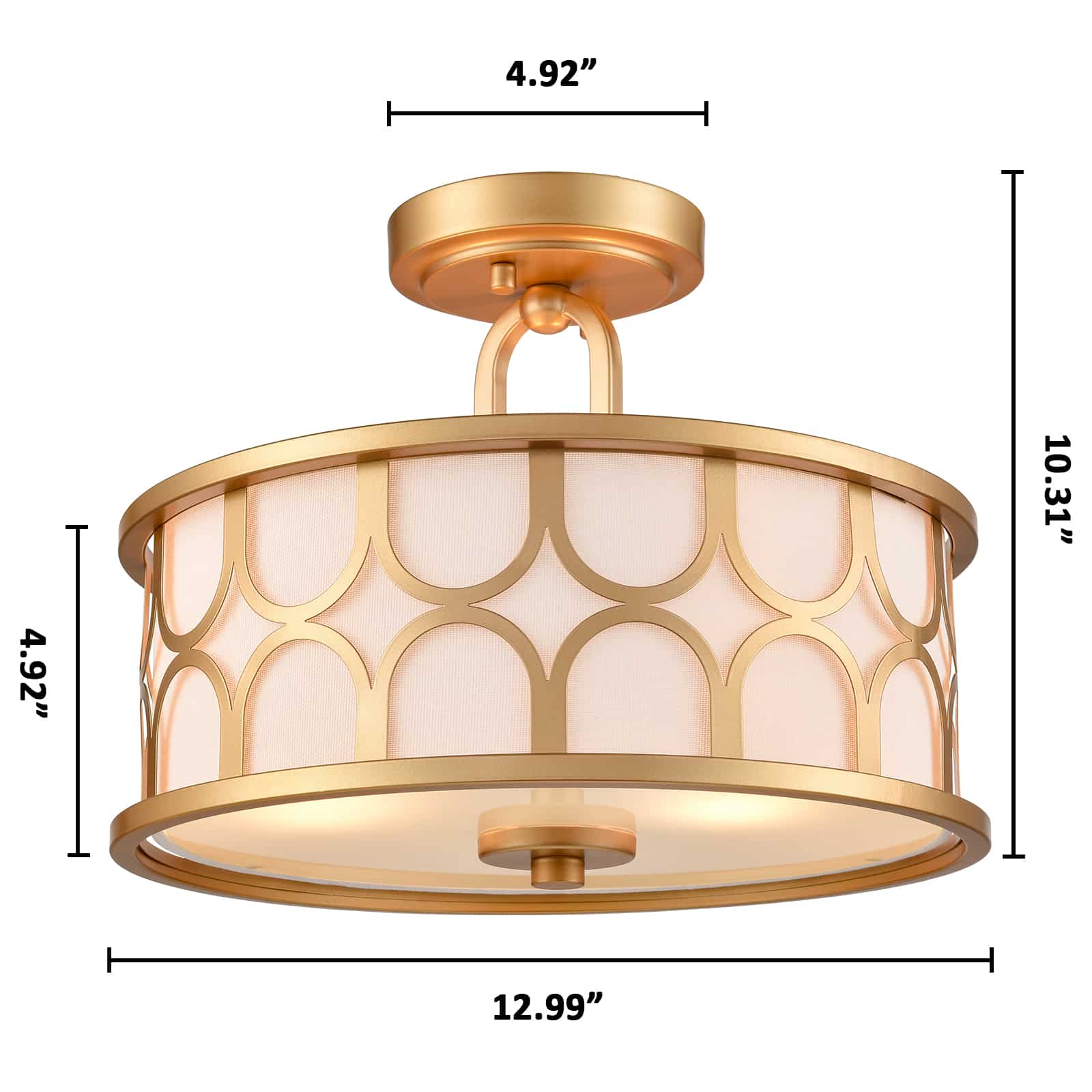 The gold semi flush mount ceiling light boasts a gold finish, sprucing up your living space with a touch of shimmer. It doubles up on the drum shades, creating layers of nuanced light. Its inner fabric drum shade is encircled and protected by a bigger metal drum shade featuring linked arches, adding a ton of eye appeal to the scene. The light pouring through the fabric lampshade is gently muted and fills the room without any glare. It comes with a diffuser crafted of tempered frosted glass. Its lamp holders and bulbs offer a unique two-way swirl design. Its gold metal cage contrasts the creamy white fabric shade and adds alluring visual interest to the space with its shiny finish.