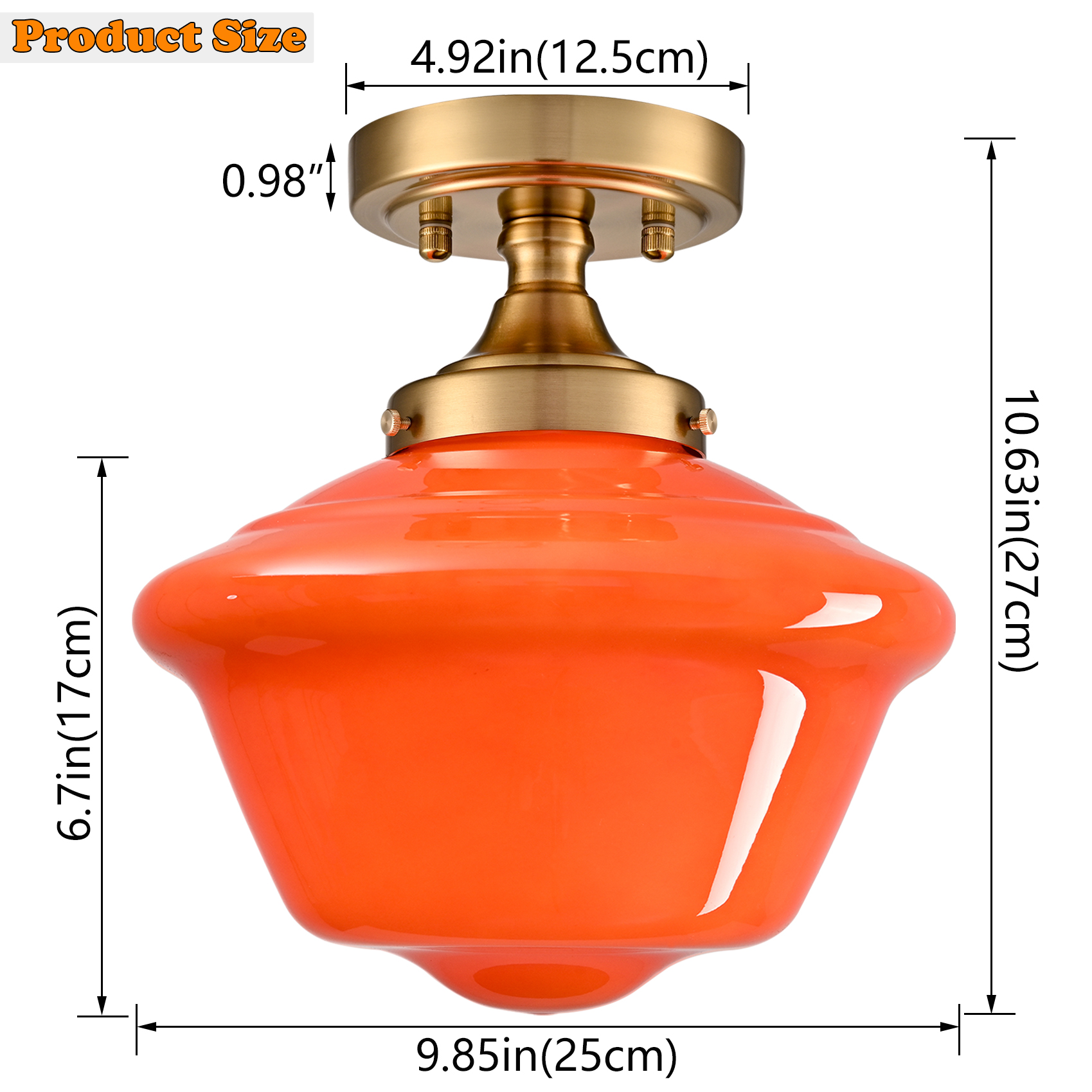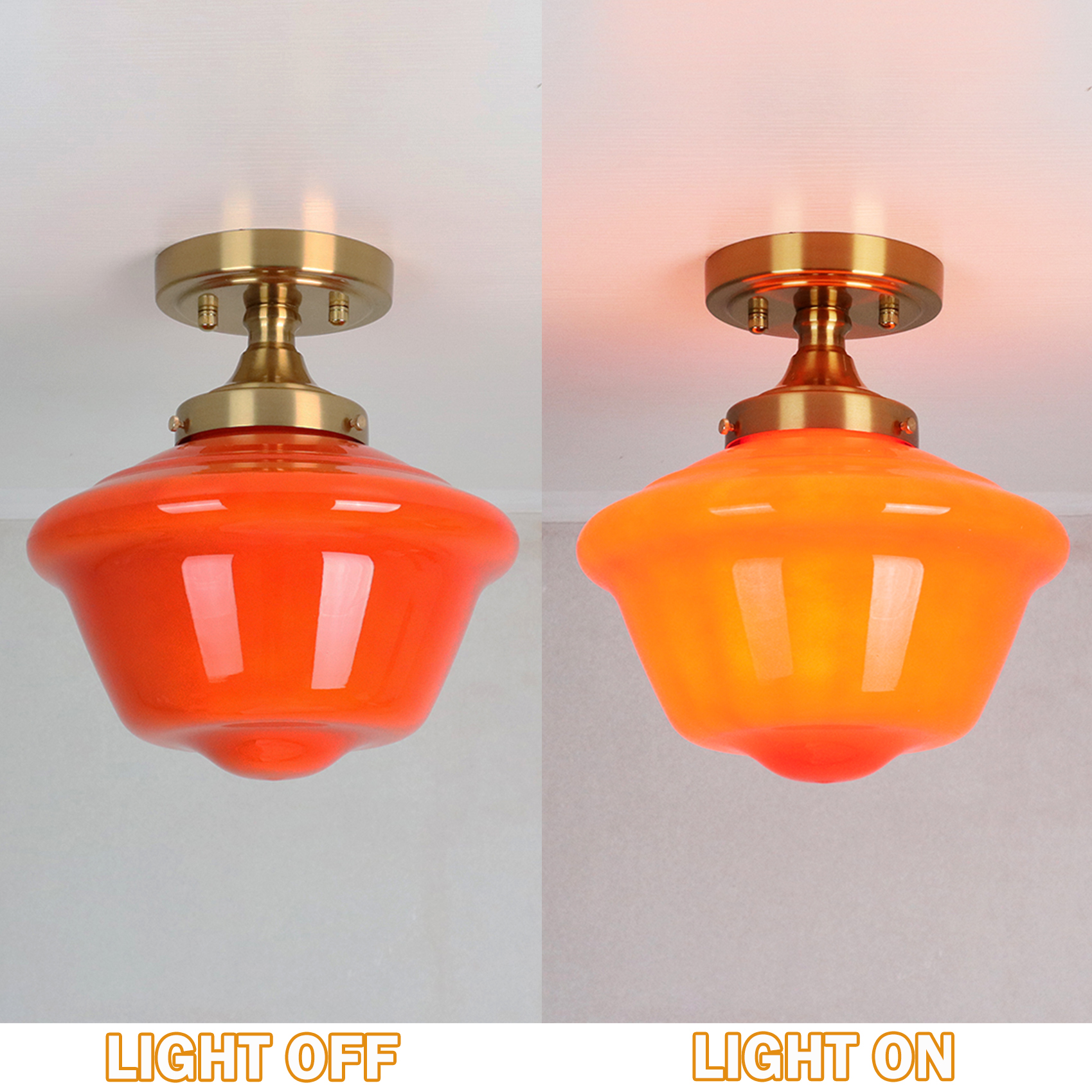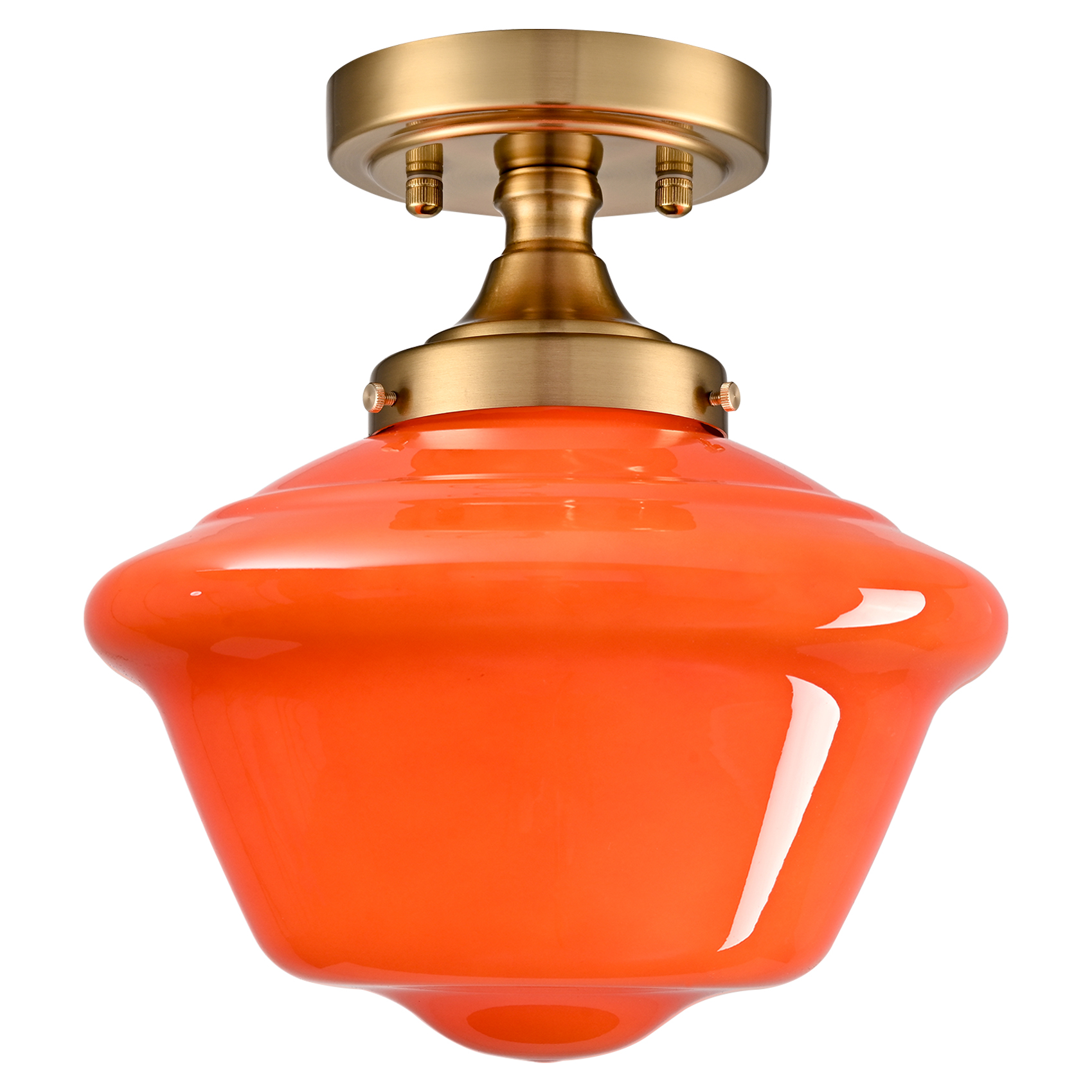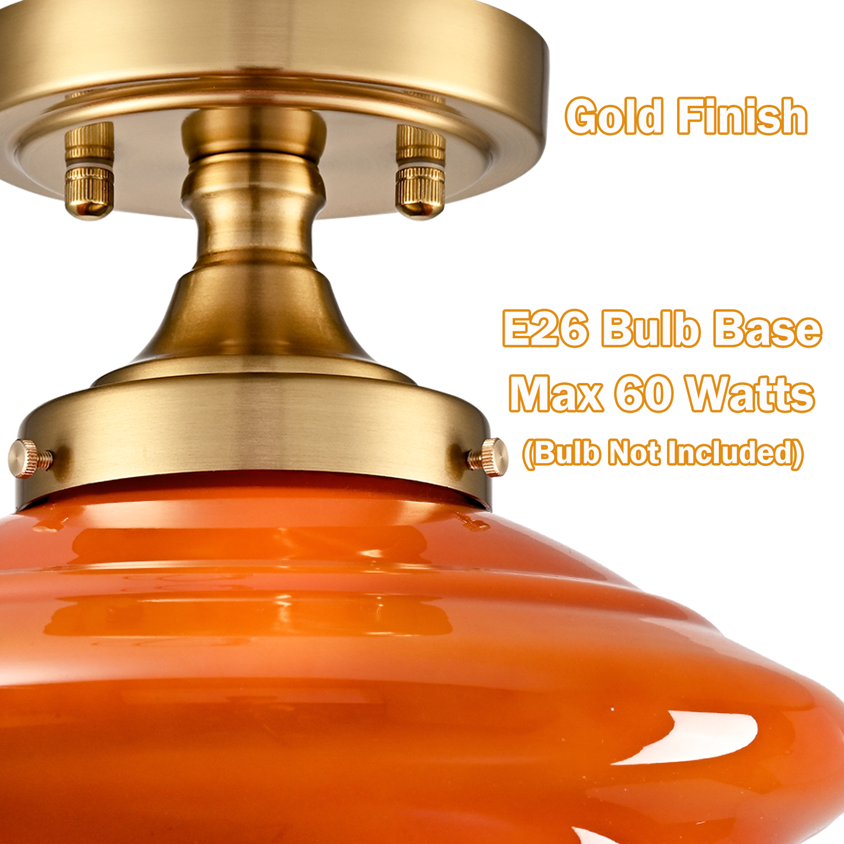 The schoolhouse ceiling light’s canopy and lamp holder showcase an electrophoretic gold finish, livening up your space with glitzy sparkle. Crafted of impurity-free hand-blown glass, its schoolhouse-inspired lampshade flaunts an orange finish. Its mix of finishes encompasses both a dash of drama and a ton of eye appeal, yet maintains a touch of modernity. Its orange lampshade gives your home a snappy look and a glamorous, refreshing vibe. Being a beautifully-detailed glasswork, it looks like a special bell shade with soft curves. It generates an elegant look that will impress. Its gold finish contrasts with the orange glass shade and adds alluring visual interest to the living area.
