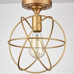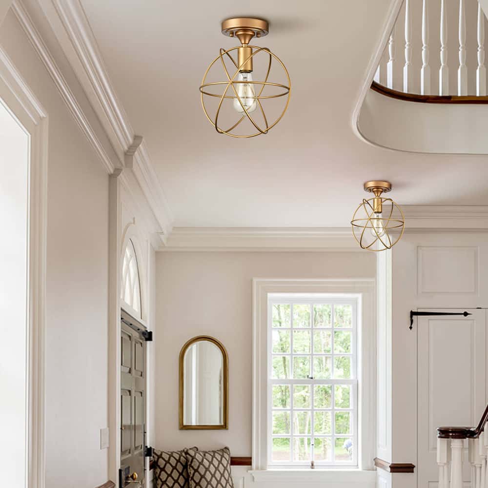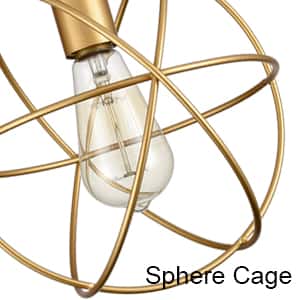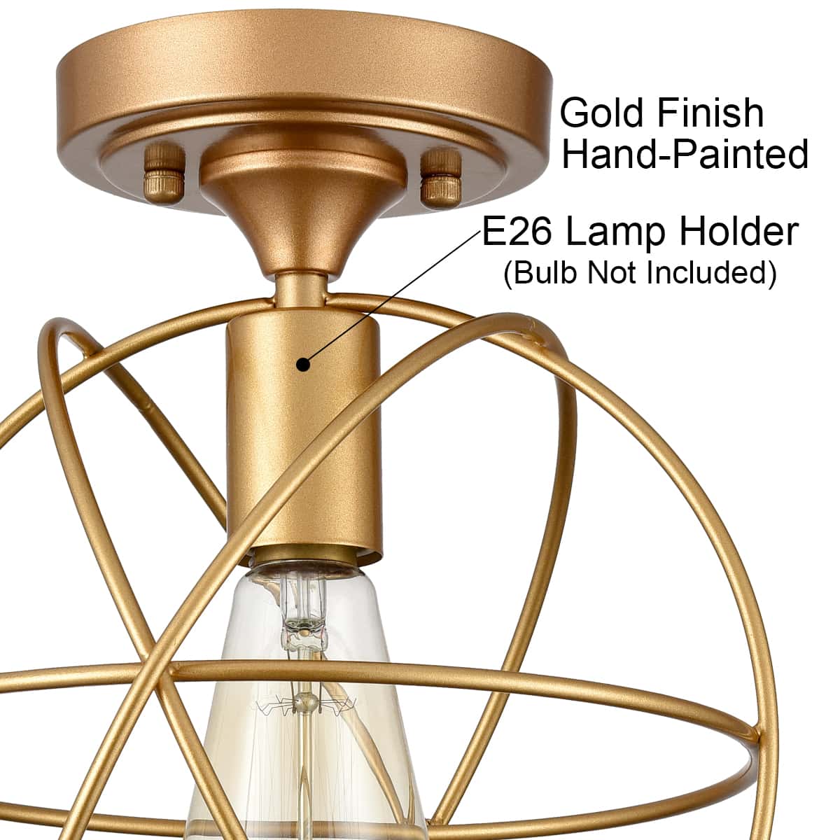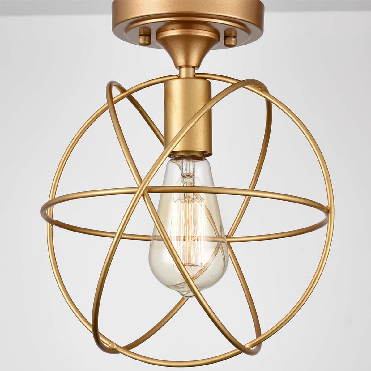 Sporting a rustproof shimmery gold finish, the spherical ceiling light fixture stands out and shines on its own with its glossy accent. Its spherical shade crafted of metal wires flaunts an atom-inspired design structure that crisscrosses and weaves to surround a bulb, showcasing the beauty of geometry. Its open cage design allows the light to pass right through and creates intriguing light effect and shades.