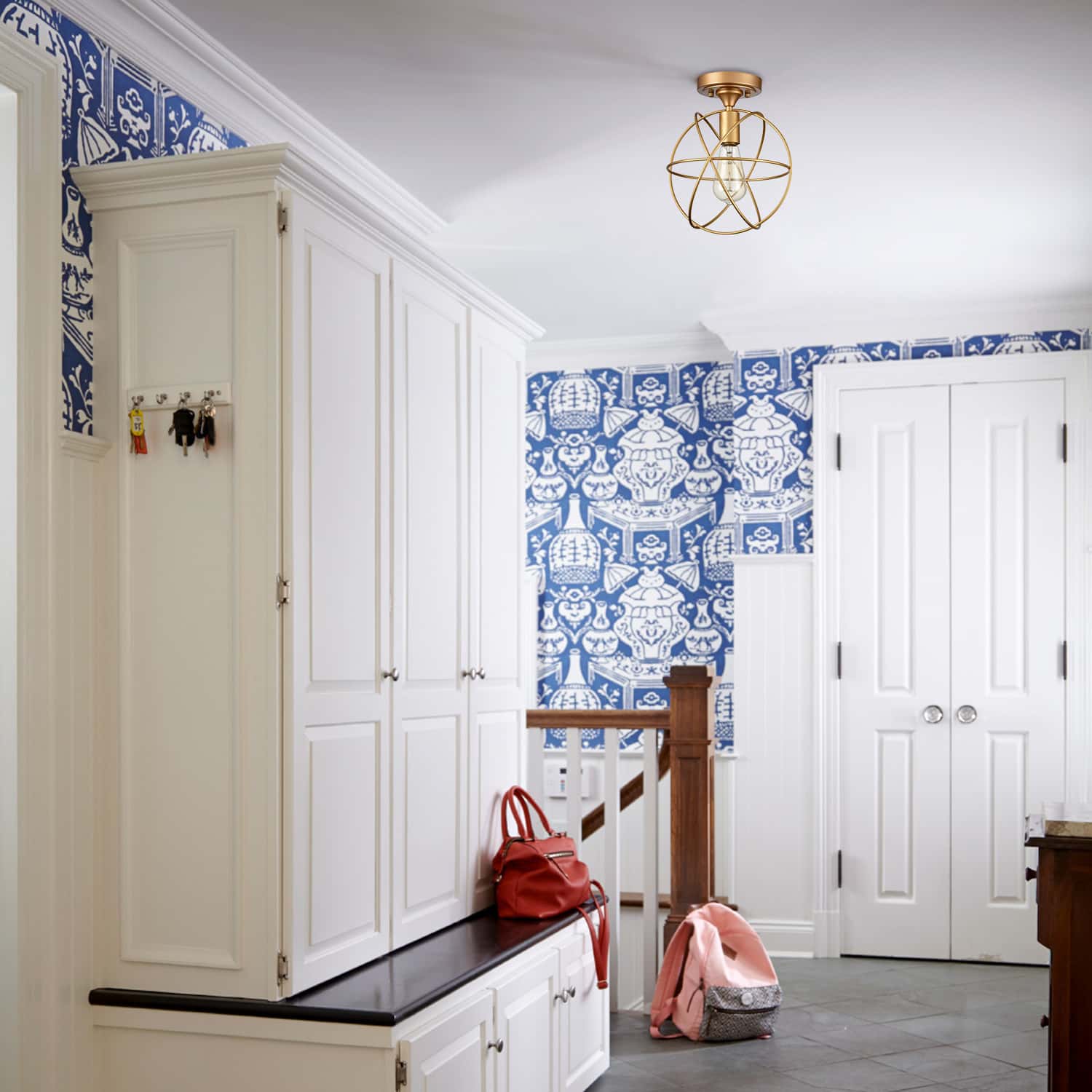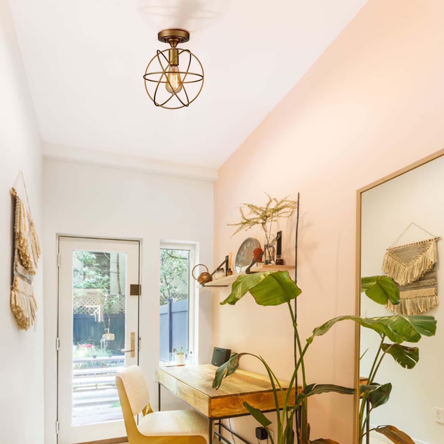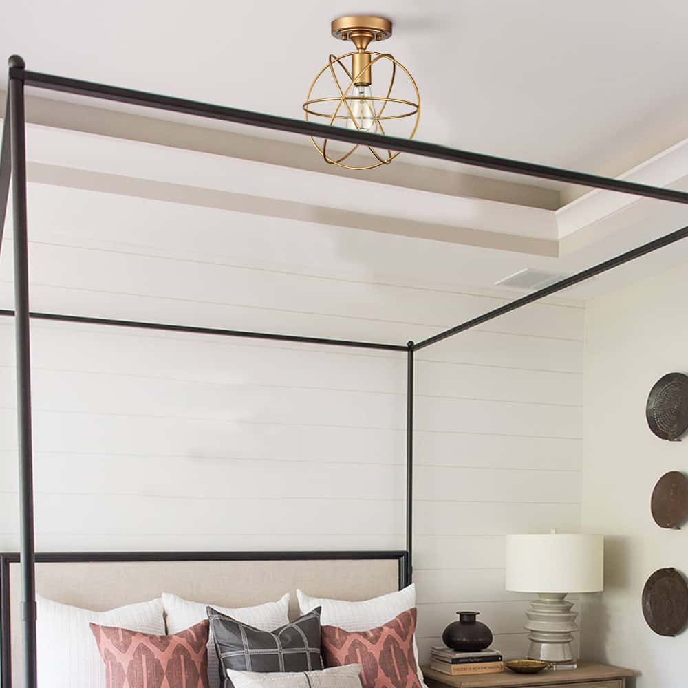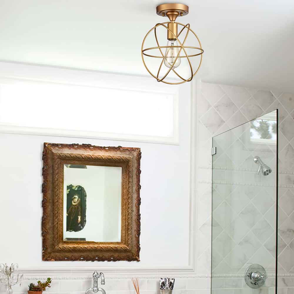 Sporting a rustproof shimmery gold finish, the spherical ceiling light fixture stands out and shines on its own with its glossy accent. Its spherical shade crafted of metal wires flaunts an atom-inspired design structure that crisscrosses and weaves to surround a bulb, showcasing the beauty of geometry. Its open cage design allows the light to pass right through and creates intriguing light effect and shades.