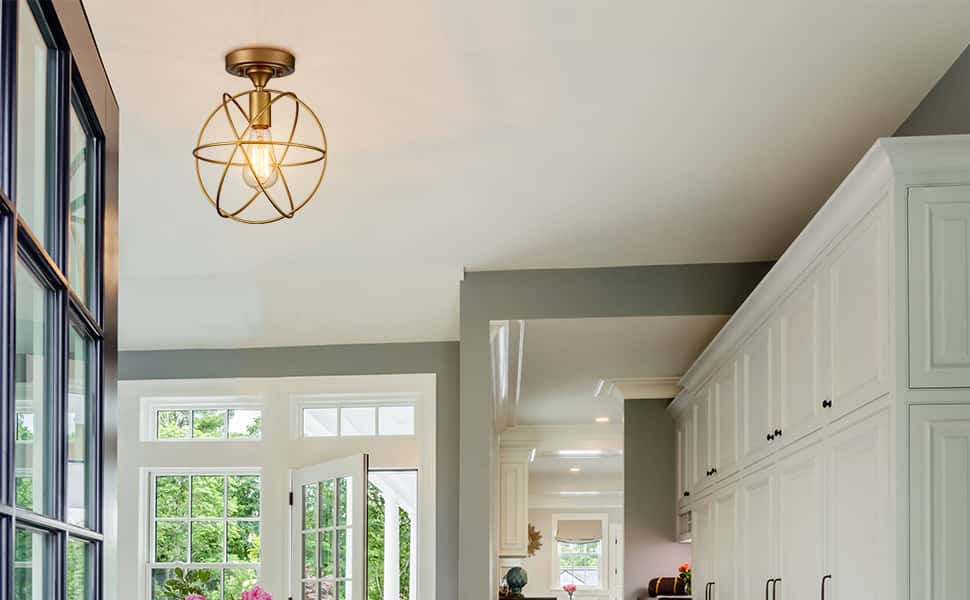 Sporting a rustproof shimmery gold finish, the spherical ceiling light fixture stands out and shines on its own with its glossy accent. Its spherical shade crafted of metal wires flaunts an atom-inspired design structure that crisscrosses and weaves to surround a bulb, showcasing the beauty of geometry. Its open cage design allows the light to pass right through and creates intriguing light effect and shades.