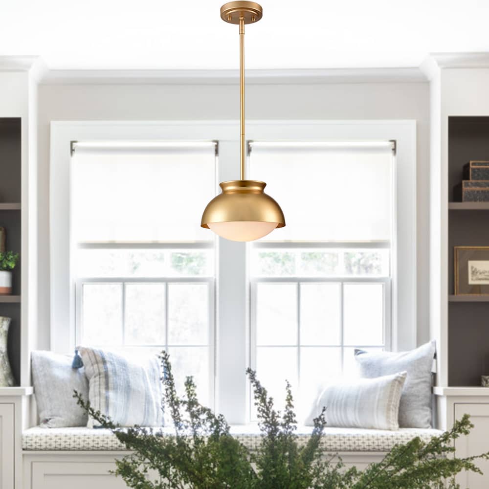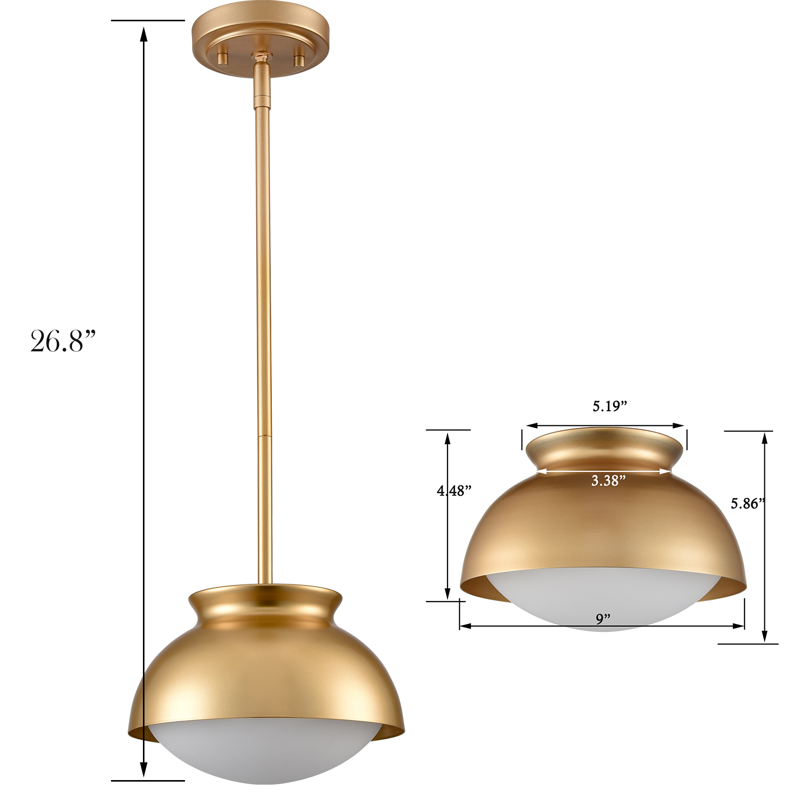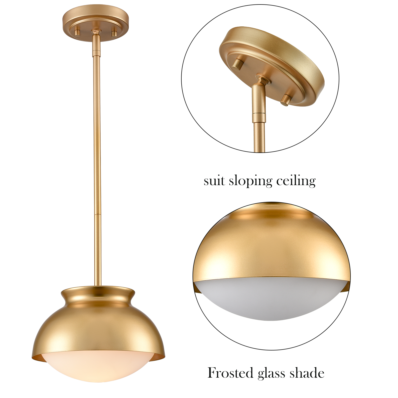 The gold vintage pendant light's canopy and outer metal dome shade boast a rustproof gold finish, enlivening your interior with a glint of glamour. Crafted of hang-blown milk glass, its inner glass dome shade rounds out the design and elevates your interior with a graceful touch. It doubles up on the dome shades, creating layers of nuanced light. Its inner milk glass shade is encircled and protected by a bigger gold metal shade, boasting elegant geometry and adding a ton of eye appeal to the scene. It is sloped ceiling adaptable and comes with three 12-inch rods and one 6-inch rod.