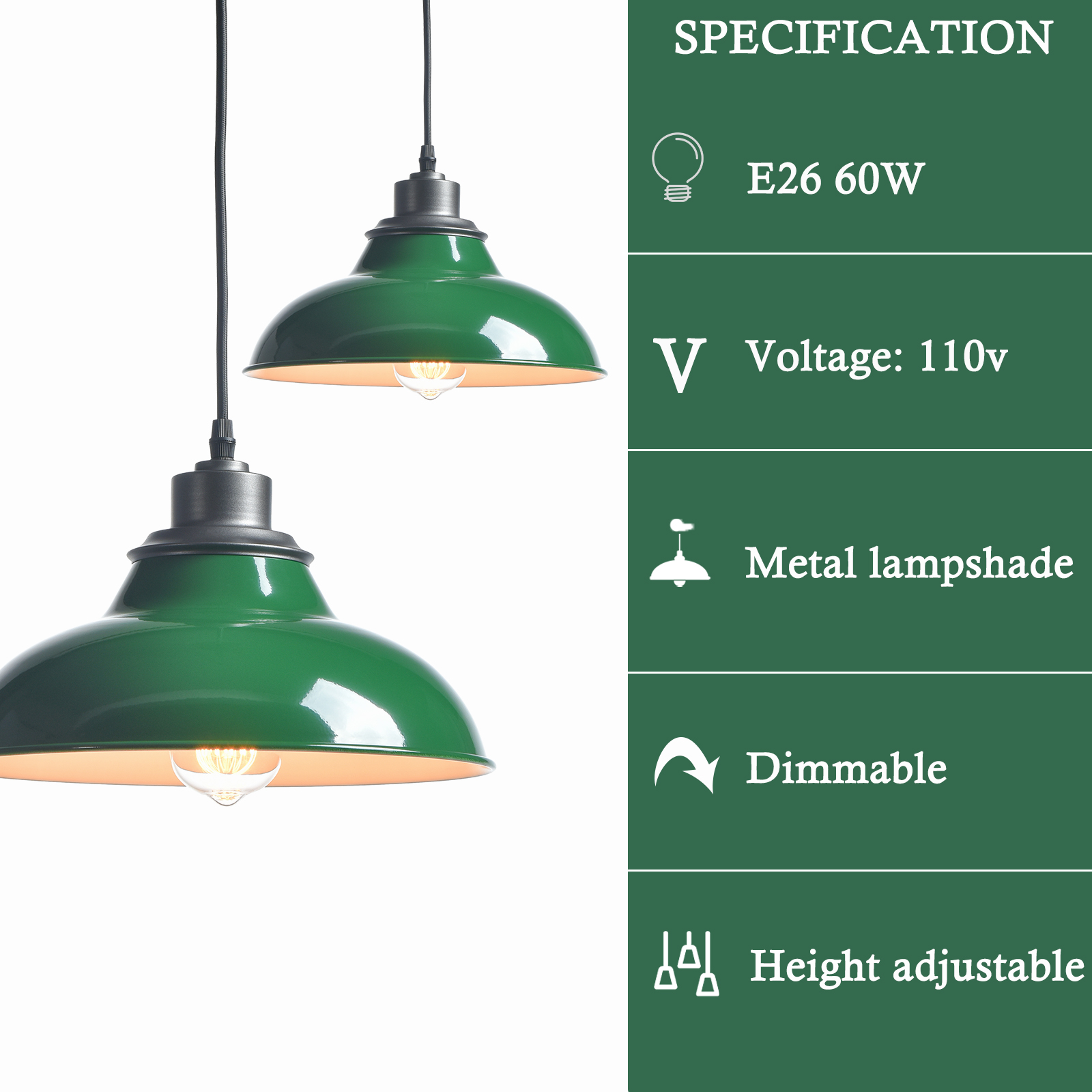 The green pendant light fixture’s canopy and lamp holder are coated in a dark gray finish while its dome shade flaunts a green finish. The dome shade boasts a white interior to maximize reflectivity. Its mix of finishes encompasses both a dash of drama and a touch of modernity, yet maintains an industrial edge. Its green lampshade gives your home a snappy look and a glamorous, refreshing vibe. It sports a durable green finish and a dome shade to bring a bit of factory-inspired elements to your living space. Its dark gray finish offers a stark contrast to the green finish and adds alluring eye appeal to the interior. It comes with a 49.21-inch adjustable fabric cord.