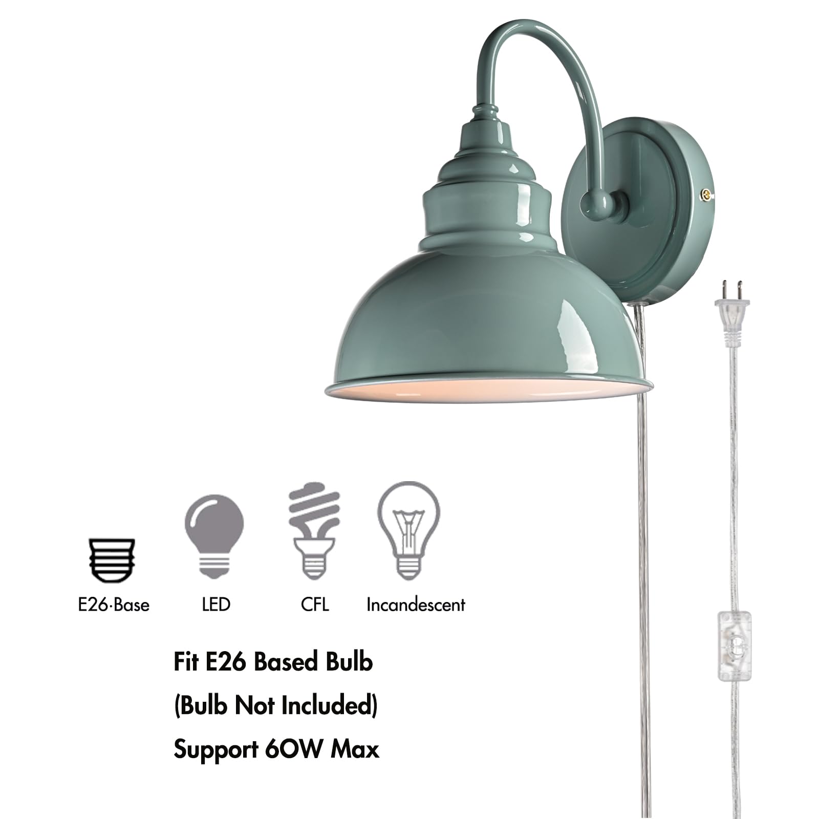 The wall sconce comes with 1 E26-base socket, which is compatible with a variety of bulb types: LED, INCANDESCENT, CFL.
