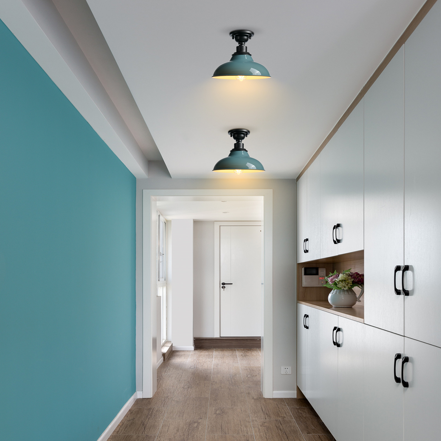 The industrial barn ceiling light fixtures’ canopies and lamp holders are coated in a dark gray finish, while their barn shades flaunt a pale turquoise finish on the exterior and a white finish on the interior. Their mix of finishes encompasses both a dash of drama and a touch of rusticity, yet maintains an industrial edge. Their pale turquoise lampshades give your home a snappy look and a glamorous, refreshing vibe. They come with a durable pale turquoise finish and barn shades to bring a bit of factory-inspired elements to your home. Their dark gray finish offers a stark contrast to the pale turquoise finish and the white finish and adds alluring eye appeal to the space.