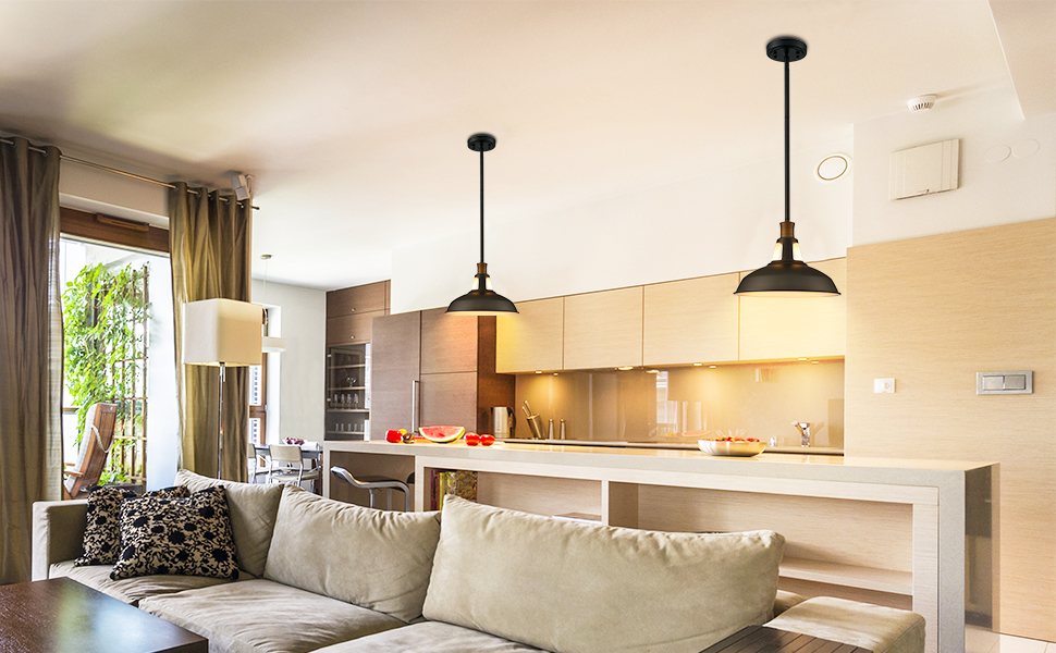 The industrial black barn pendant light’s barn shade boasts a rustproof matte black finish. The lamp holder finished in antique brushed brass spruces up your interior with a glint of glamour. What makes it so unique is the hollow design on the upper part of its lamp holder and you can directly see the bulb through the hollow part. The inner surface of the barn shade flaunts a white finish to to maximize reflectivity. Its mix of finish encompasses both a dash of drama and a touch of glitz, yet maintains a modern edge. It works best in your bar, bedroom, dining room, entryway, foyer, hallway, kids room, kitchen, living room, and stairwell. It comes with three 12-inch rods and one 6-inch rod. Its canopy features an adapter to accommodate sloped or vaulted ceilings.