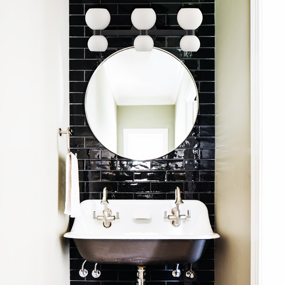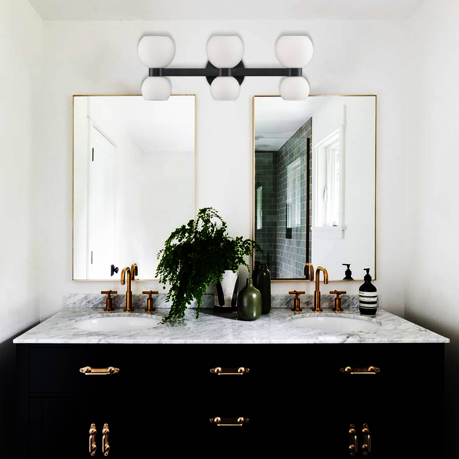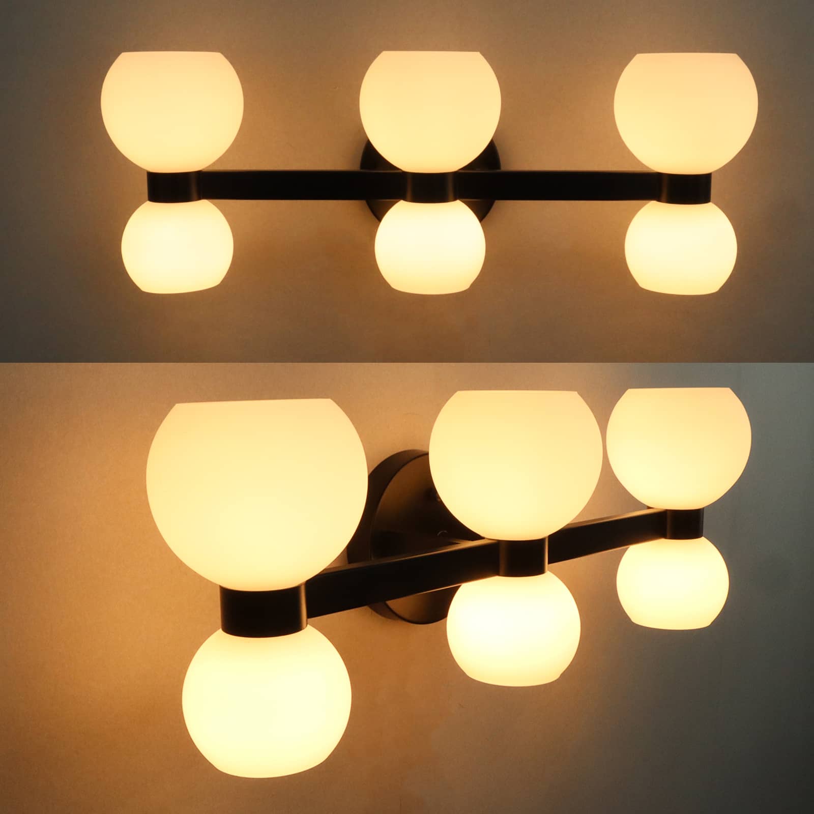 The black bathroom vanity light’s canopies, lamp holders, and arms are accented with a rustproof black finish, giving your living space a touch of urban sophistication. Crafted from impurity-free hand-blown glass, its milk glass shades distribute light evenly to avoid shadows. Its bow-knot-inspired design adds attractive eye appeal and a touch of whimsy to your interior. It is an eye-catching addition to your home with it black-and-white classic color combo. Its milk glass shades contrast the black finish and add alluring visual interest to the living area.