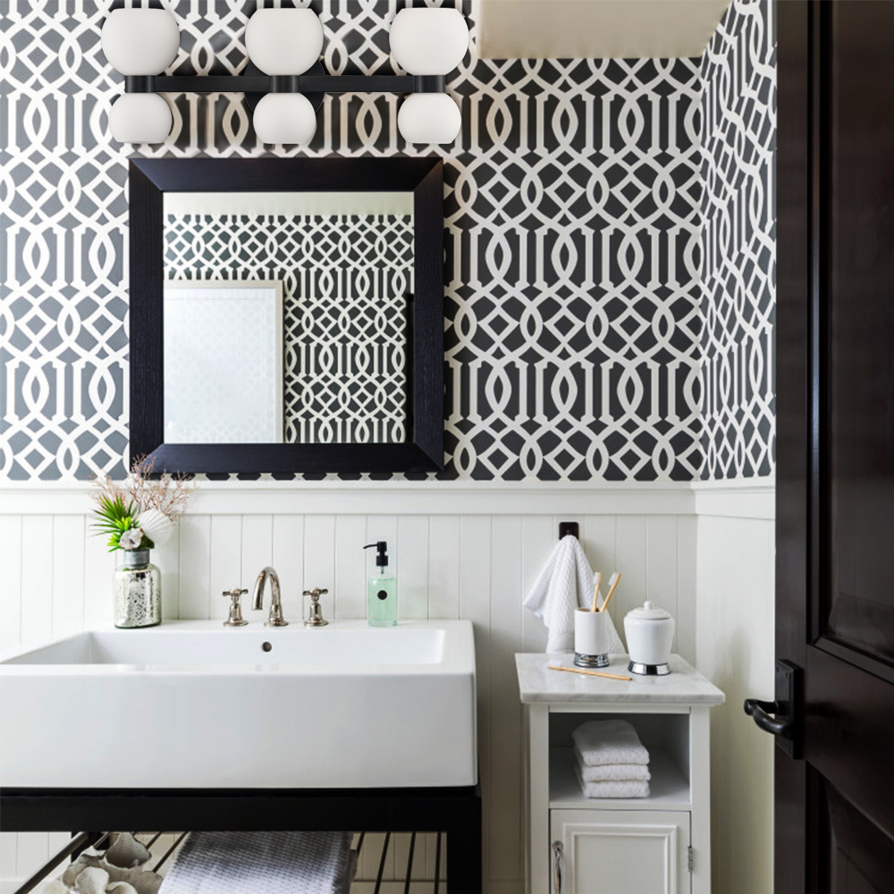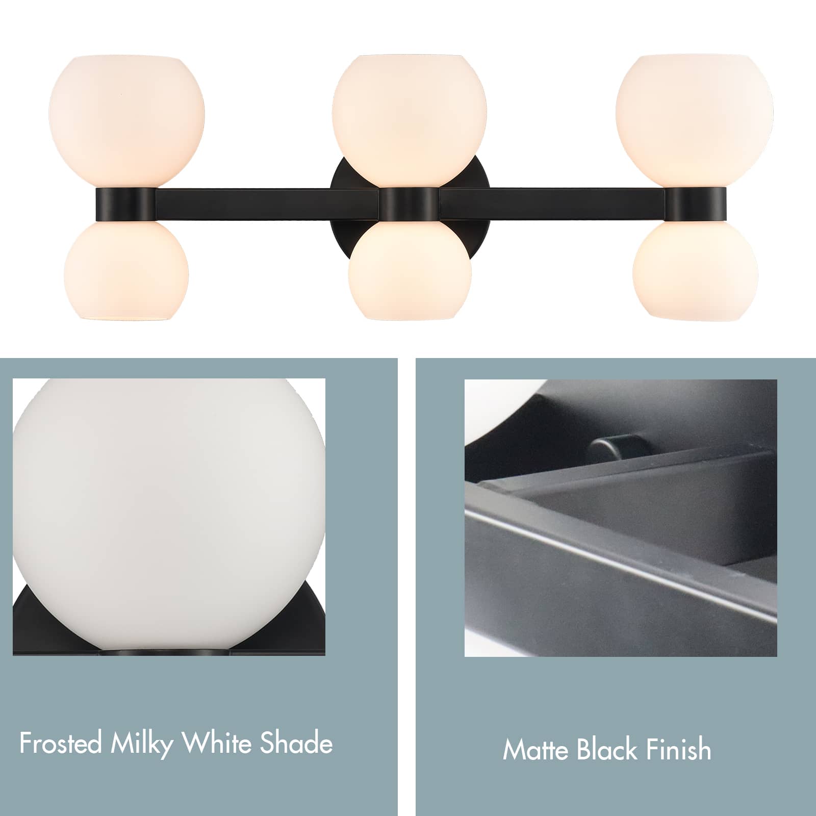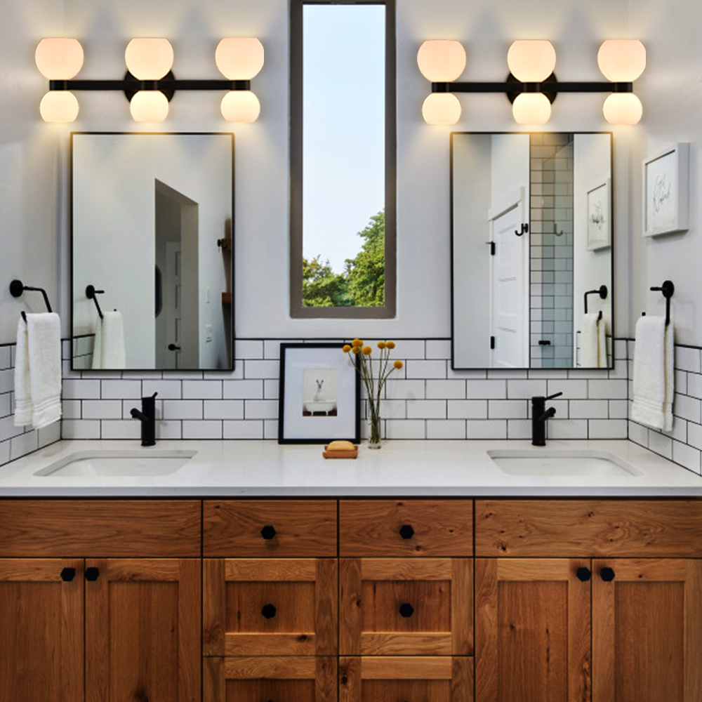 The black bathroom vanity light’s canopies, lamp holders, and arms are accented with a rustproof black finish, giving your living space a touch of urban sophistication. Crafted from impurity-free hand-blown glass, its milk glass shades distribute light evenly to avoid shadows. Its bow-knot-inspired design adds attractive eye appeal and a touch of whimsy to your interior. It is an eye-catching addition to your home with it black-and-white classic color combo. Its milk glass shades contrast the black finish and add alluring visual interest to the living area.