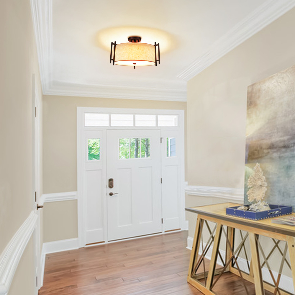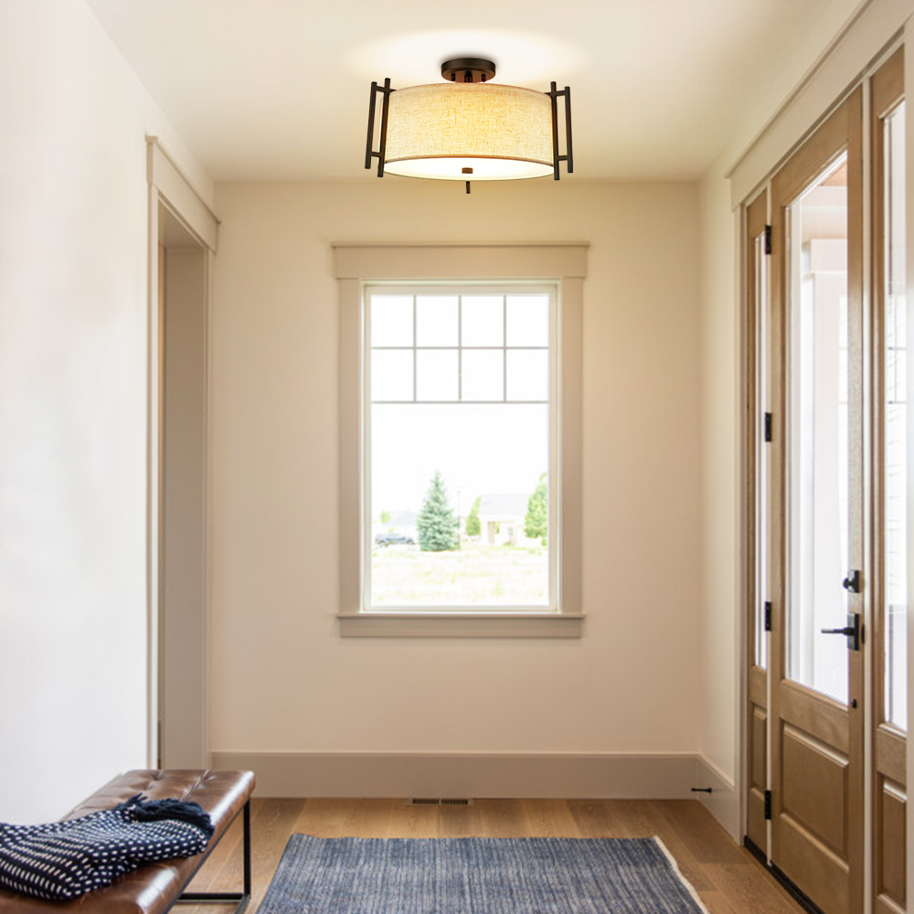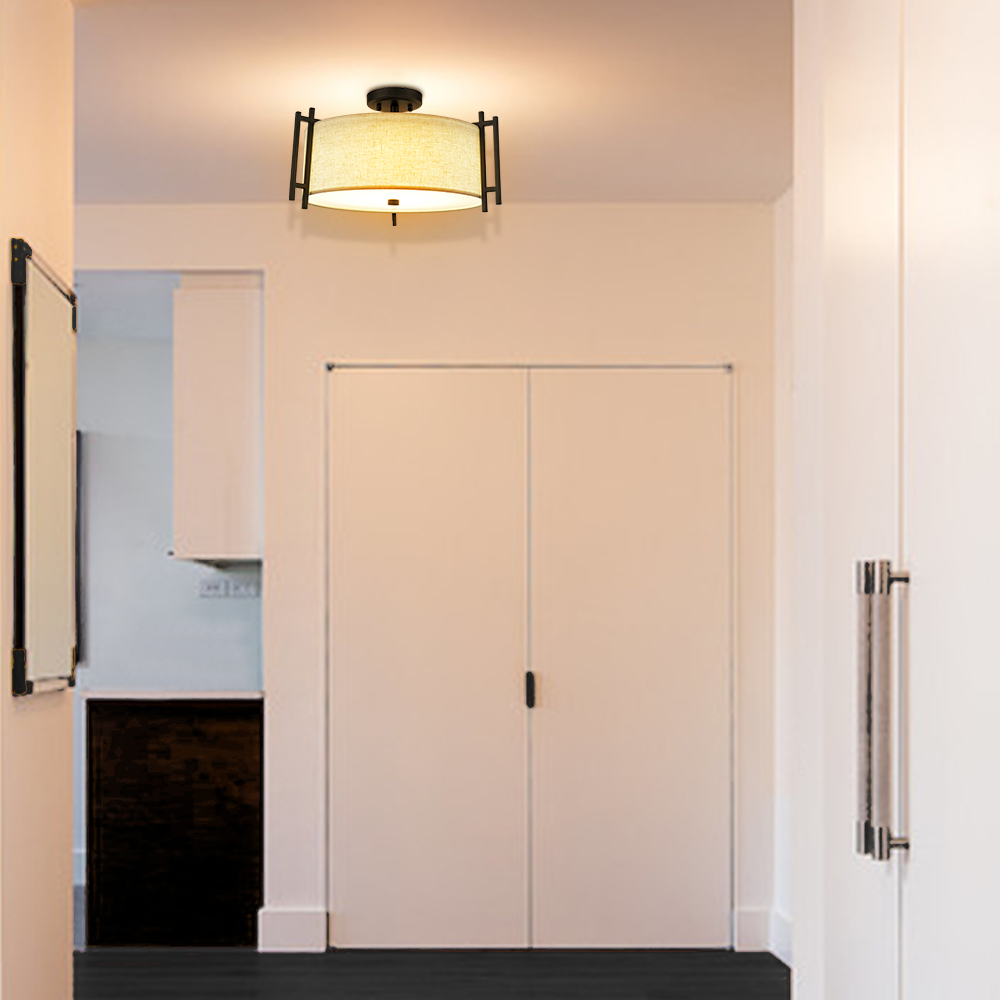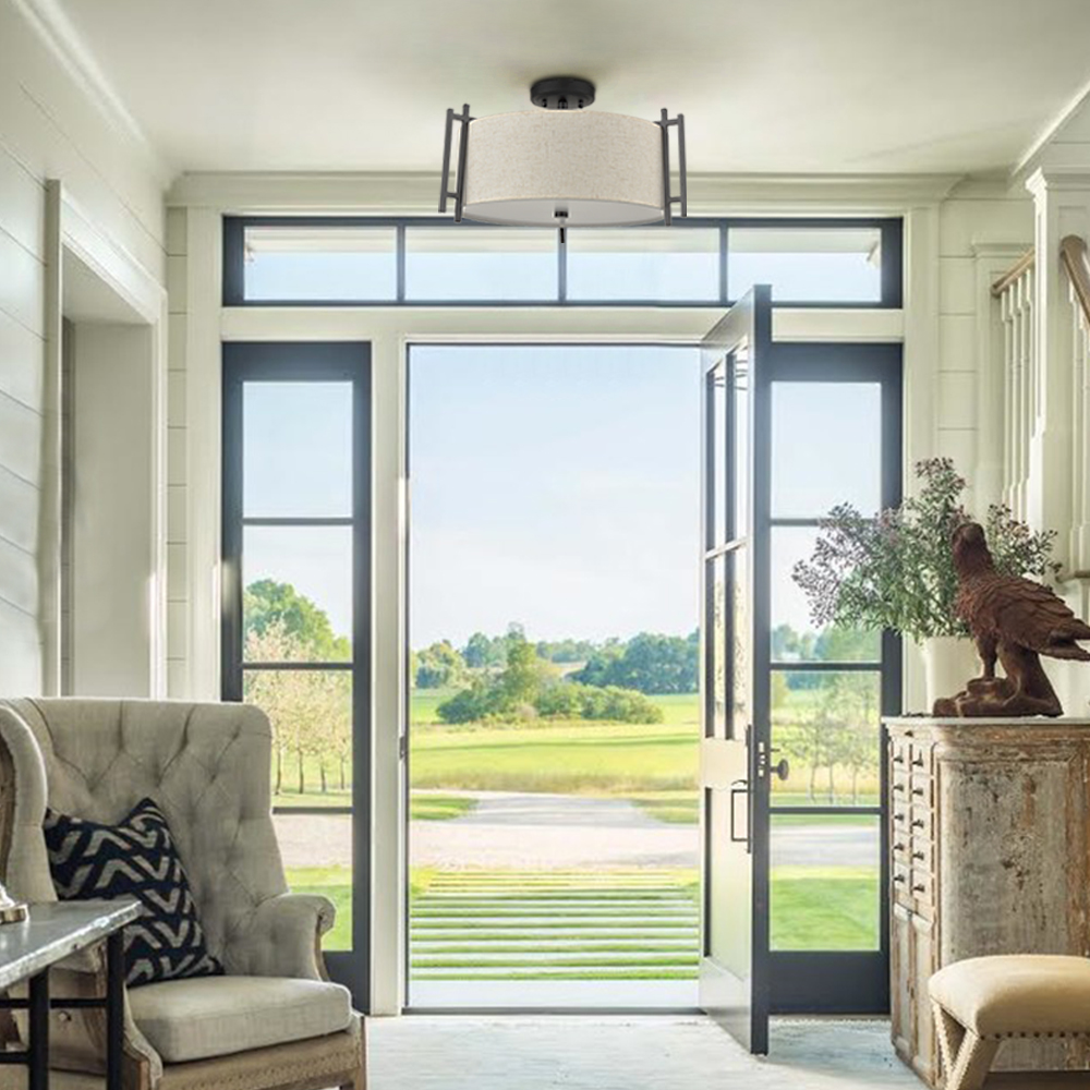 The semi flush mount ceiling light’s canopy, lamp-holder, bottom accent, and metal frame are dressed in a semigloss black finish. The beige drum linen shade is held aloft by a three-pronged metal frame, bringing tasteful details to the interior. Crafted of linen, its drum shade encircles a bulb and conveys an aura of elegance. The light pouring through the fabric lampshade is gently muted and fills the room without any glare.